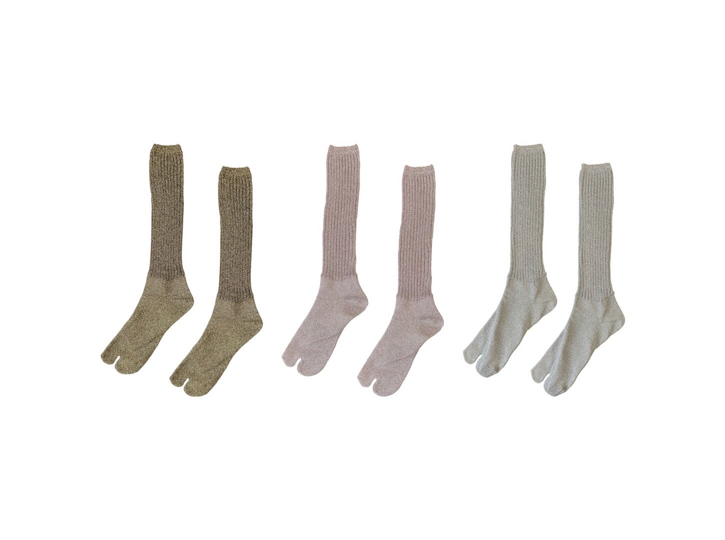 ●足元をすっきり見せる足袋ソックスは、サンダルとの相性も抜群。ラメ糸を使用したさりげないきらめきが華やかさを添え、ゆったりたるませて履くことで立体感とニュアンスのあるスタイルが完成します。