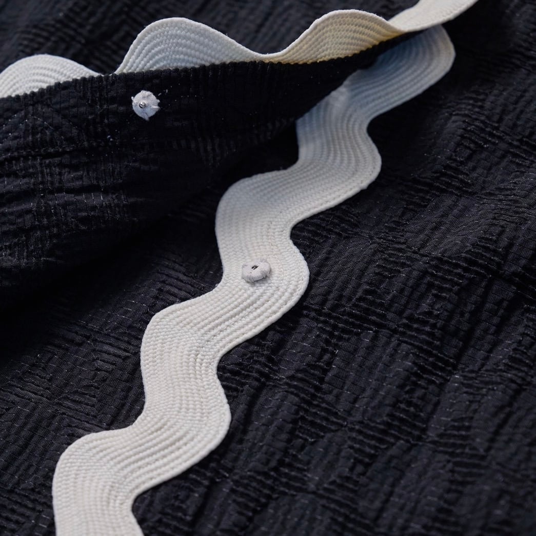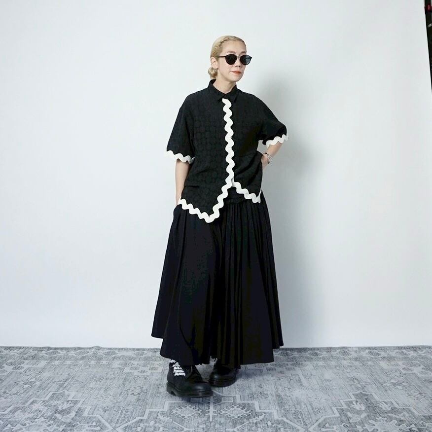 袖口と裾にウエーブしたテープを縫い付けて変化を付けました。フロントボタンはスナップで脱ぎ着しやすくなっています。ブラックは透け感があまりないので安心して着ることができました。陰影で出ているドットの柄も品良く、大好きなデザインになりました。