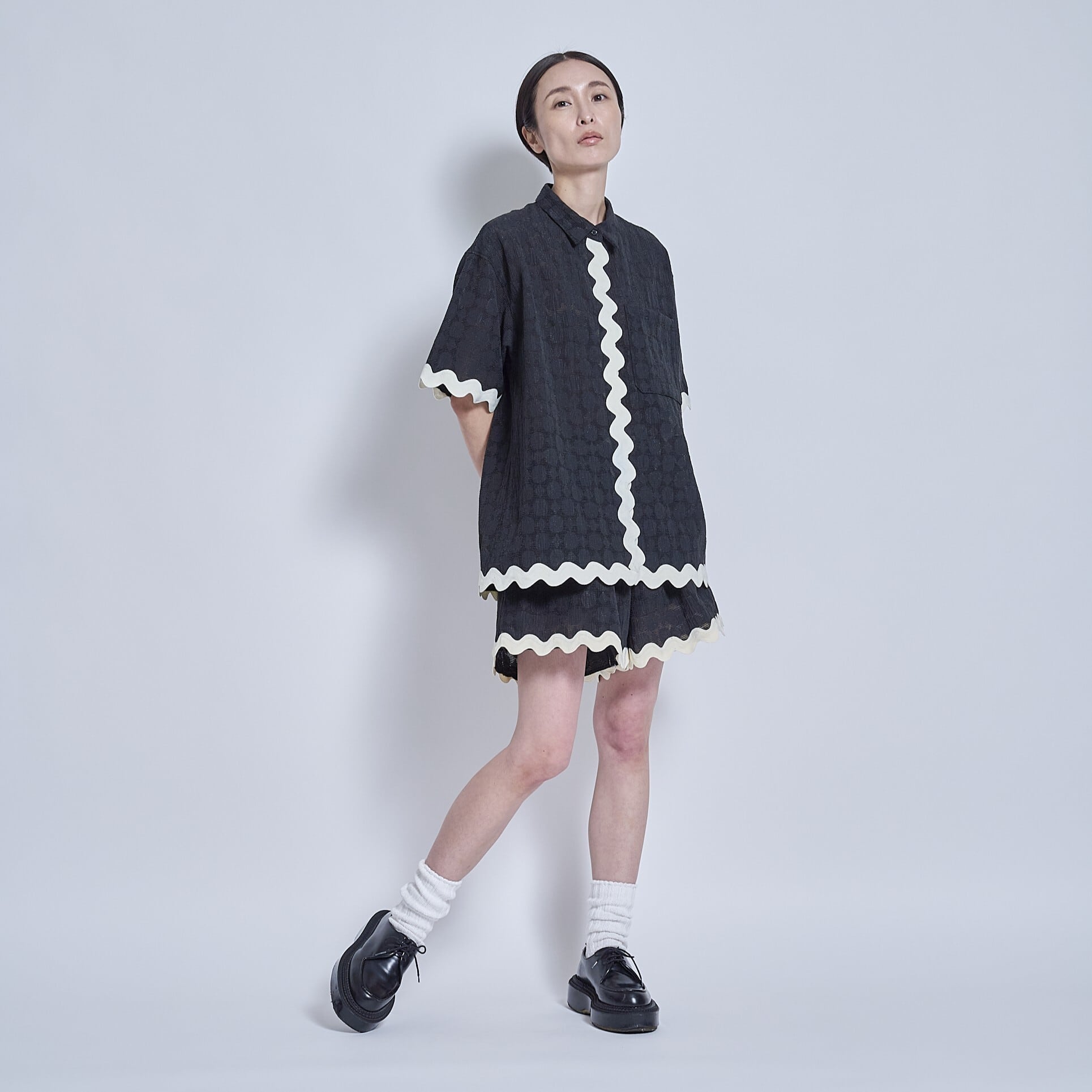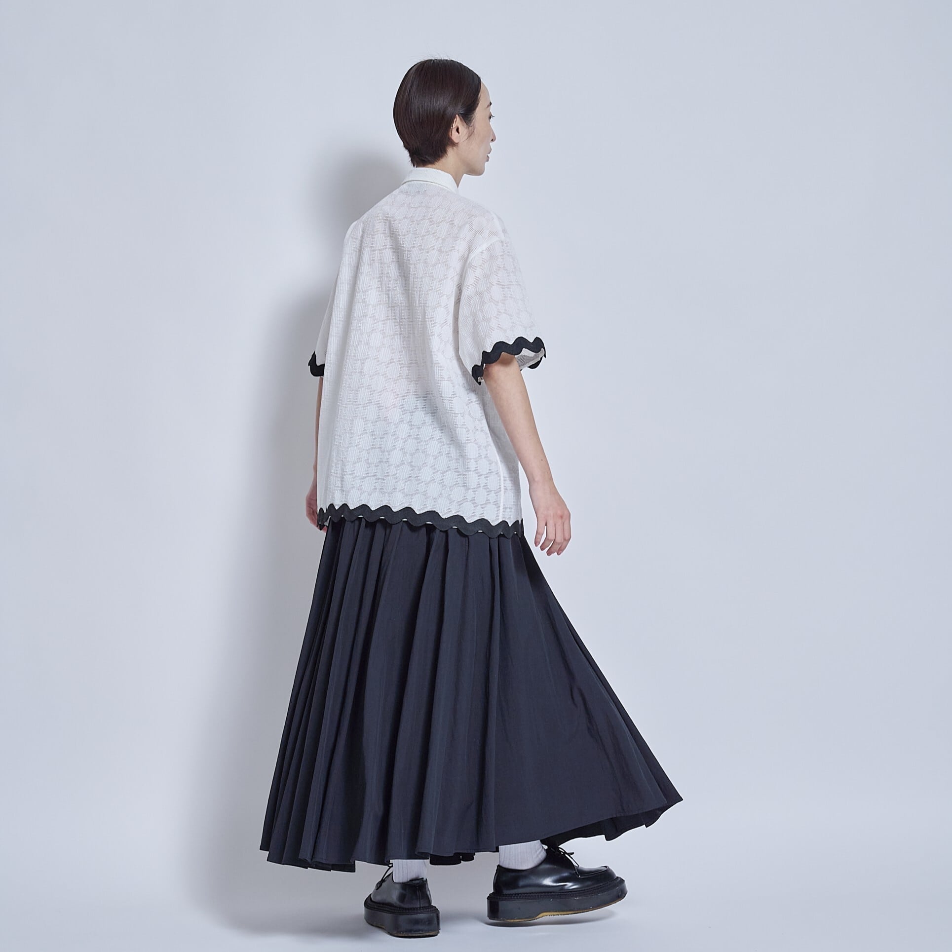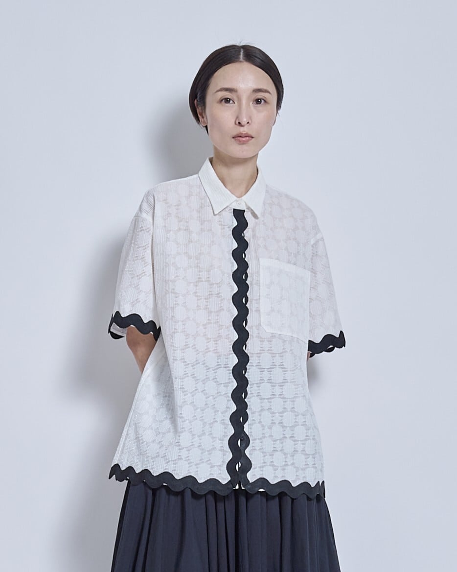 少し透けるドット透かしのジャガードのドライタッチなテキスタイルで作ったシャツです。ちょっと珍しい少しシアー感のある、波打ちしたような織りでドットを表現したあまり見かけないような素材です。