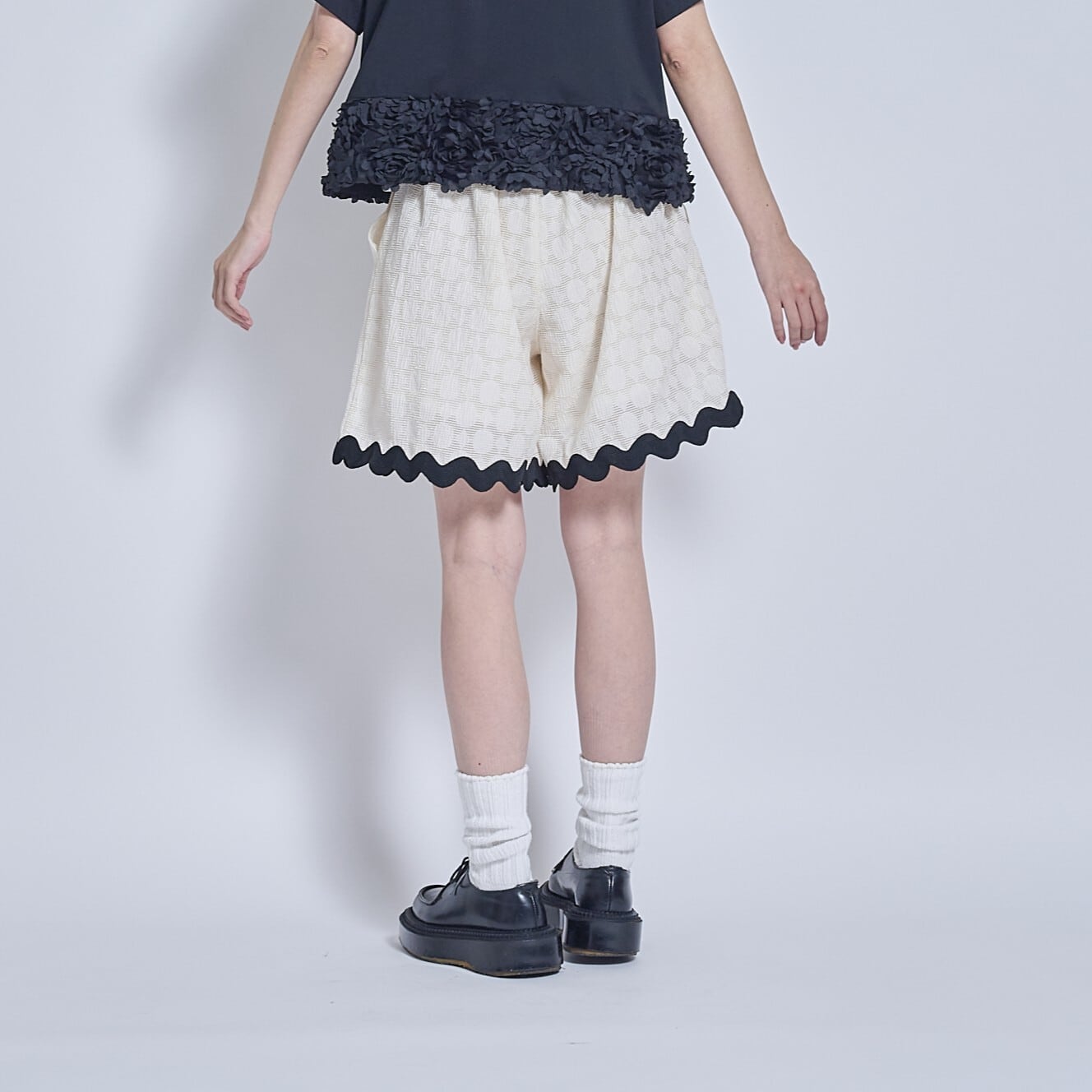 スタッフ人気No.1のショートパンツです。少し透けるドット透かしのジャガードのドライタッチなテキスタイルで作っています。今回は丈長めの膝上、広がりを沢山つけて、足がほっそりと見えるようにデザインしています。ここまで裾の広がりがあるショートパンツはなかなかないと思います。ヒップが大きい方にも安心して着用できます。夏のショーツに抵抗ない方が増え、流行から定番へと人気が継続していますが、足が細く見える広がりが大きな特徴になっています。また、ヘムにウエーブテープをつけているのでヘムに厚みがありさらに広がりが出るようになっています。ヒップも大きめ、ワタリも大きめ、細い方は、ウエストのインナードローストリングで絞って履いてください。イージータイプで履く方の体型を選ばない作りになっています。