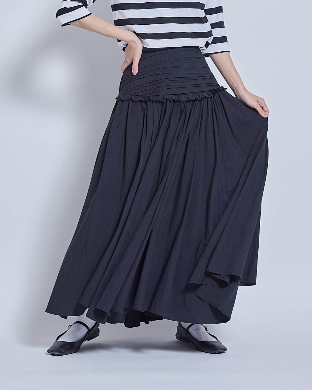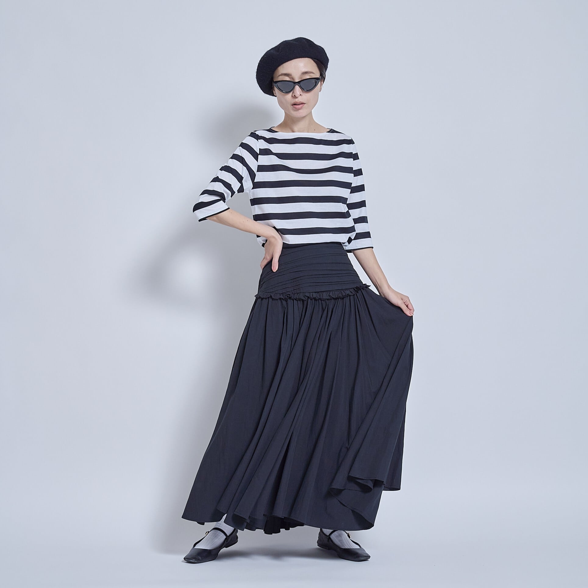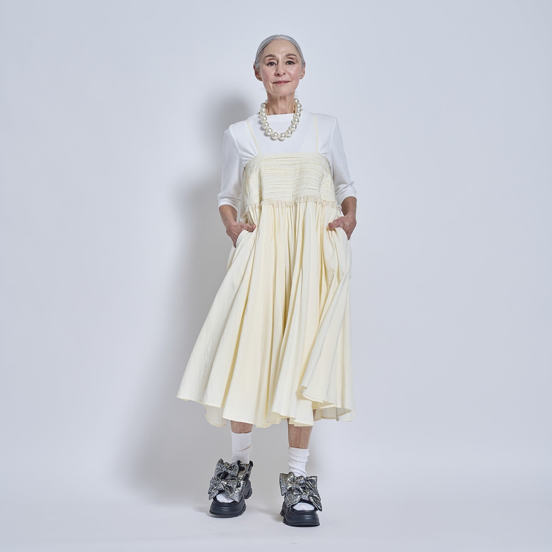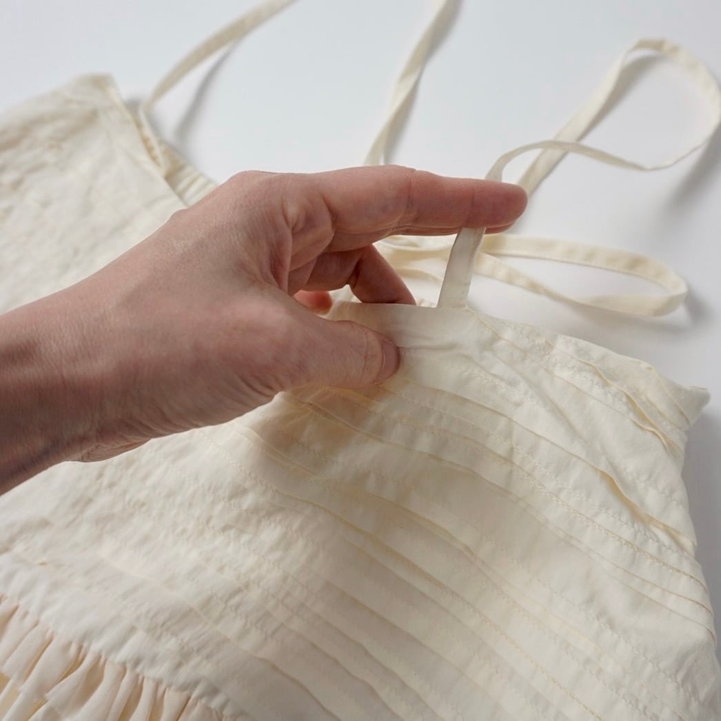 吊り紐の付いたスカートです。初めてのデザイン。ヒップハングでやや大きめのウエストになっています。ウエストから腰まで切り替えが付いていて、ランダムにタックを寄せたデザイン。その下に小さいフリルを付けています。そしてこのギャザーがとても特徴的です。細かくたっぷりとギャザーを寄せて大きな蹴回しになっています。フロントのギャザーがたっぷりしていて、裾がランダムになっているのも魅力です。実物はリッチなギャザーのドレープが見事で歩く度に揺れる雰囲気がとても素敵です。両サイドポケット付き。ウエストから紐を付けており吊りスカートにも出来るようになっています。今回後ろで結ぶタイプの紐がクロスになるように付いていて、長さ調節が可能で胸まで引き上げてビスチェ風ドレスにすることも出来るようになっています。2WAYでドレスとして着用できるのも魅力ではないかと思います。ここまでギャザーが入っているスカートも少ないと思うので、少しプライスが上がってしまいましたが、とても魅力あるスカートが出来たのではないかと思っています。ブラックが万能でお勧め。クリームはバター色で合わせやすくこちらも夏にはとてもかわいいカラーだと感じます。吊り紐でビスチェ風のドレスにした時のスカート丈も可愛いなと思いました。