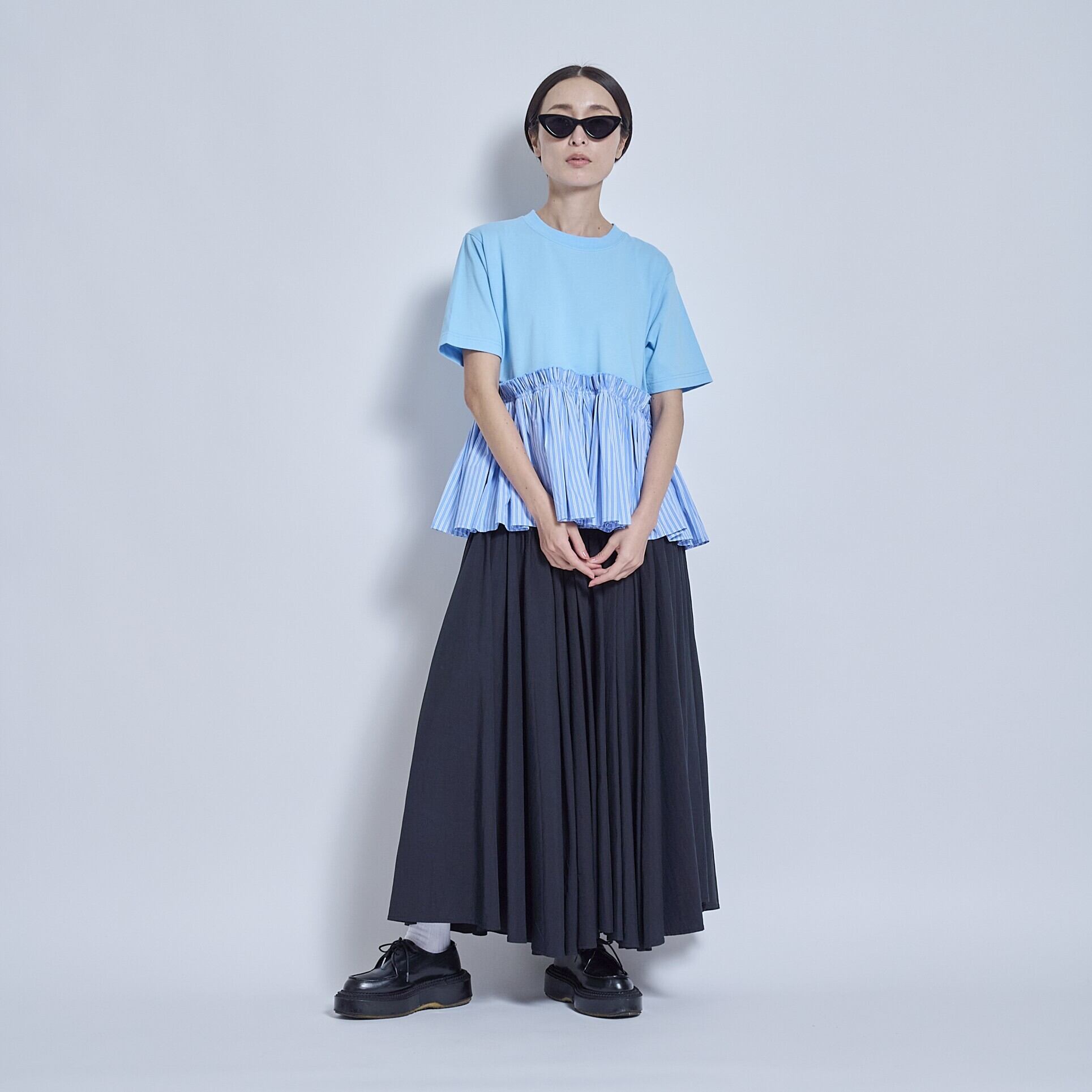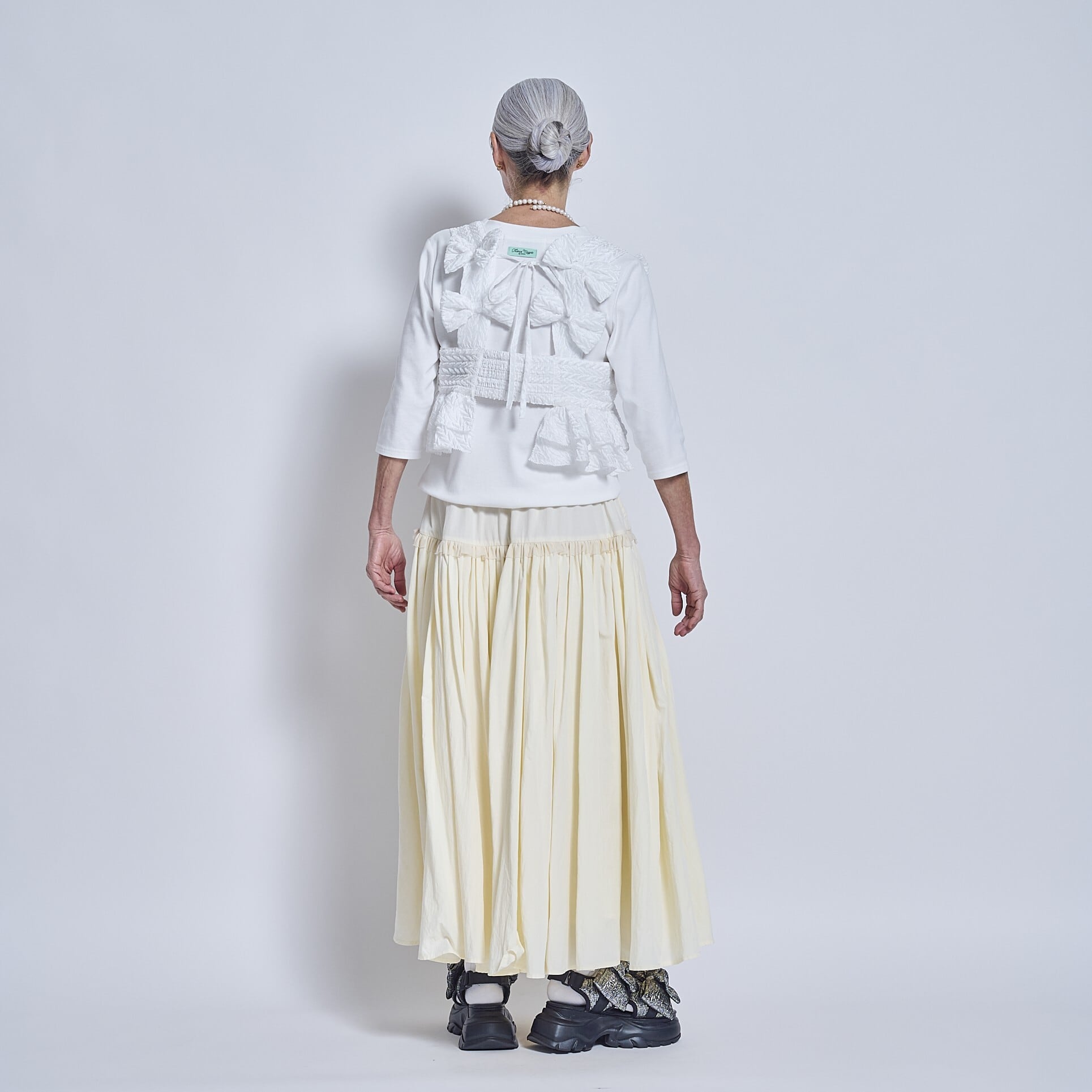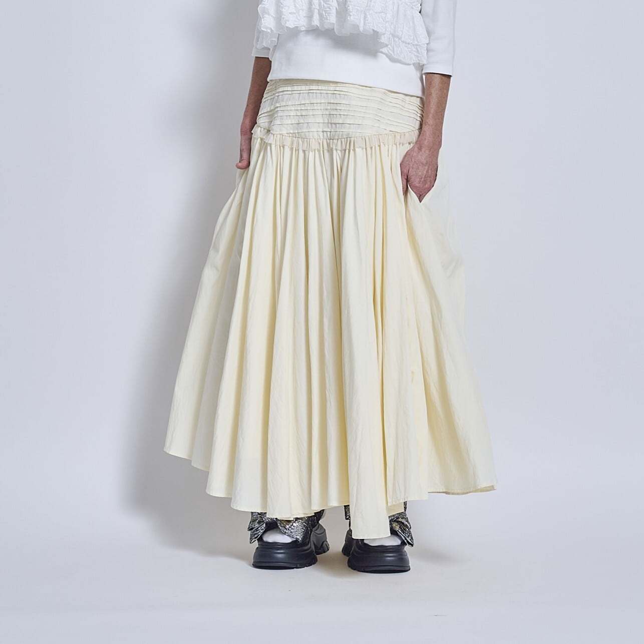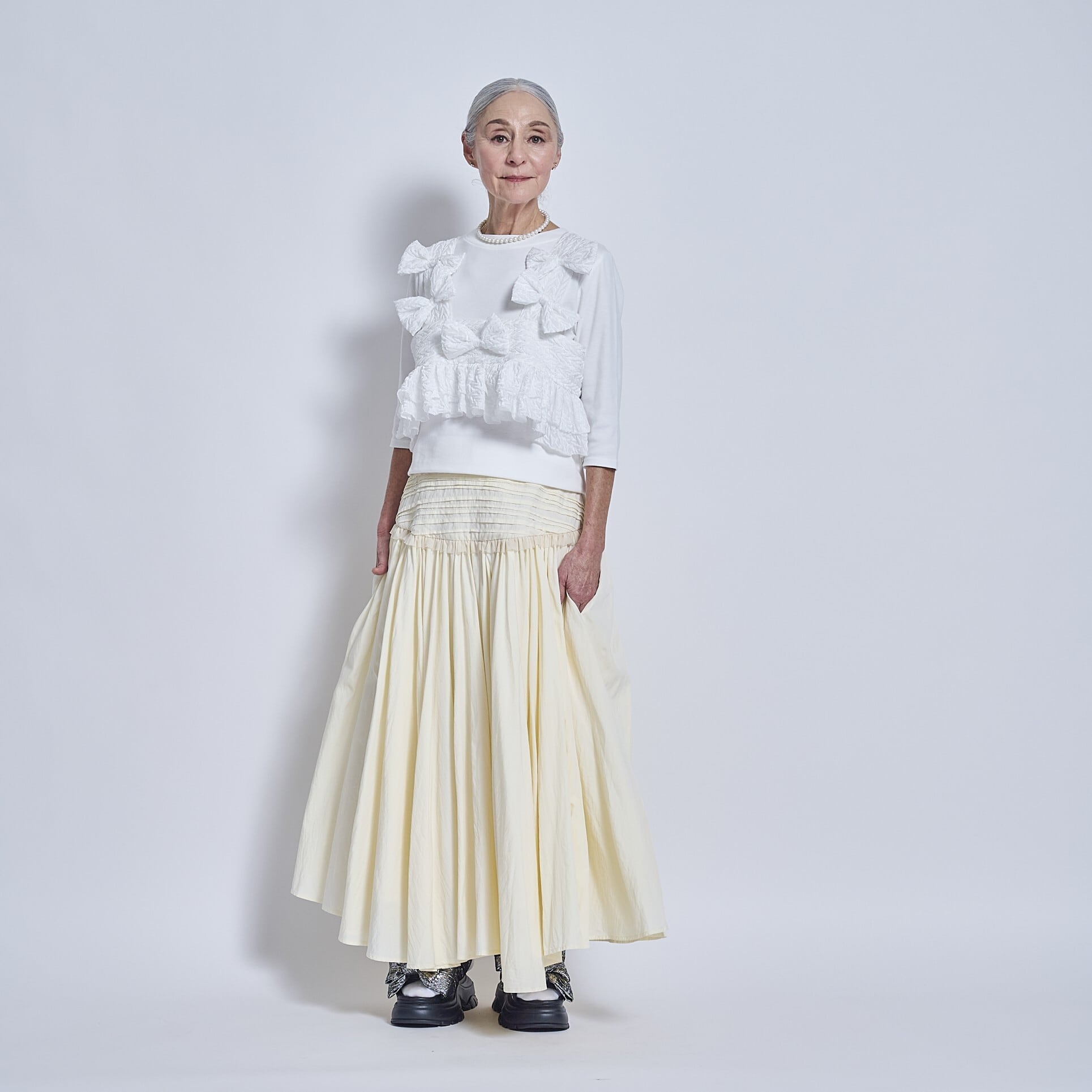 吊り紐の付いたスカートです。初めてのデザイン。ヒップハングでやや大きめのウエストになっています。ウエストから腰まで切り替えが付いていて、ランダムにタックを寄せたデザイン。その下に小さいフリルを付けています。そしてこのギャザーがとても特徴的です。細かくたっぷりとギャザーを寄せて大きな蹴回しになっています。フロントのギャザーがたっぷりしていて、裾がランダムになっているのも魅力です。実物はリッチなギャザーのドレープが見事で歩く度に揺れる雰囲気がとても素敵です。両サイドポケット付き。ウエストから紐を付けており吊りスカートにも出来るようになっています。今回後ろで結ぶタイプの紐がクロスになるように付いていて、長さ調節が可能で胸まで引き上げてビスチェ風ドレスにすることも出来るようになっています。2WAYでドレスとして着用できるのも魅力ではないかと思います。ここまでギャザーが入っているスカートも少ないと思うので、少しプライスが上がってしまいましたが、とても魅力あるスカートが出来たのではないかと思っています。ブラックが万能でお勧め。クリームはバター色で合わせやすくこちらも夏にはとてもかわいいカラーだと感じます。吊り紐でビスチェ風のドレスにした時のスカート丈も可愛いなと思いました。