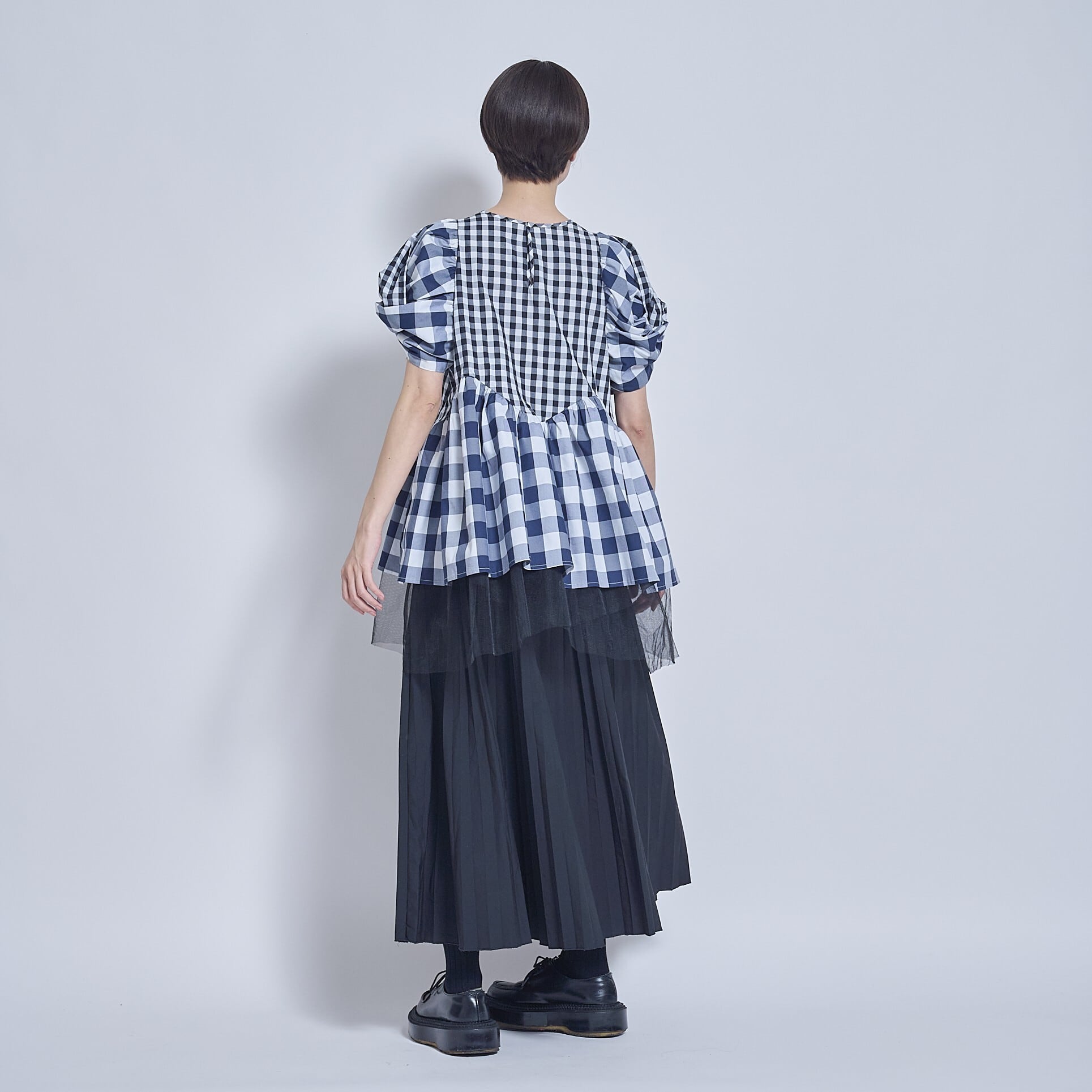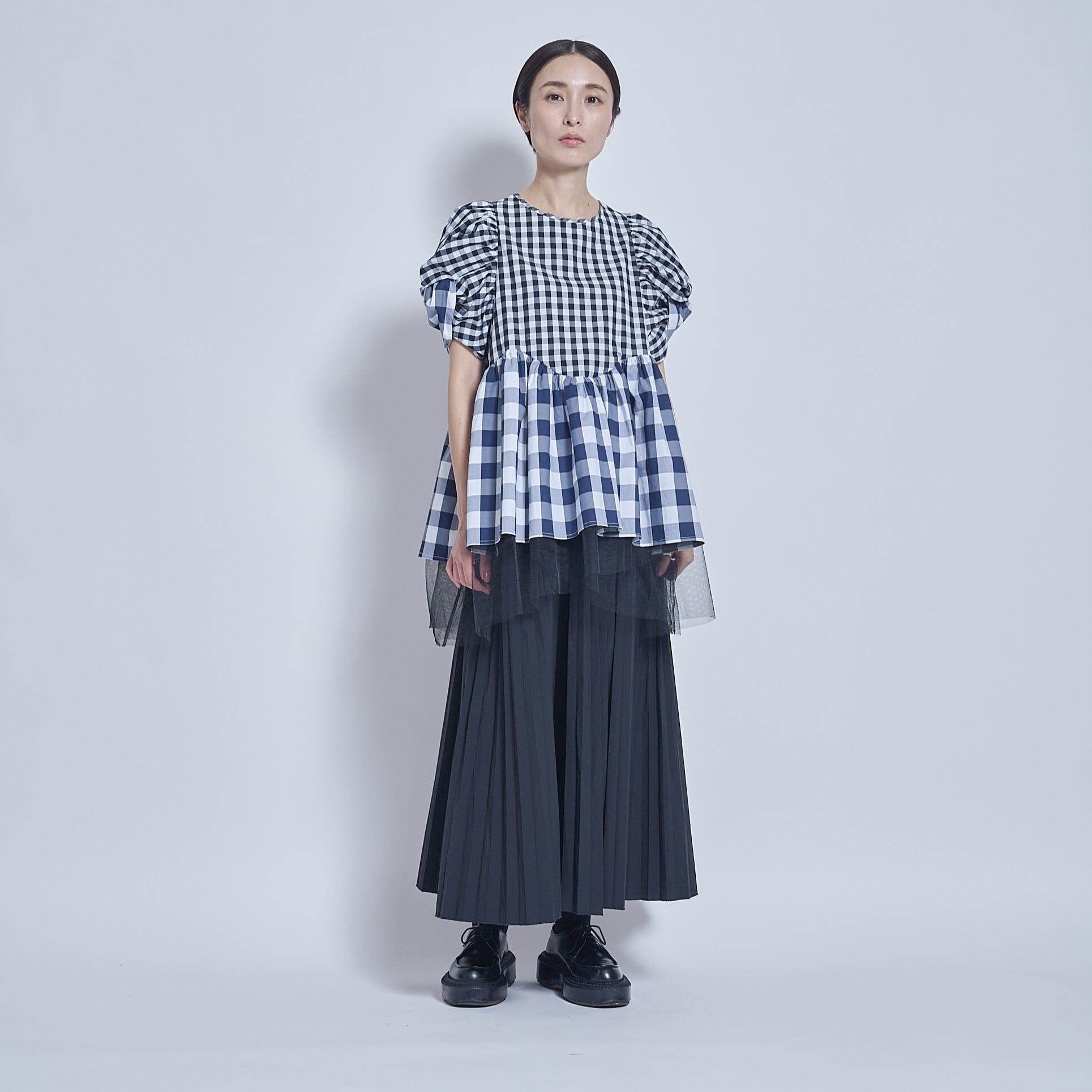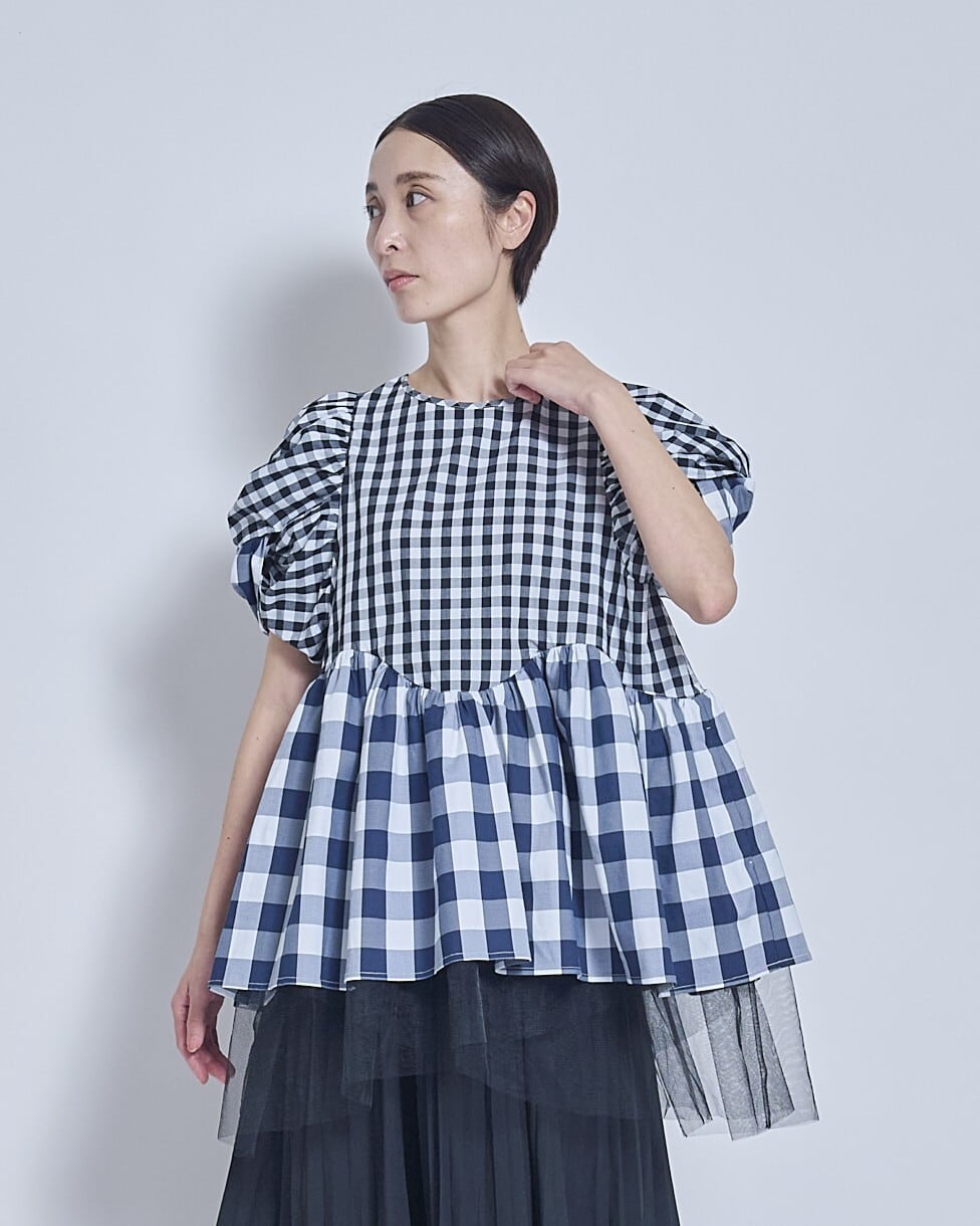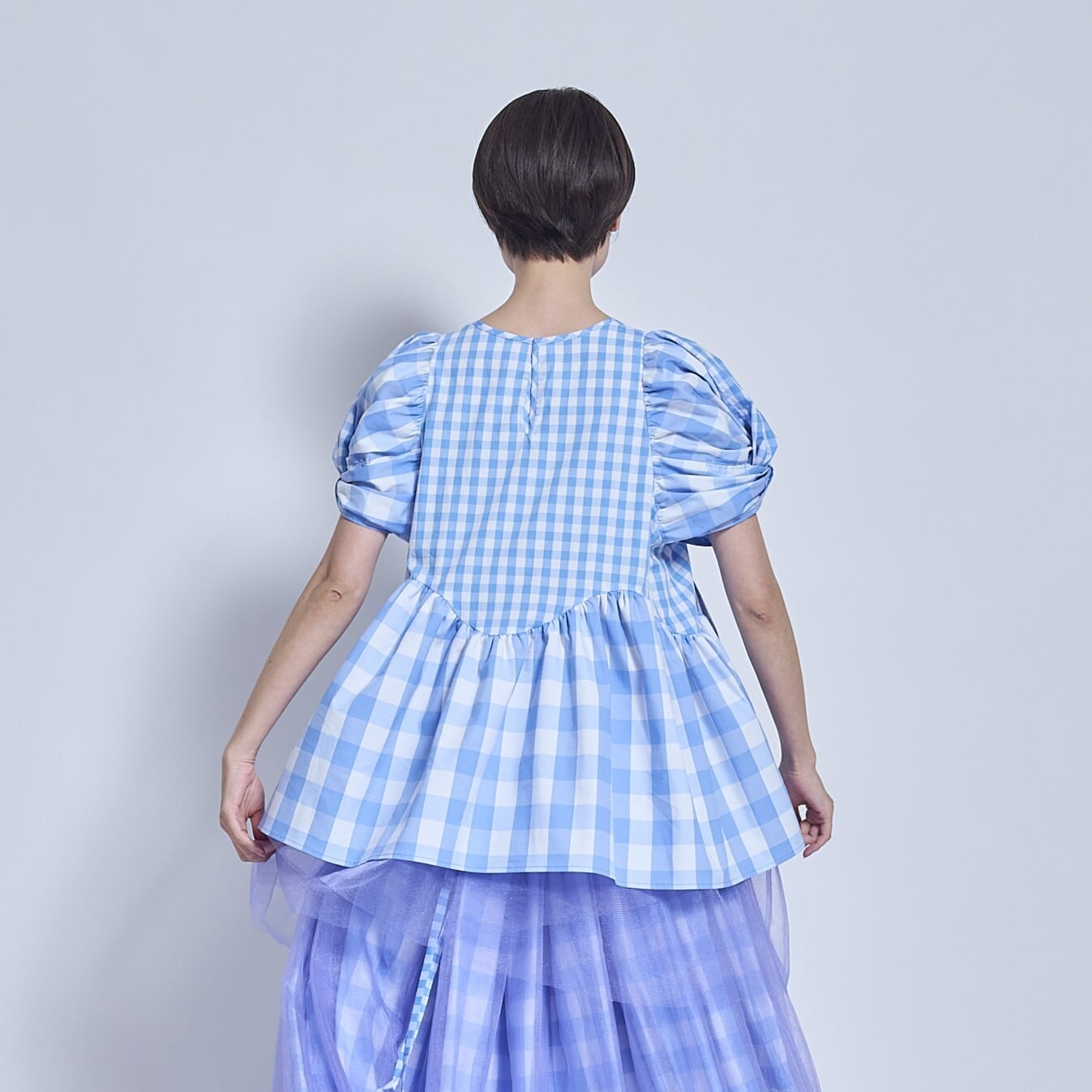 今回はギンガムの大と小のテキスタイルをピックアップして、組み合わせたシリーズをデザインしました。そこにギンガムと同色のチュールを2枚ランダムにアシンメトリーに重ねて、ギンガムチェックの裾から出したシャツ。普通にはあまりみたことの無いような物を作りたくて、この2素材の組み合わせにしてみました。袖はパフスリーブになっていますが、ねじりを加えたパターンを作り、フワッと見える袖になっています。胸下からペプラムライクにギャザーを寄せた大きなギンガムチェックで胸の下にカーブした切り替えを加えたデザイン。