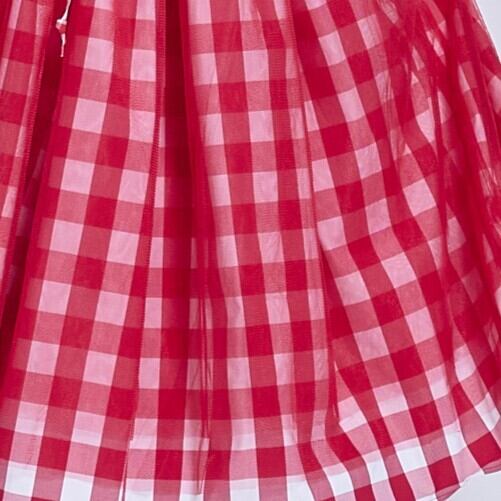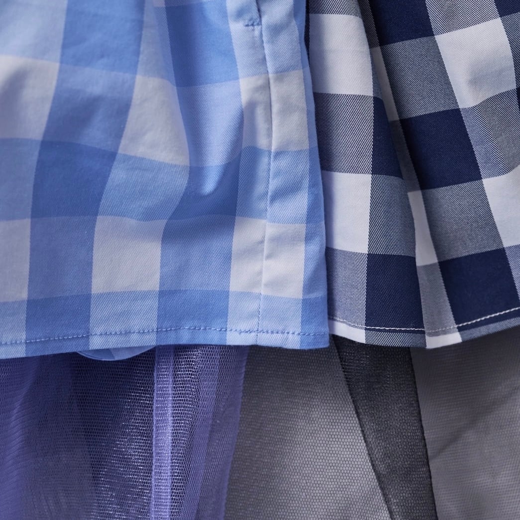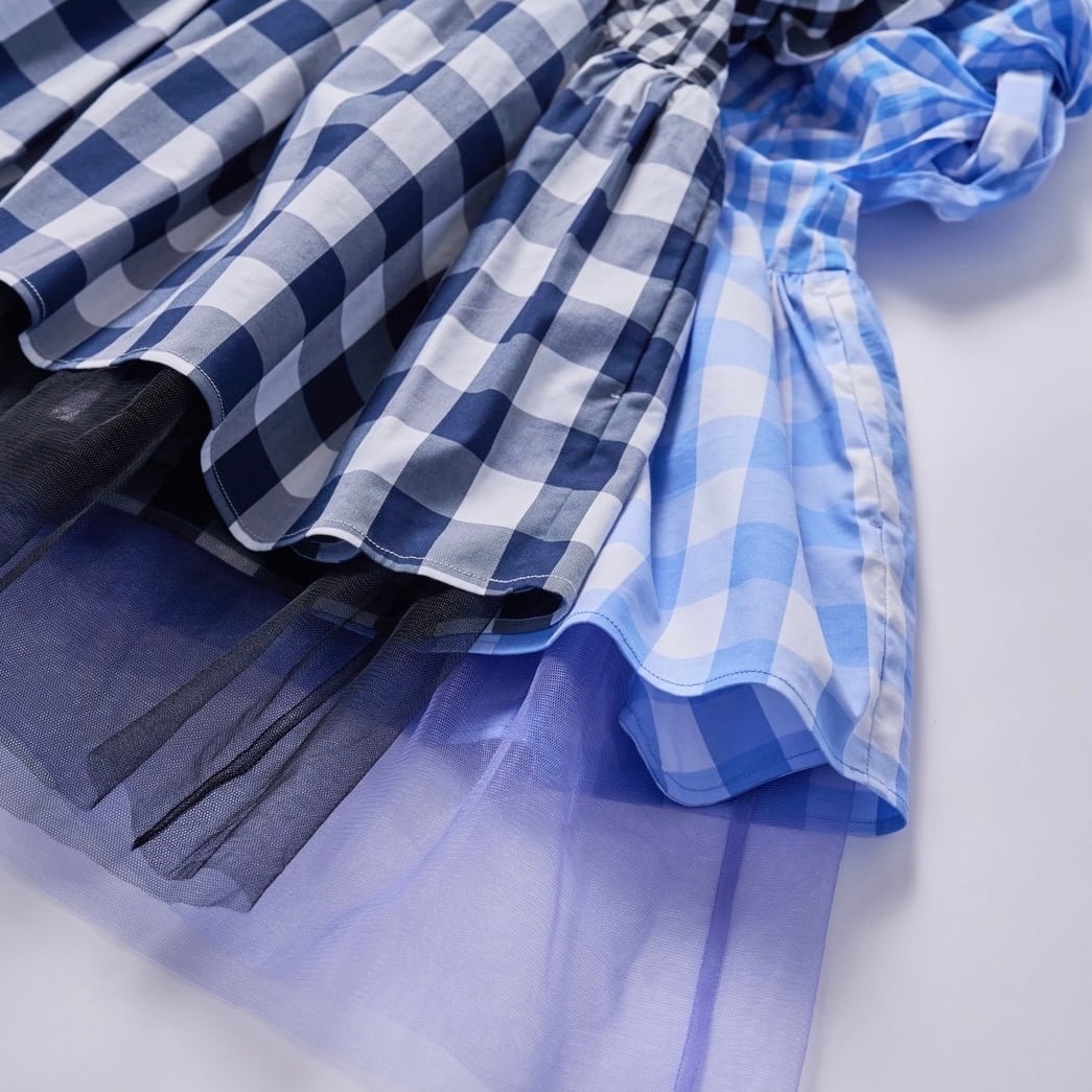 今回はヘム(裾や縁)に変化を付けるデザインをテーマに全体的に企画の流れを作っています。このシャツはチュールをランダムに見せるデザインです。重なりとランダムさが少し楽しいと思います。ずっとやってみたかったギンガムチェックです。着る方を選ぶかもしれませんが、デニムなんかで着崩して甘くなりすぎないようにしてみるのも良いかもしれません。お揃いのドレススカートもあり、セットアップにも出来るようにしています。合わせて着るとワンピースの様にもなりとても気に入っています。