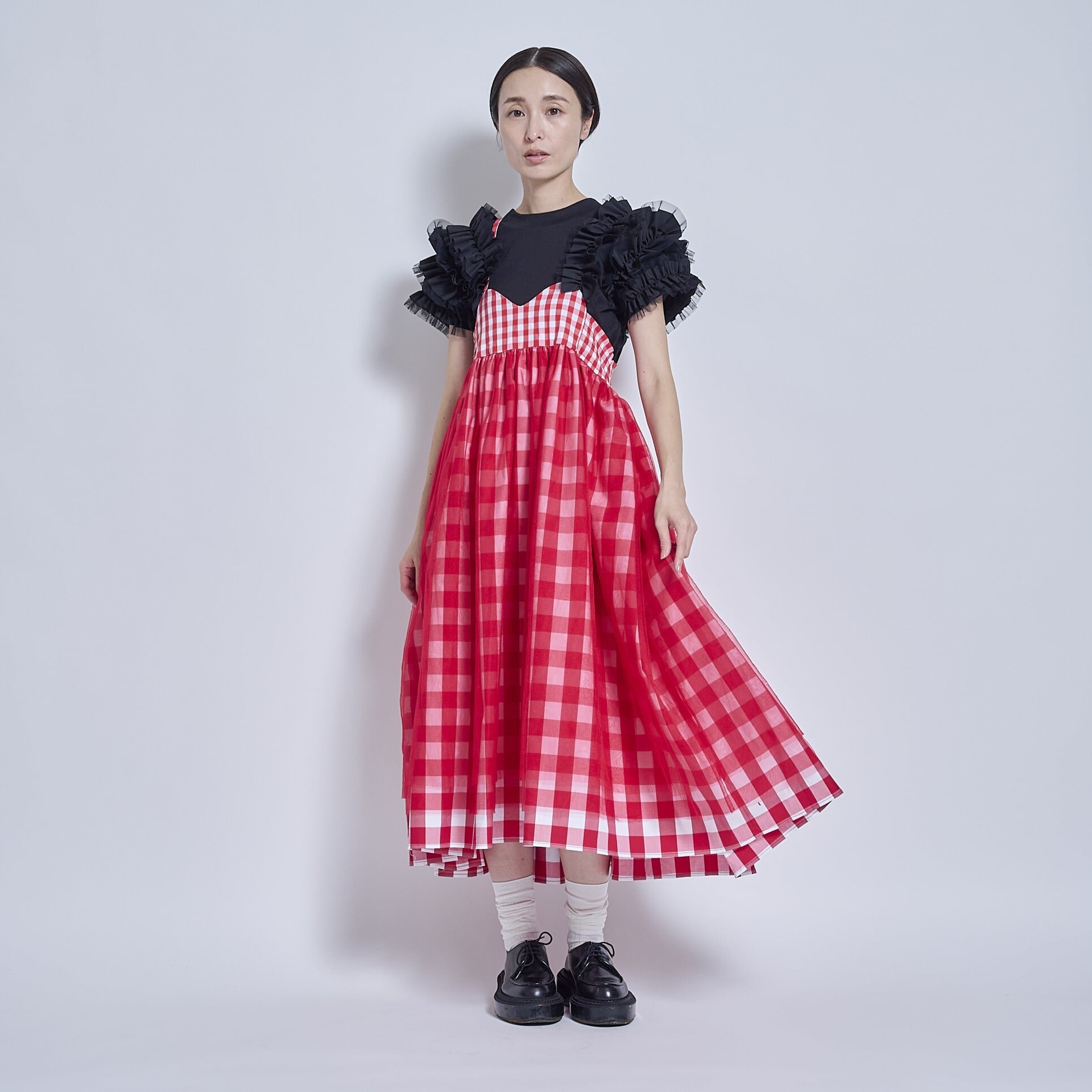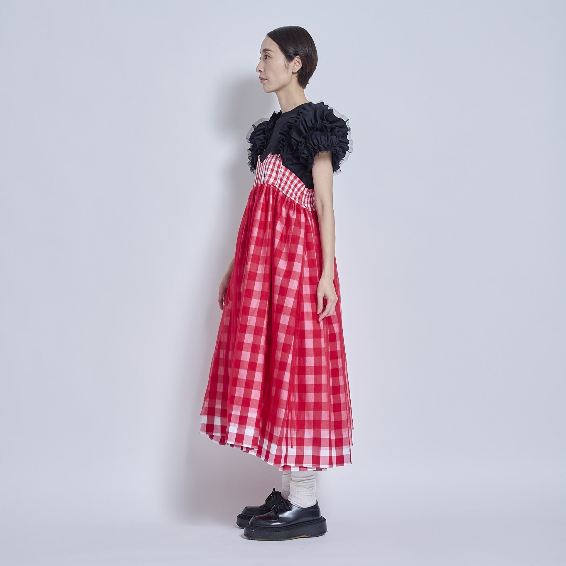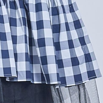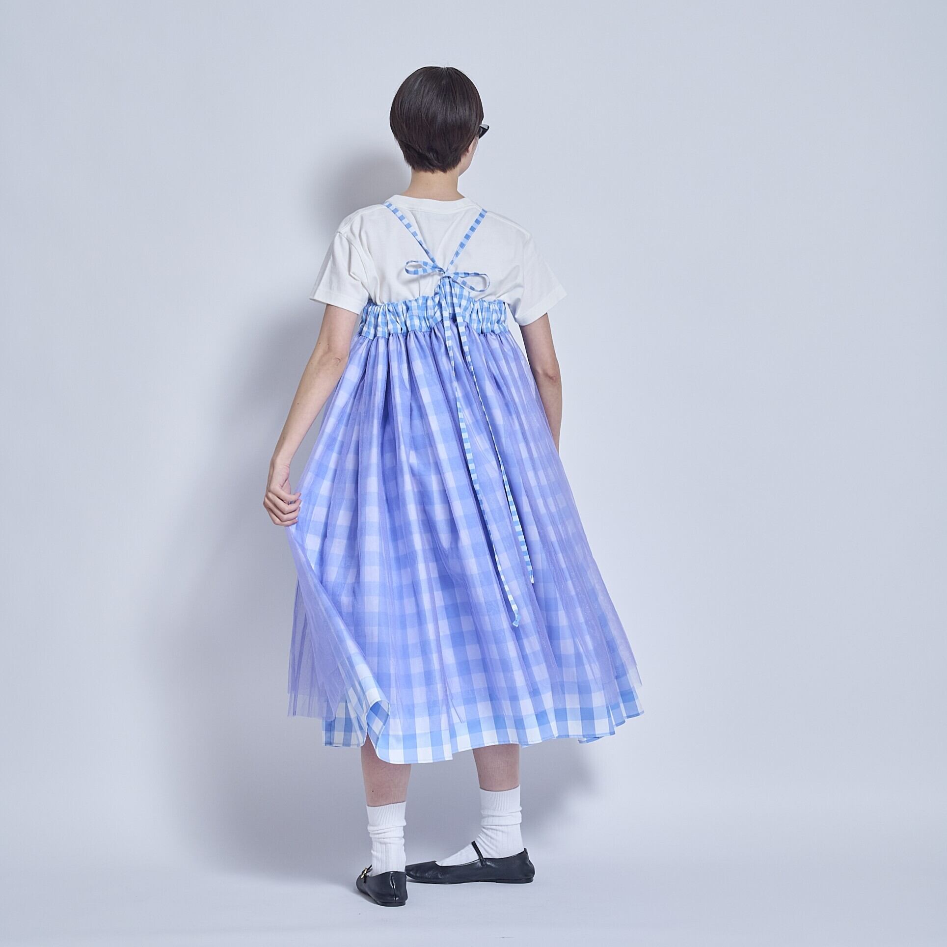 後ろで紐で結ぶタイプのドレスです。スカートに共紐が付いていて、後ろで調整して結び、長さの調節をします。ウエスト(胸あて)部分は胸に移動させることもできてスカートの丈を変えることが出来るようにしました。大きいギンガムチェックと小さいギンガムチェックのパーツ分けで変化をつけ、上から柔らかめのチュールを2枚重ねて揺れるニュアンスを作ってみました。胸当て部分はカーブしていて少し個性的にしてみました。とても個性的なデザインですが、ボトムなので(顔から離れているので)着やすいのではないかと思います。