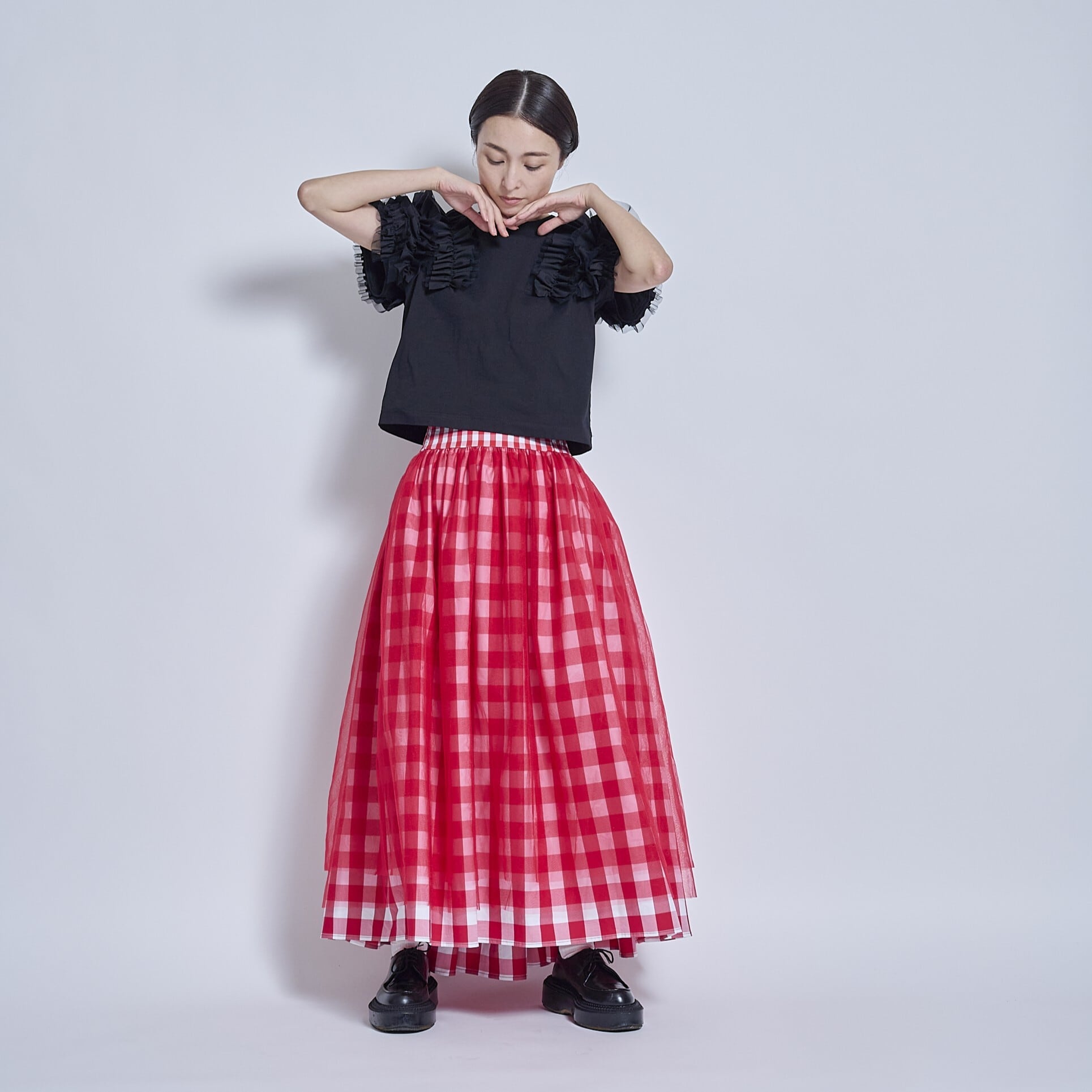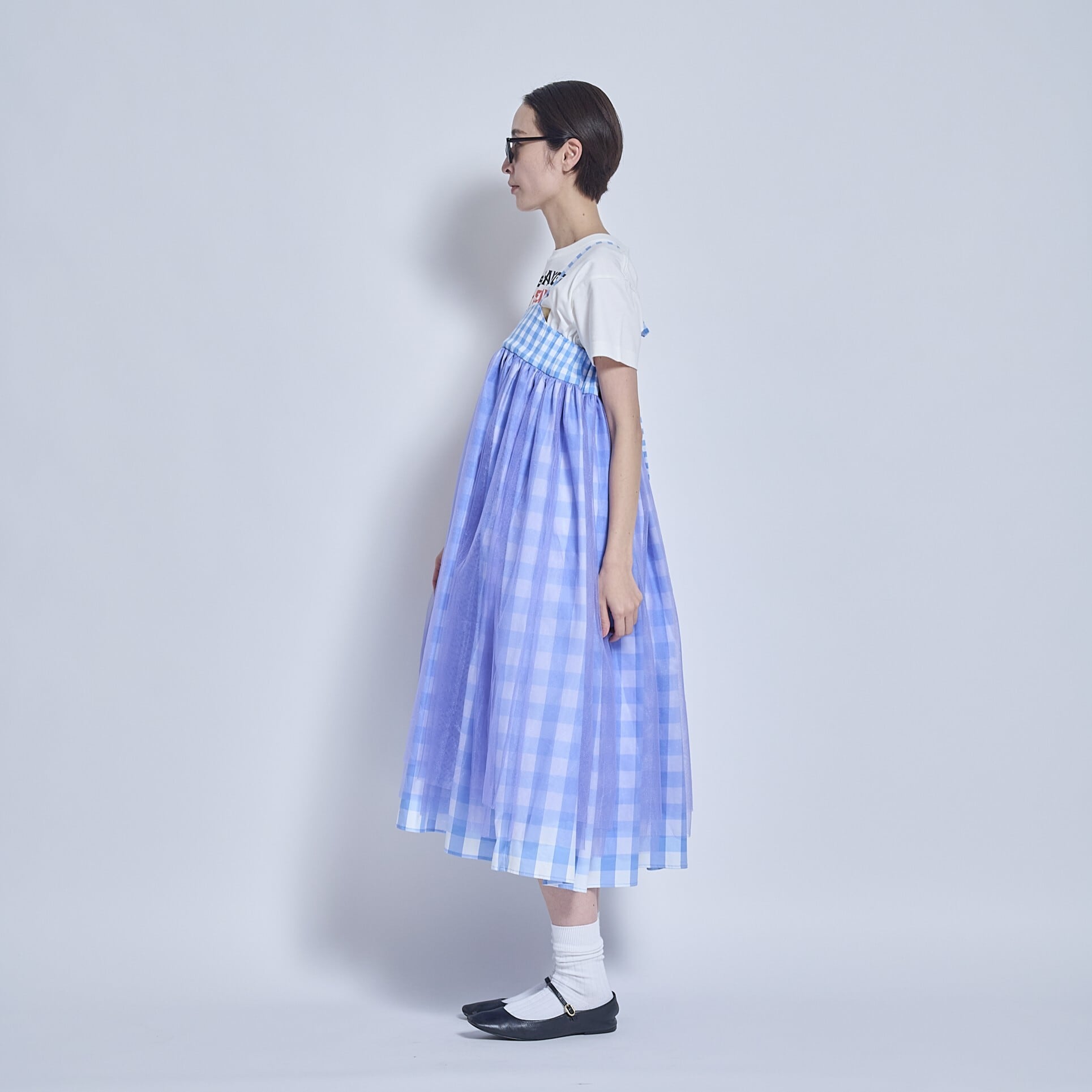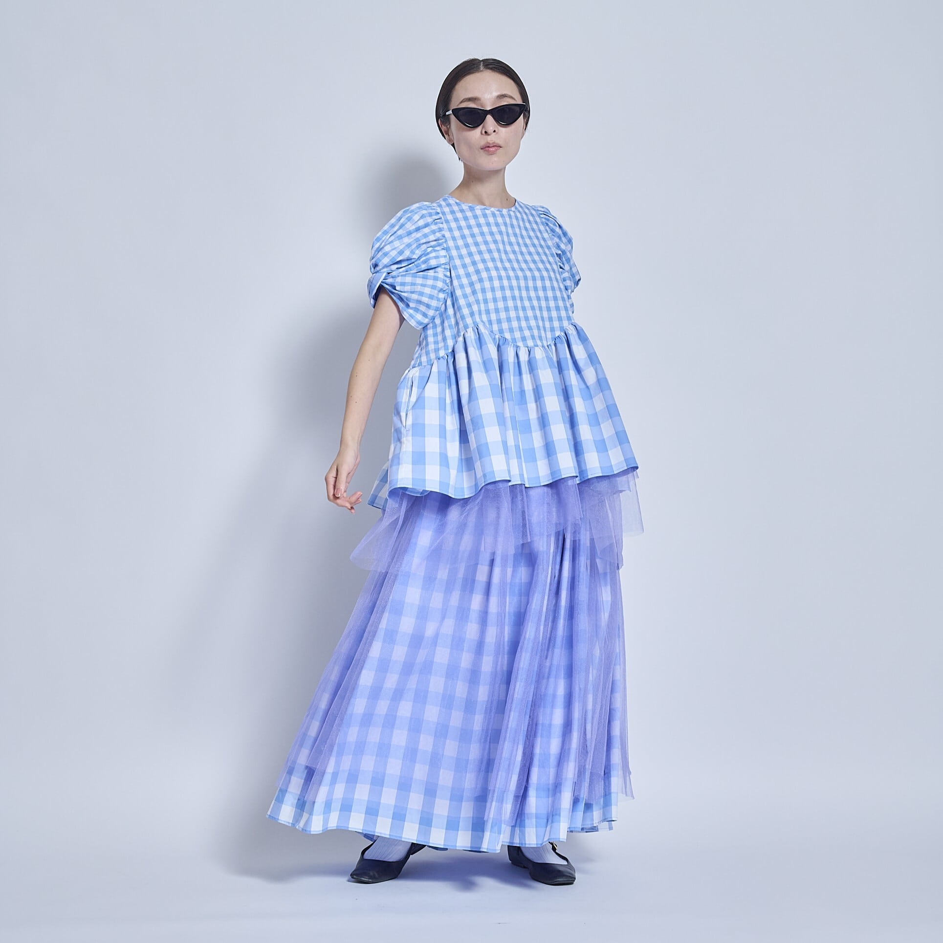 後ろで紐で結ぶタイプのドレスです。スカートに共紐が付いていて、後ろで調整して結び、長さの調節をします。ウエスト(胸あて)部分は胸に移動させることもできてスカートの丈を変えることが出来るようにしました。大きいギンガムチェックと小さいギンガムチェックのパーツ分けで変化をつけ、上から柔らかめのチュールを2枚重ねて揺れるニュアンスを作ってみました。胸当て部分はカーブしていて少し個性的にしてみました。とても個性的なデザインですが、ボトムなので(顔から離れているので)着やすいのではないかと思います。