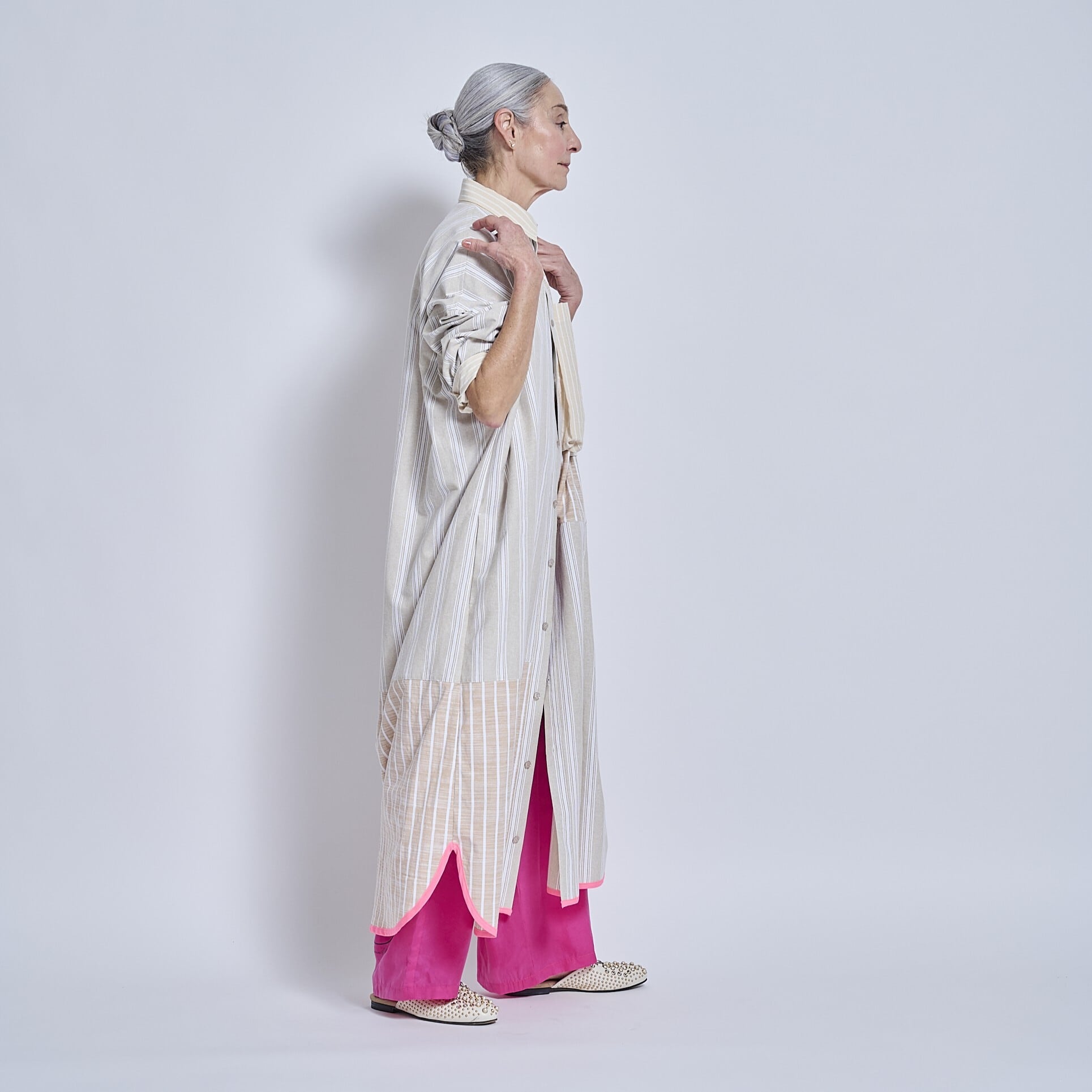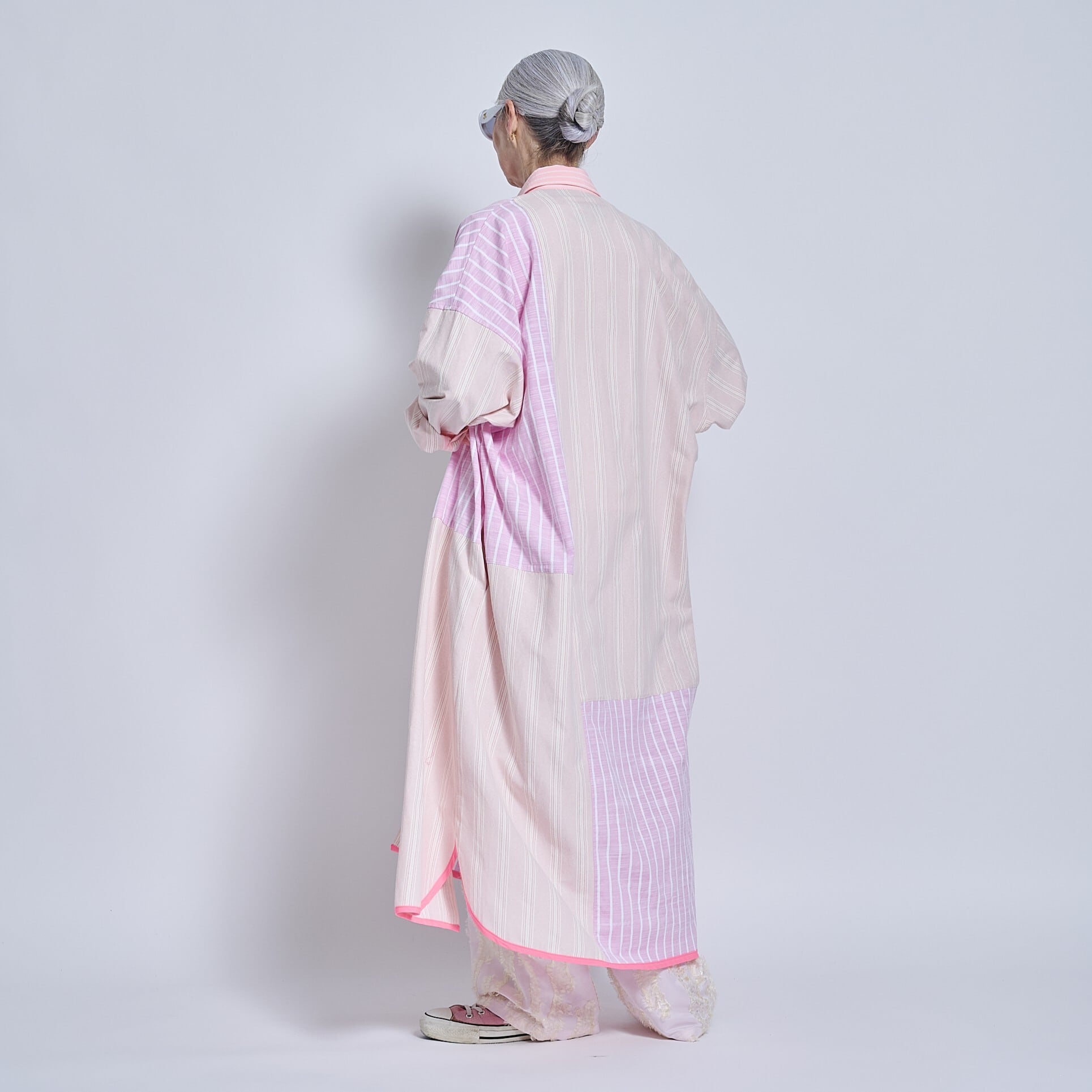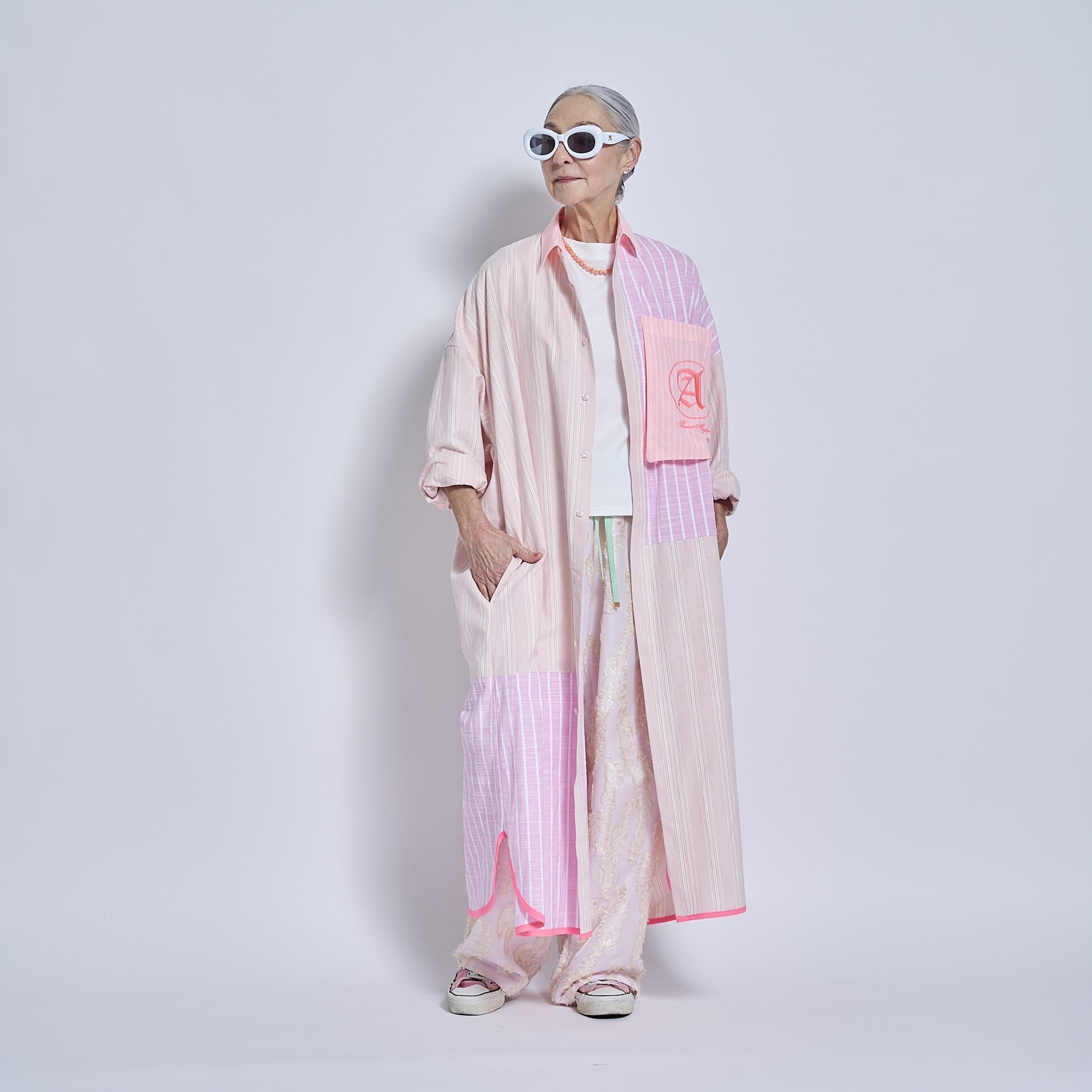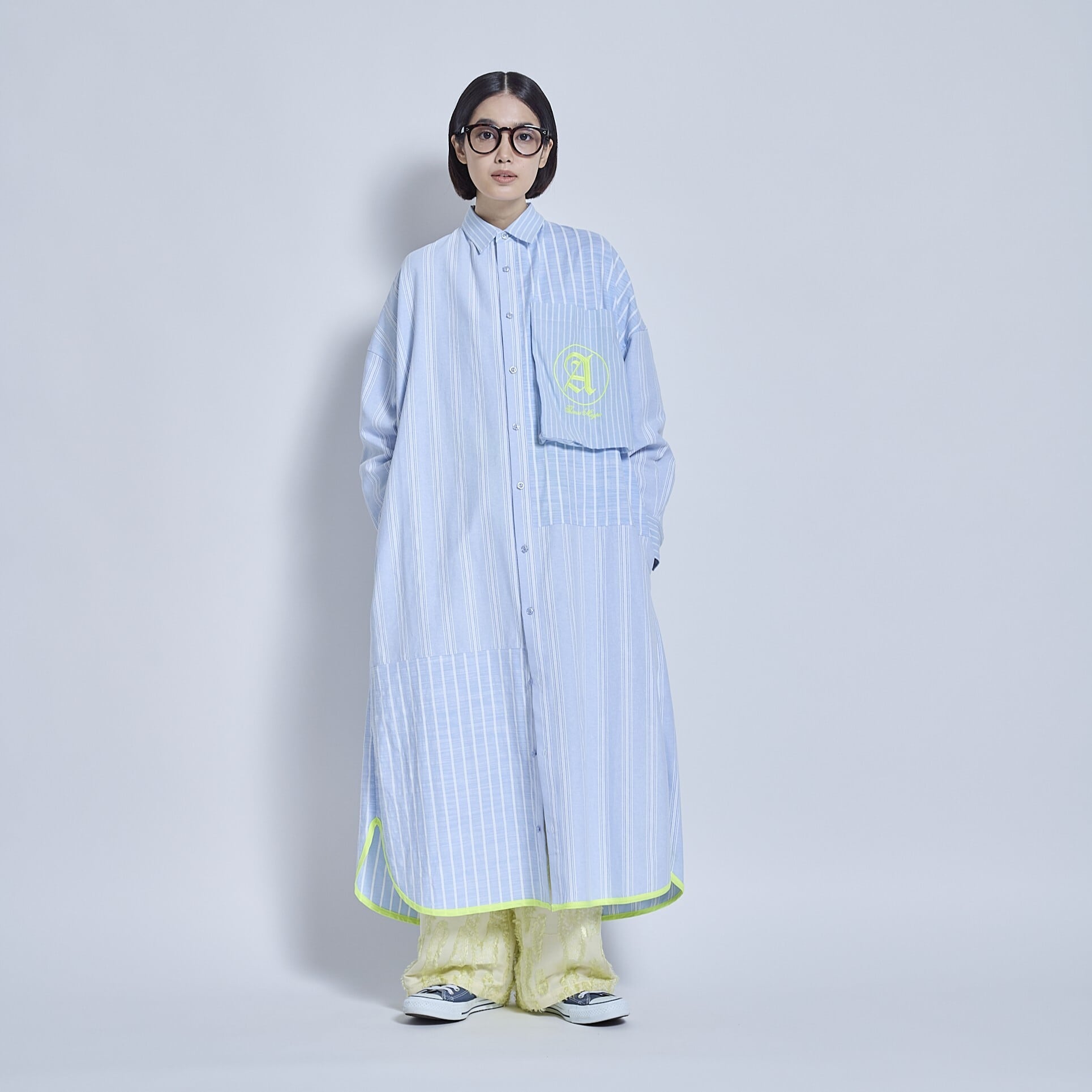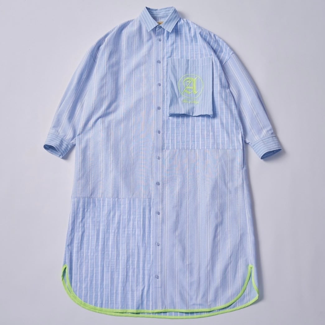 今回はヘム(裾や縁)に変化を付けるデザインをテーマに全体的に企画の流れを作っています。このシャツはチュールをランダムに見せるデザインです。重なりとランダムさが少し楽しいと思います。ずっとやってみたかったギンガムチェックです。着る方を選ぶかもしれませんが、デニムなんかで着崩して甘くなりすぎないようにしてみるのも良いかもしれません。お揃いのドレススカートもあり、セットアップにも出来るようにしています。合わせて着るとワンピースの様にもなりとても気に入っています。