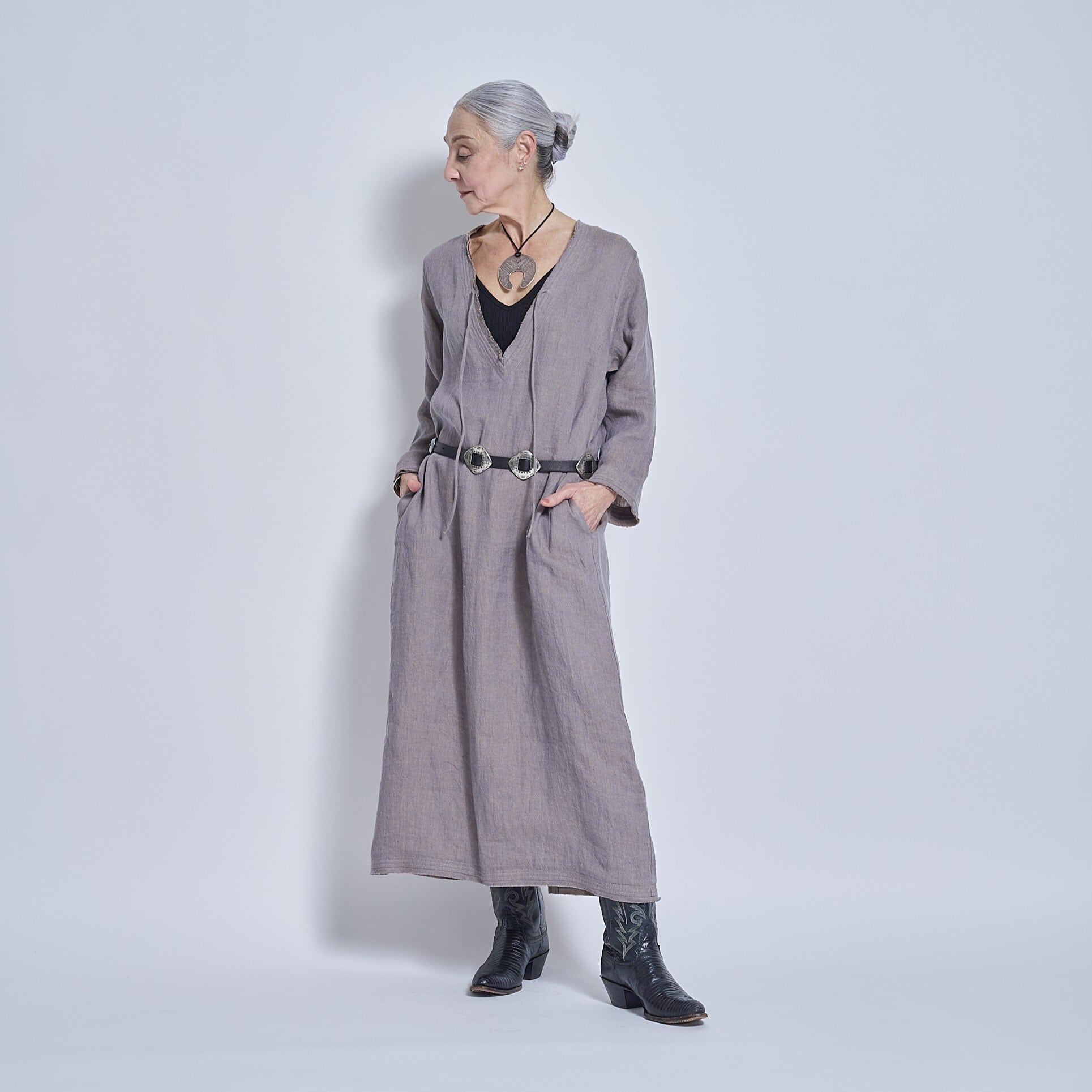 リネンのお洋服は、素朴感が出るので、シルバーのアクセサリーなどと合わせてみると、非常に雰囲気良くまとまりました。夏にノースリーブに抵抗のある方(私です)、でも涼しく過ごしたい方、また真夏は暑さ対策に講じてしまい、おしゃれからも縁遠くなってしまう方々も多いと思います。その点の解決策はこのドレスかなと感じました。今時期は冬に向かっているので、思い出せないですが、このデザインは真夏に行いました。いかに心地よく、日焼けせずに過ごせるのか、を考えたデザインになっています。ヘリンボーンリネンがとてもリッチな雰囲気を醸していると感じています。パープルは縦糸と横糸の色味が微妙に違う為、とても雰囲気の良い上質感も感じられるカラーです。