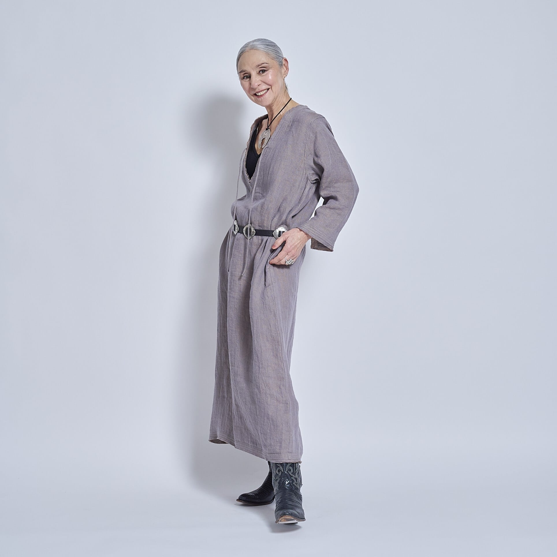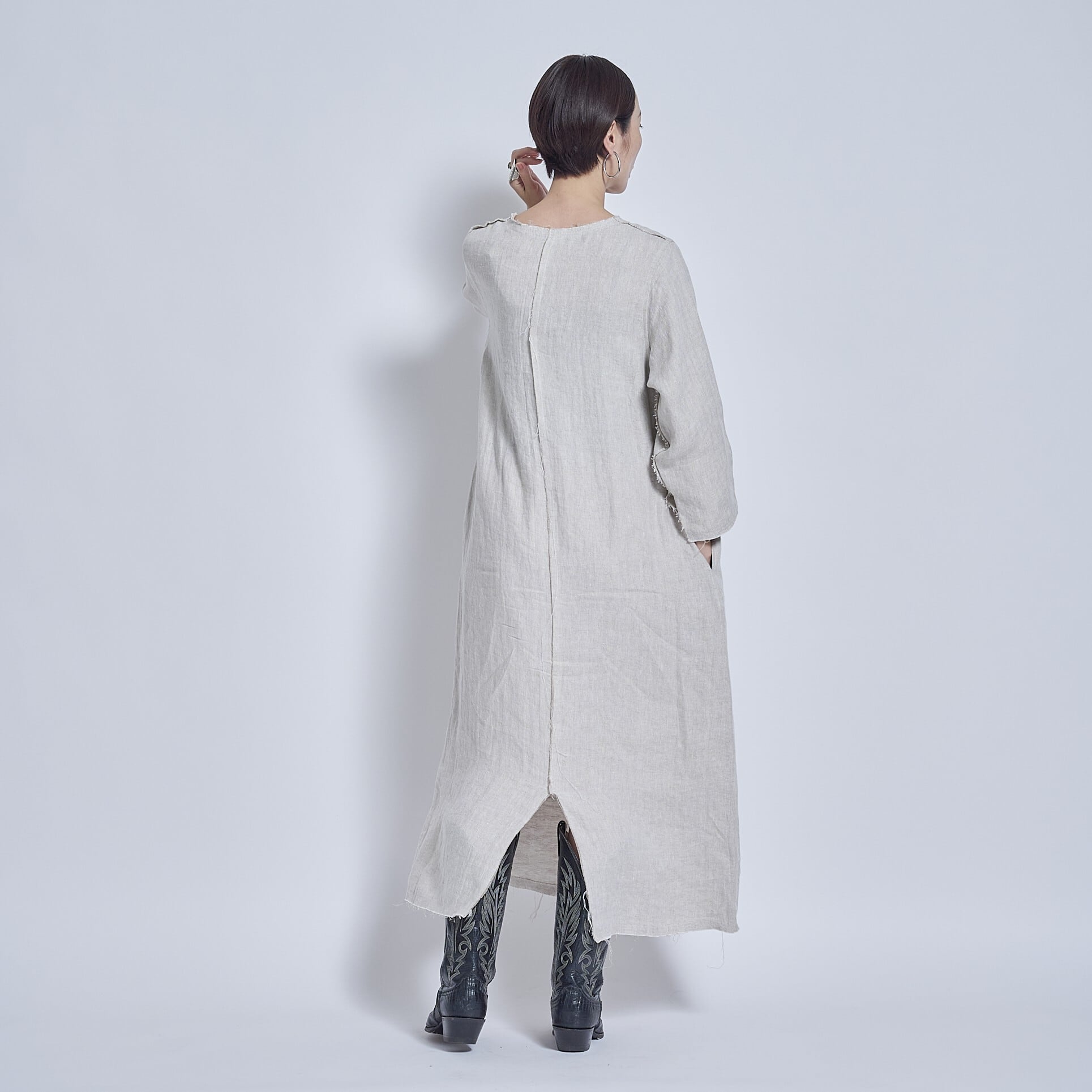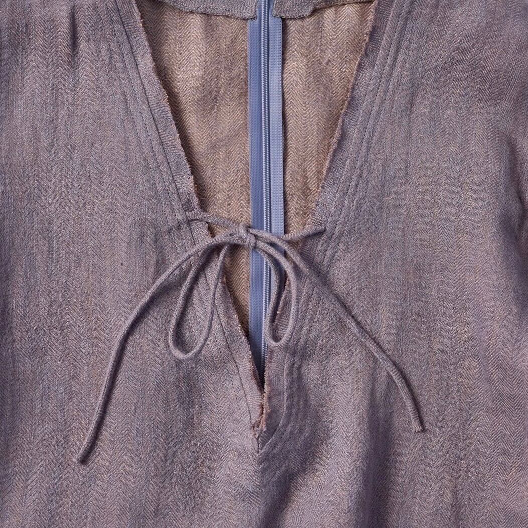 リネンジャケットと同じ素材でセットアップにできるドレスです。長袖ですが、真夏の暑い日にも涼しく着ることの出来るリネンのドレスは、本当にあると便利です。最近は真夏日が長く、秋になるまでとにかく暑い日が続きます。そんな時にウエストの締め付けがなく、涼しく着ることができる真夏のお役立ちアイテム。切りっぱなしに見えるように工夫を凝らして、縫製工程を考えています。袖口や裾、ネック周りに同色のステッチワークが施されており気品があり、とても気に入っています。Vネックの開きはかなり広めです。キャミソールなどを着て合わせてください。Vの開き部分についた丸紐も作ってもらいました。細くて丸い共紐も魅力の一つです。この部分もこだわりを持ってデザインをしてみました。
