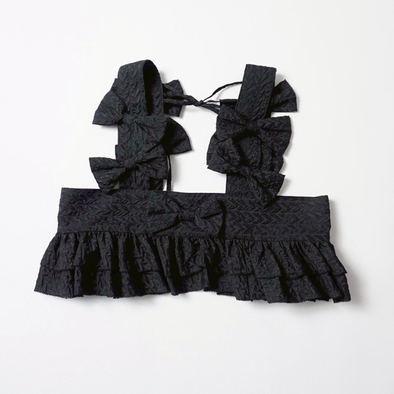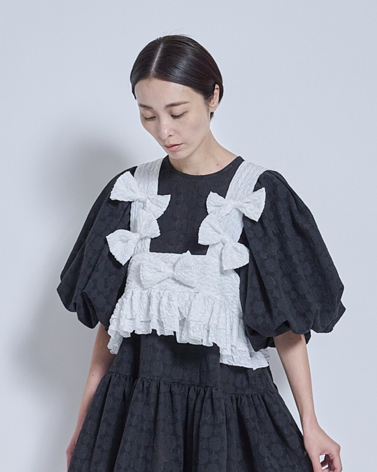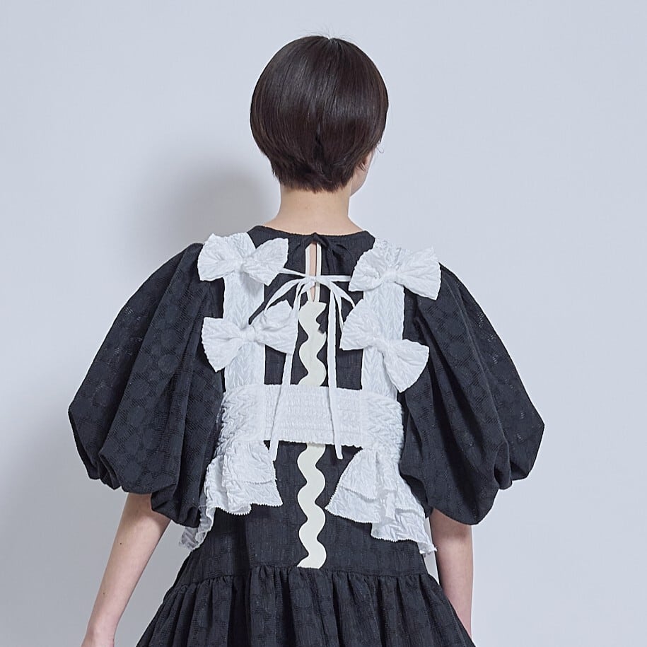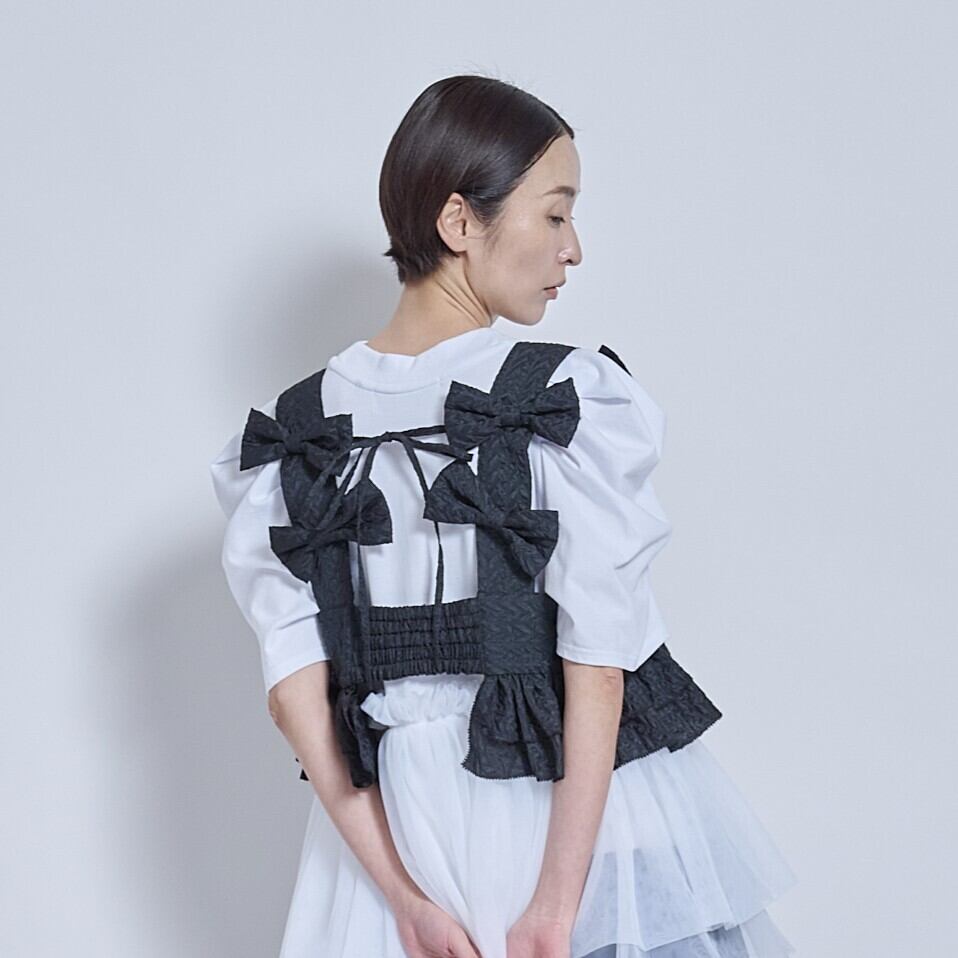 いくつもふっくらとした立体のリボンが付いています。ジャガードの織りでエンボスを表現したリーフ柄の素材です。少しシアー感があるのを重ねて透け感のないものにしました。ビスチェの裾にフリルを付けています。ちょっと物足りないトップスに遊びとモードさがあるアイテムです。大げさにリボンが付いて、ちょっとうるさいほどですが、あるとオールシーズン使えて楽しいかもしれません。