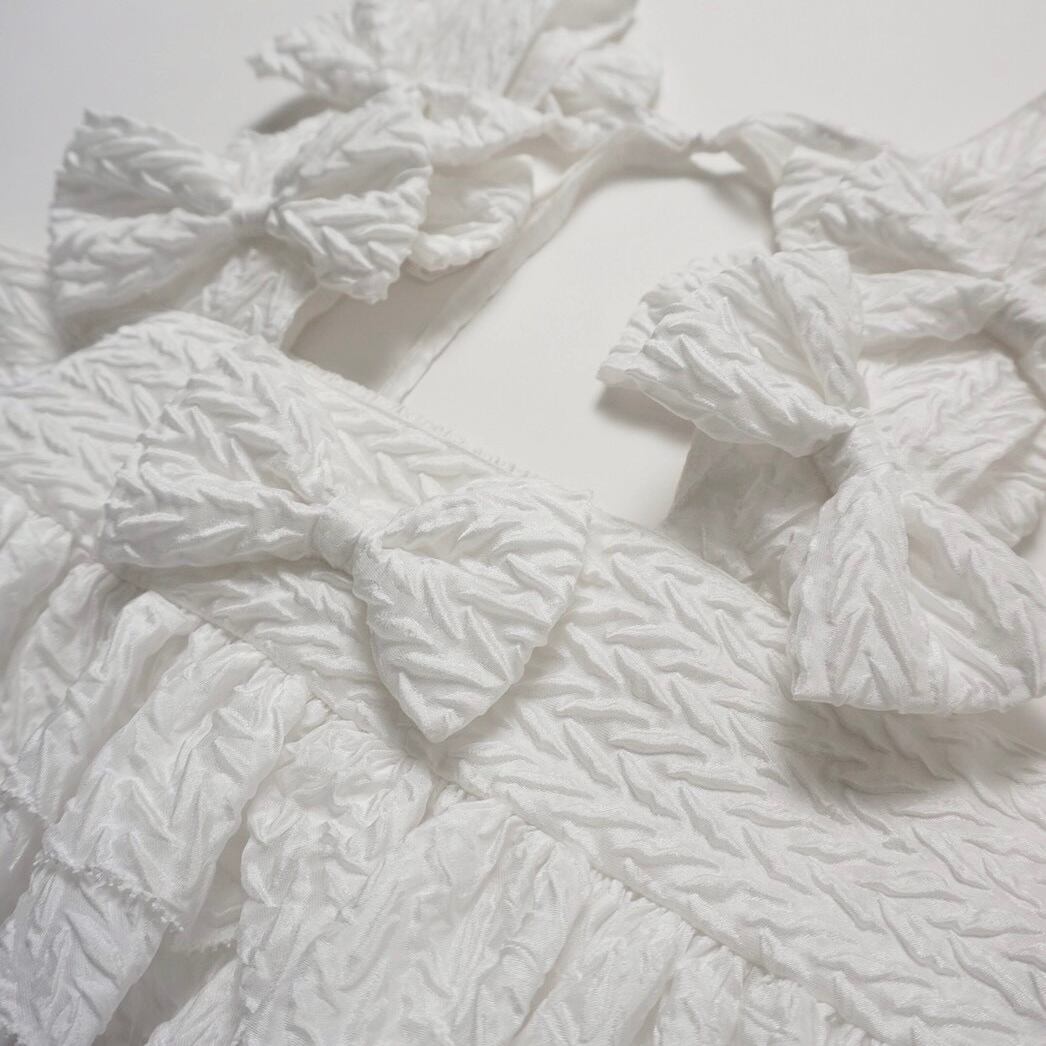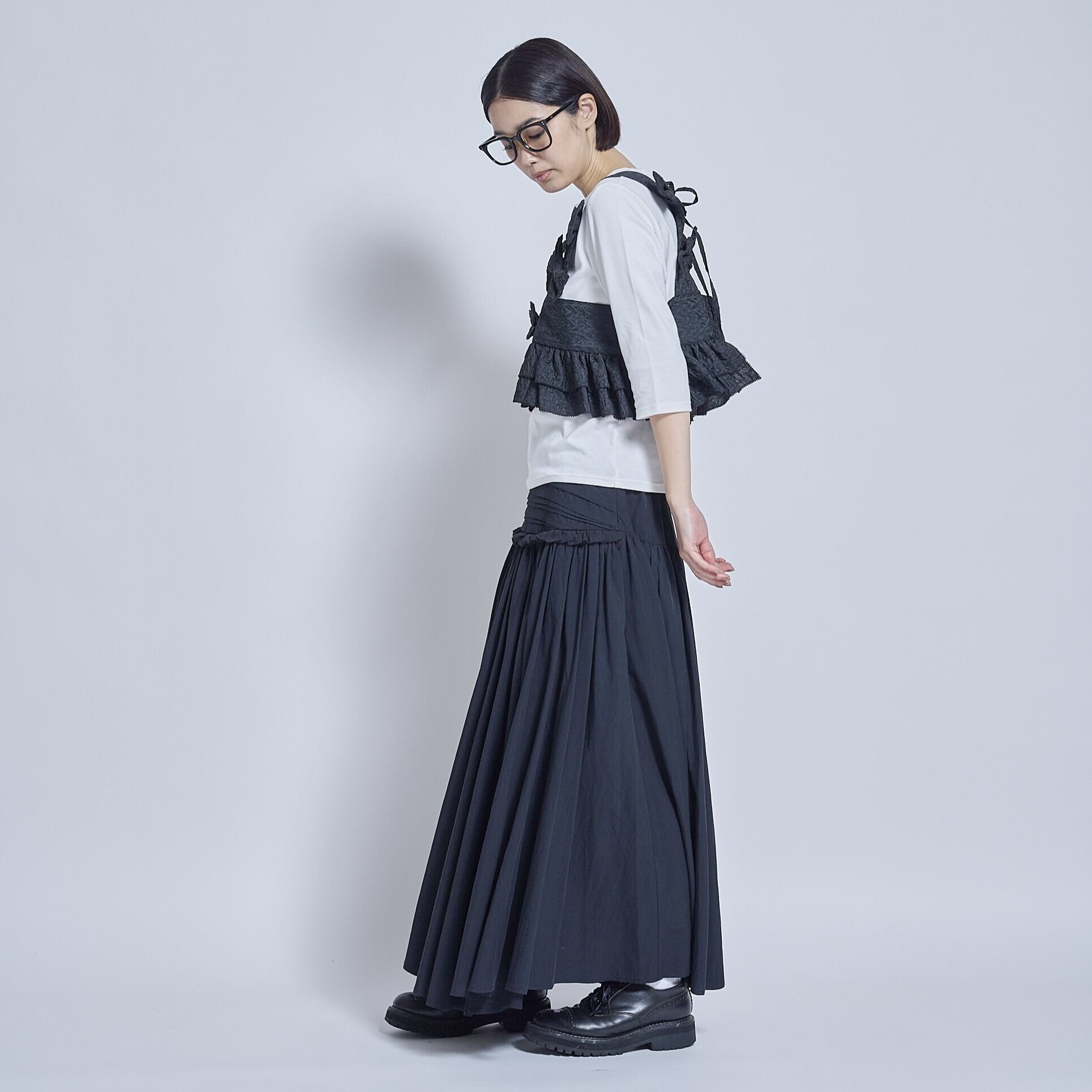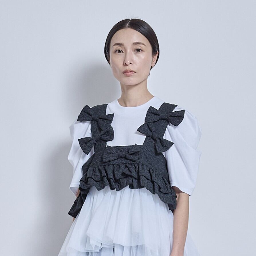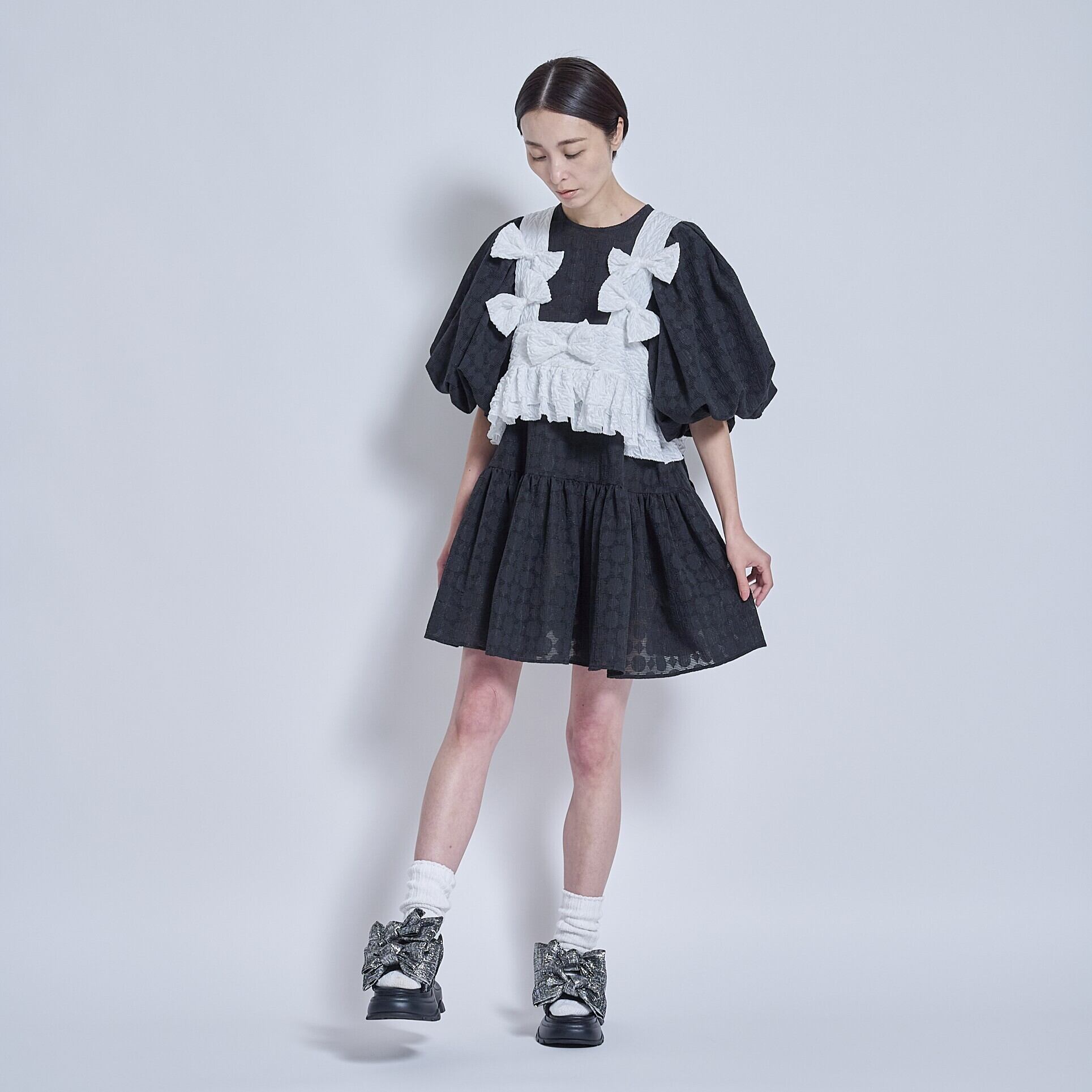 いくつもふっくらとした立体のリボンが付いています。ジャガードの織りでエンボスを表現したリーフ柄の素材です。少しシアー感があるのを重ねて透け感のないものにしました。ビスチェの裾にフリルを付けています。ちょっと物足りないトップスに遊びとモードさがあるアイテムです。大げさにリボンが付いて、ちょっとうるさいほどですが、あるとオールシーズン使えて楽しいかもしれません。
