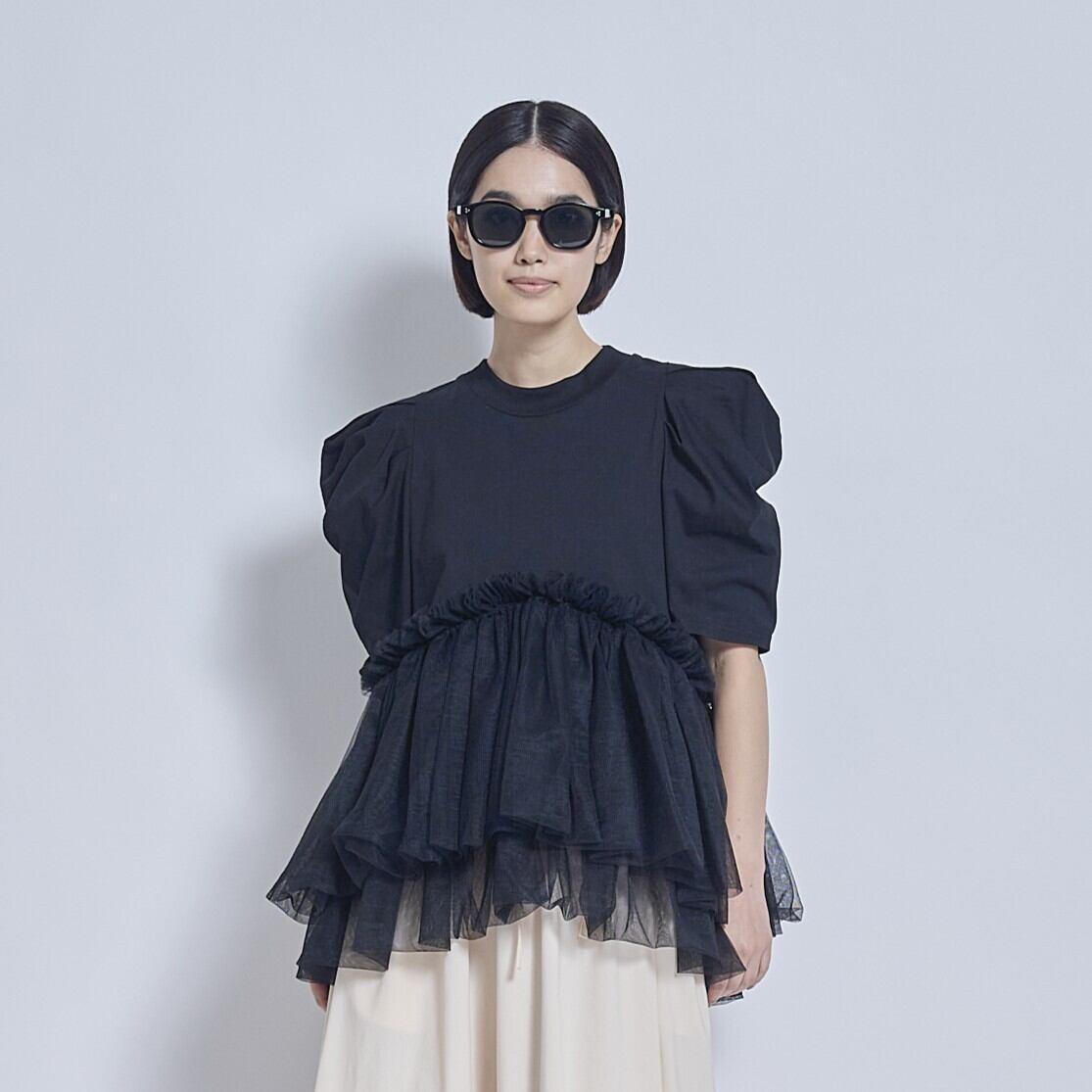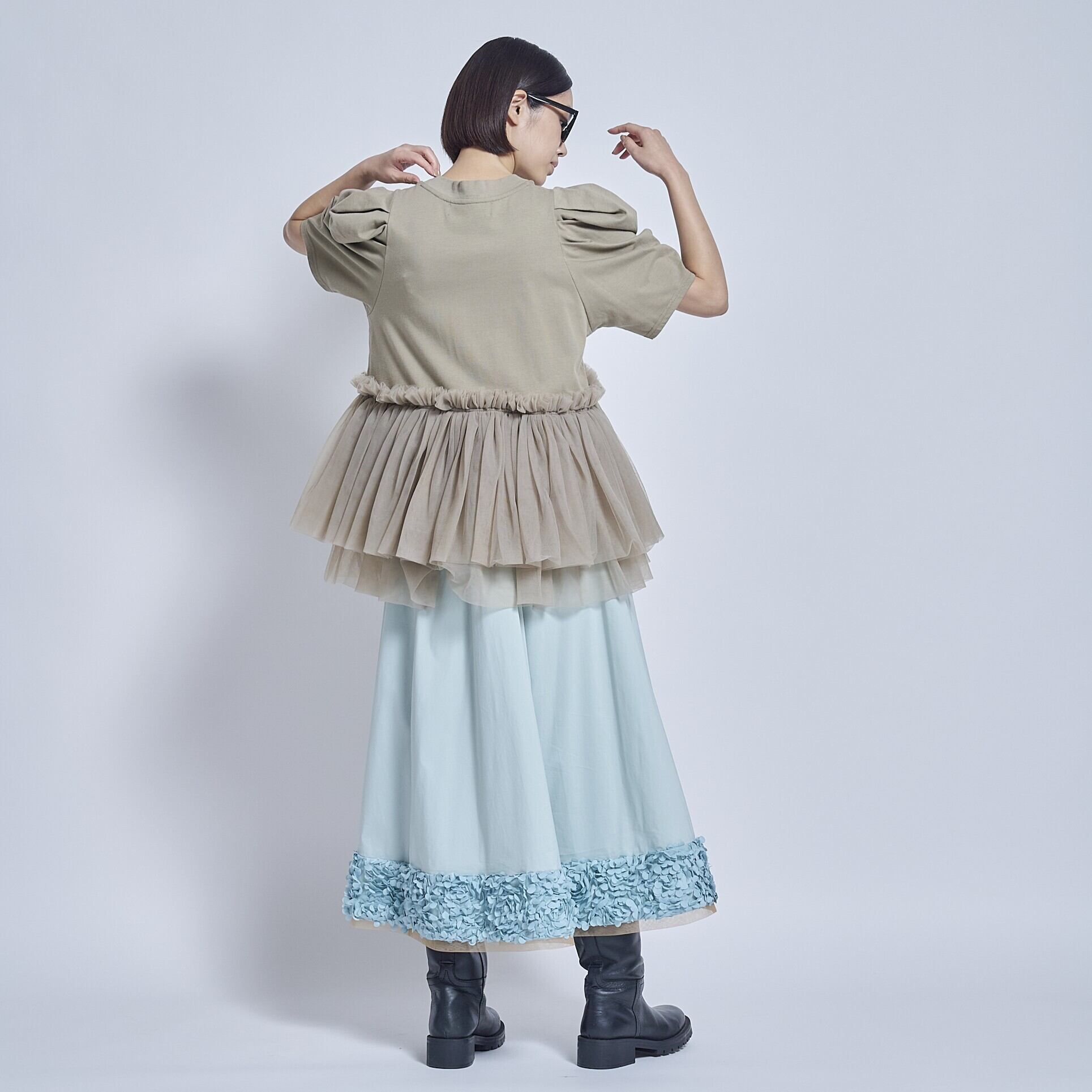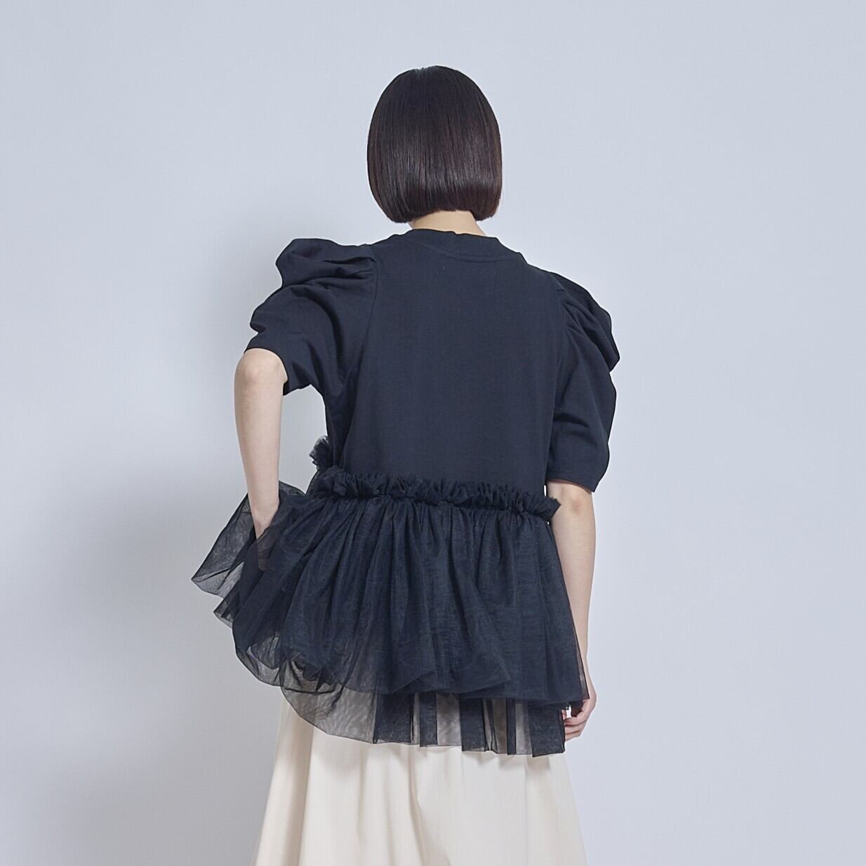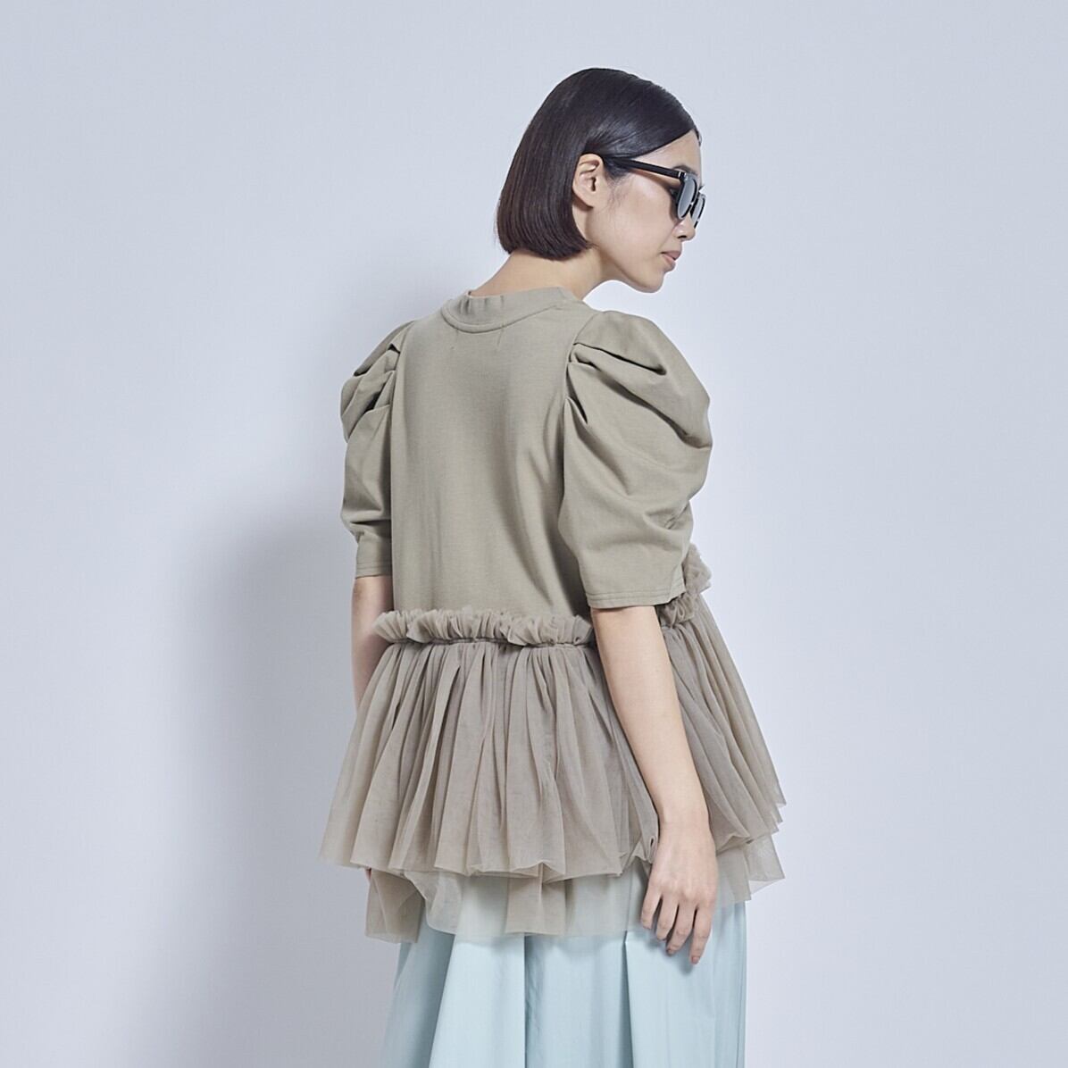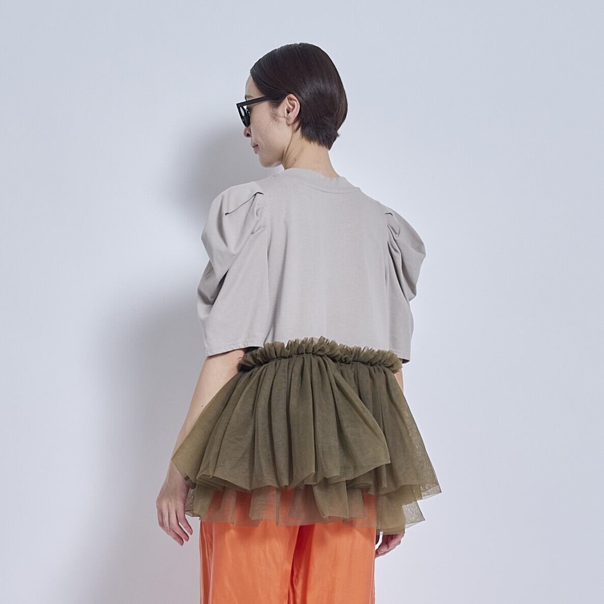 今回は胸下からチュールを重ねたインパクトのあるデザインに変更を加えてみました。身頃は94cmあり、かなり大きめ。肩が内側に入っていて、パフが飛び出していますが、肩ハリさんが、こぞって好んで色違いで購入していて、長年大ヒットの形になっています。胸下からチュールが2枚輪になってギャザーを寄せて付けています。お腹周りが気になる方、ヒップが隠れるので、ヒップ周りに生地がのっていると安心する方、カバーできて秀逸のデザインです。少し大袈裟なチュールですが、このボリューム感が非常にモードな雰囲気でとにかく気に入っています。