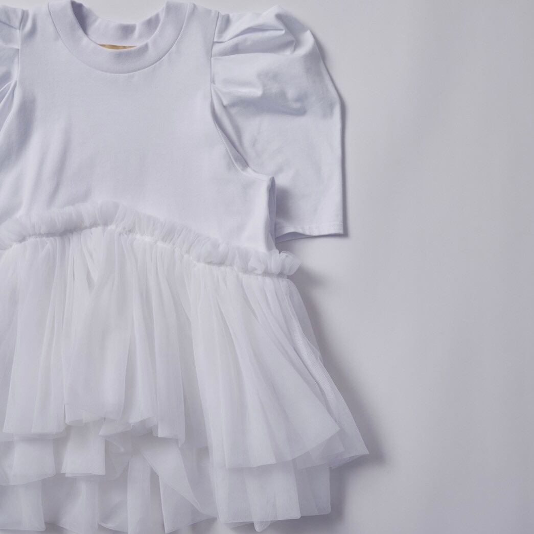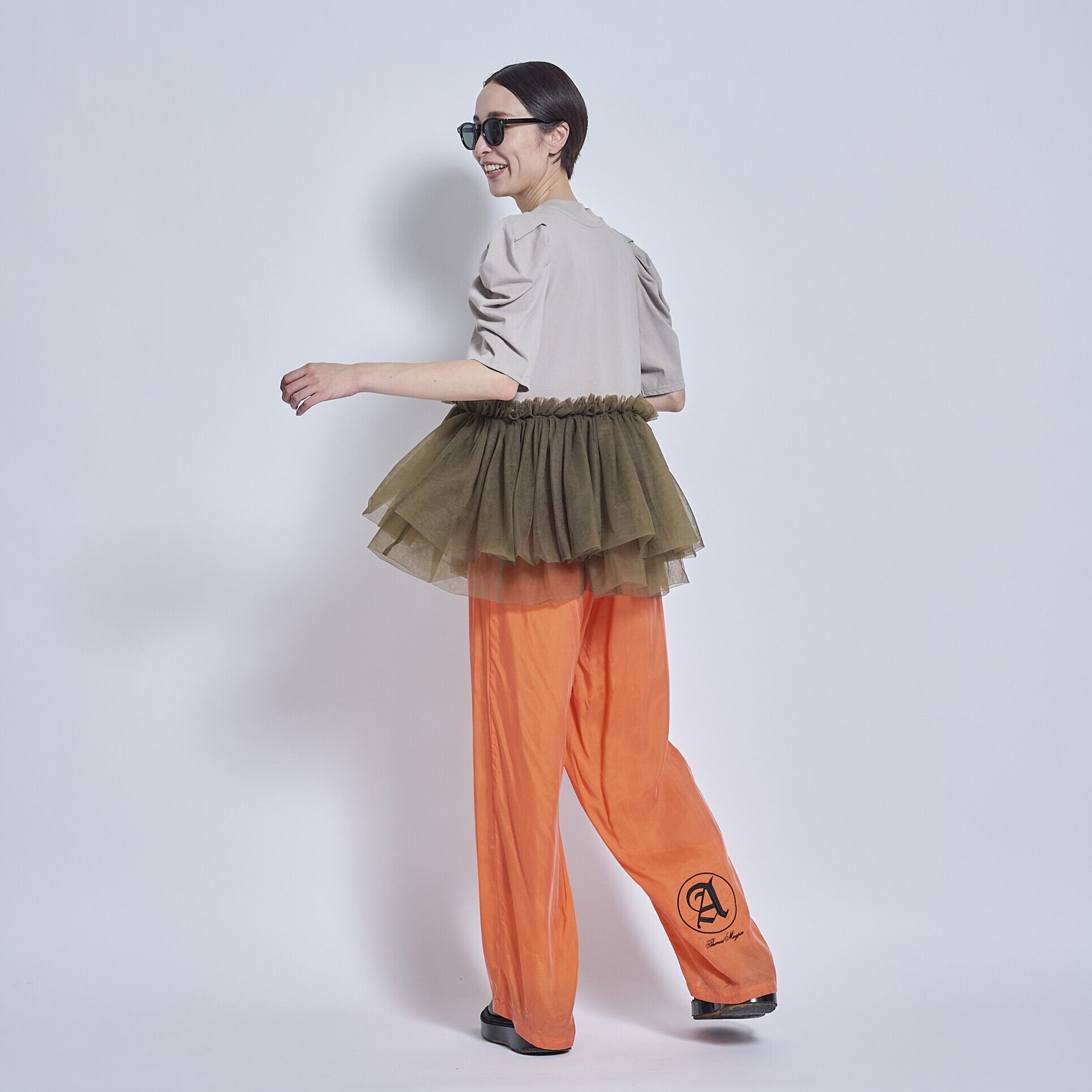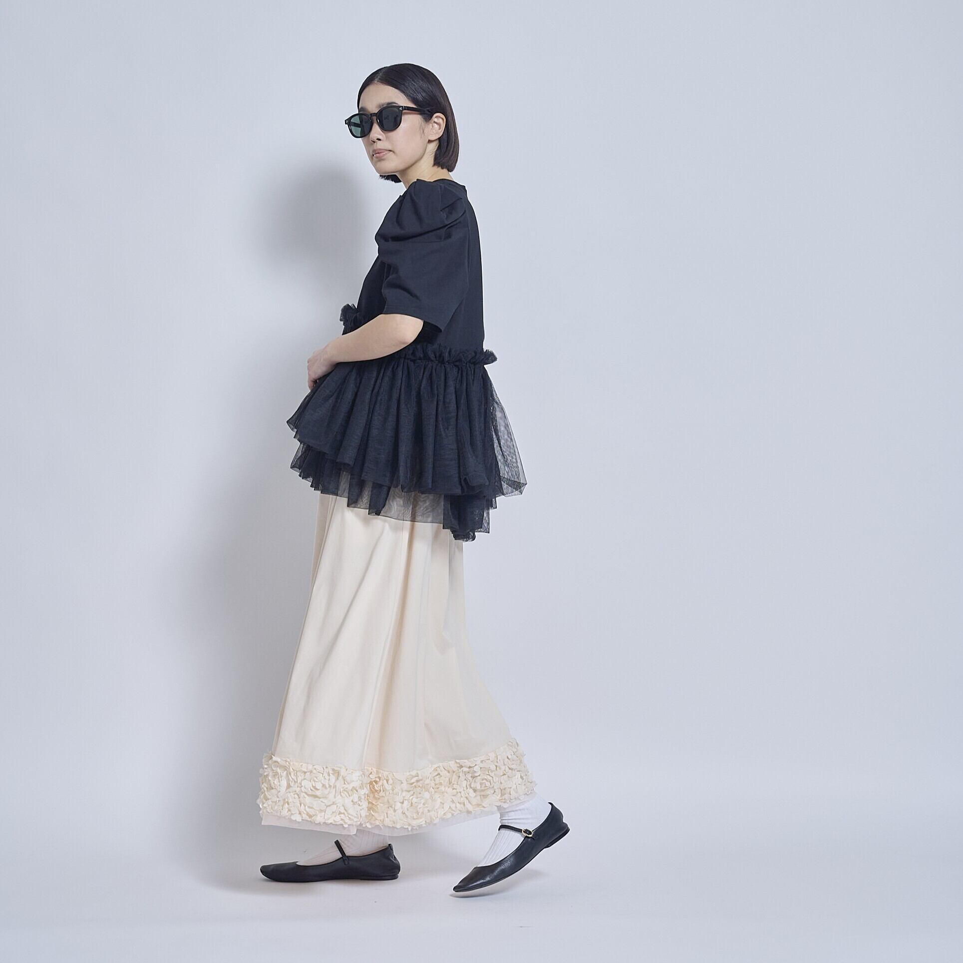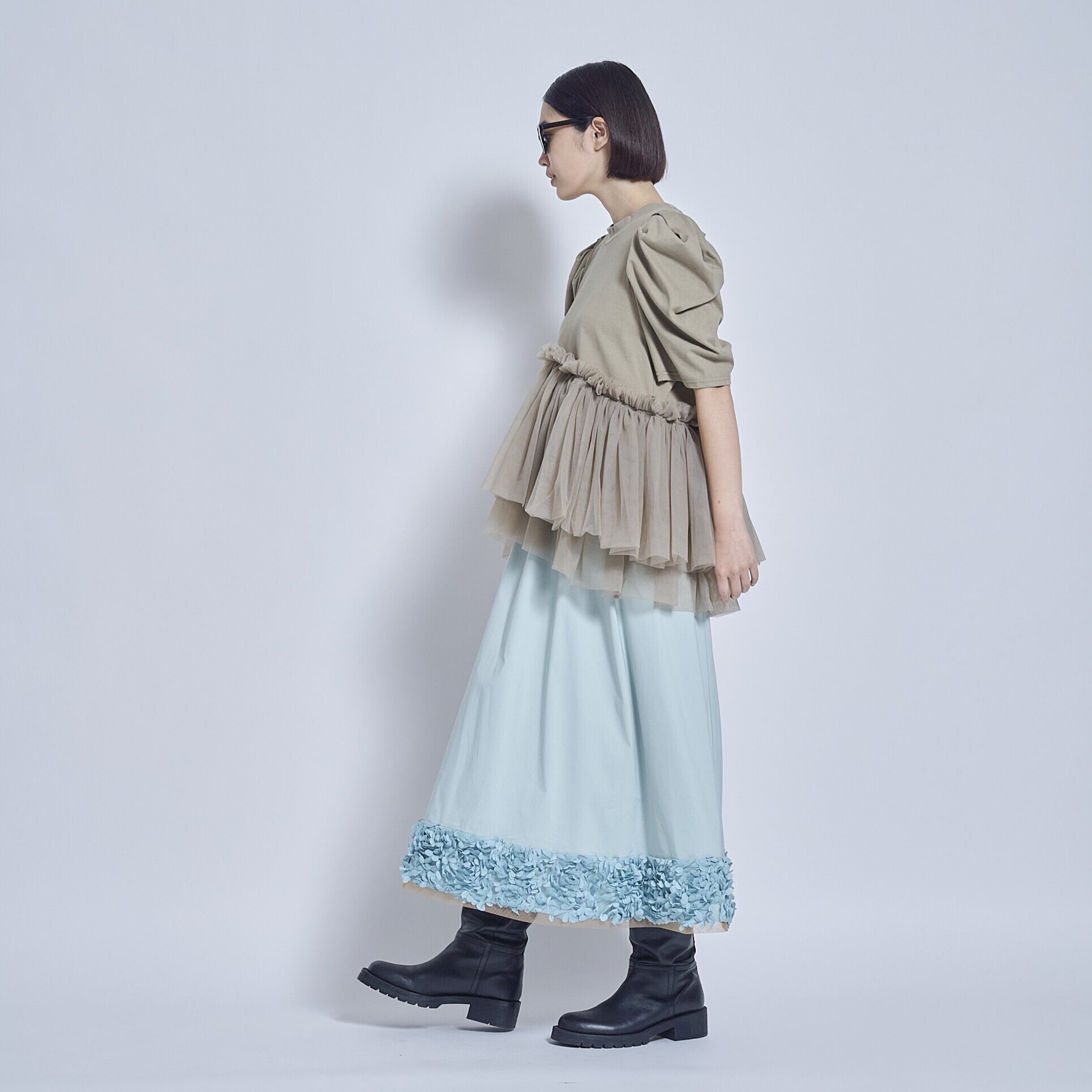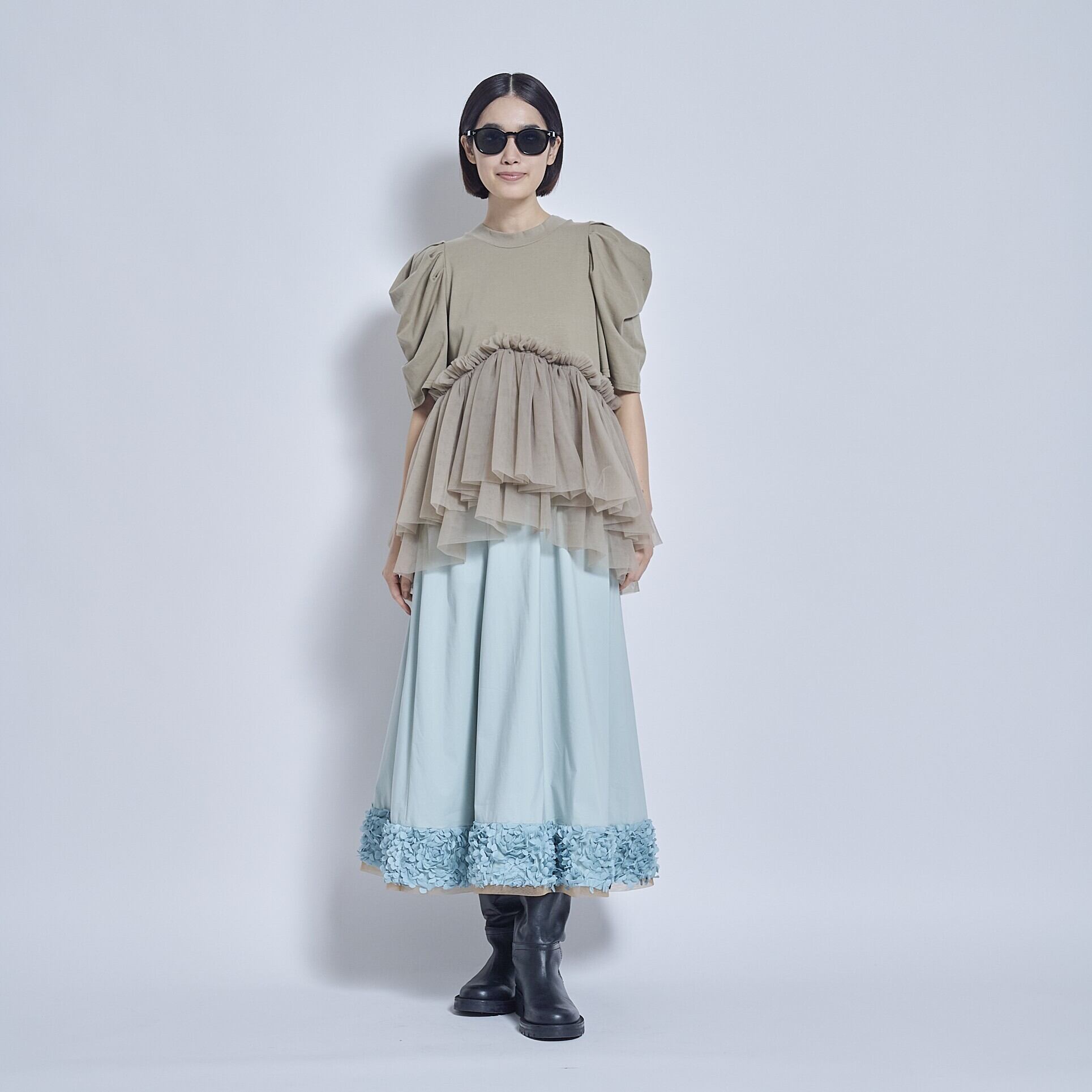 今回は胸下からチュールを重ねたインパクトのあるデザインに変更を加えてみました。身頃は94cmあり、かなり大きめ。肩が内側に入っていて、パフが飛び出していますが、肩ハリさんが、こぞって好んで色違いで購入していて、長年大ヒットの形になっています。胸下からチュールが2枚輪になってギャザーを寄せて付けています。お腹周りが気になる方、ヒップが隠れるので、ヒップ周りに生地がのっていると安心する方、カバーできて秀逸のデザインです。少し大袈裟なチュールですが、このボリューム感が非常にモードな雰囲気でとにかく気に入っています。