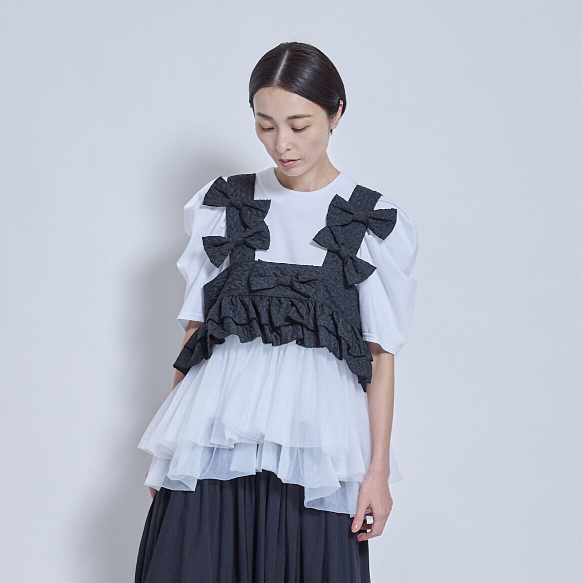 お勧めは白黒、両方です。このカットソーには、リボンビスチェがとても合います。ホワイトのカットソーにはブラックのビスチェ、ブラックのカットソーにはホワイトのビスチェが映えて可愛かったです。お好きなかたがいらっしゃったら、セットで購入してもらえたら嬉しいなと思っています。モデルのルックを参考にしてみてください。