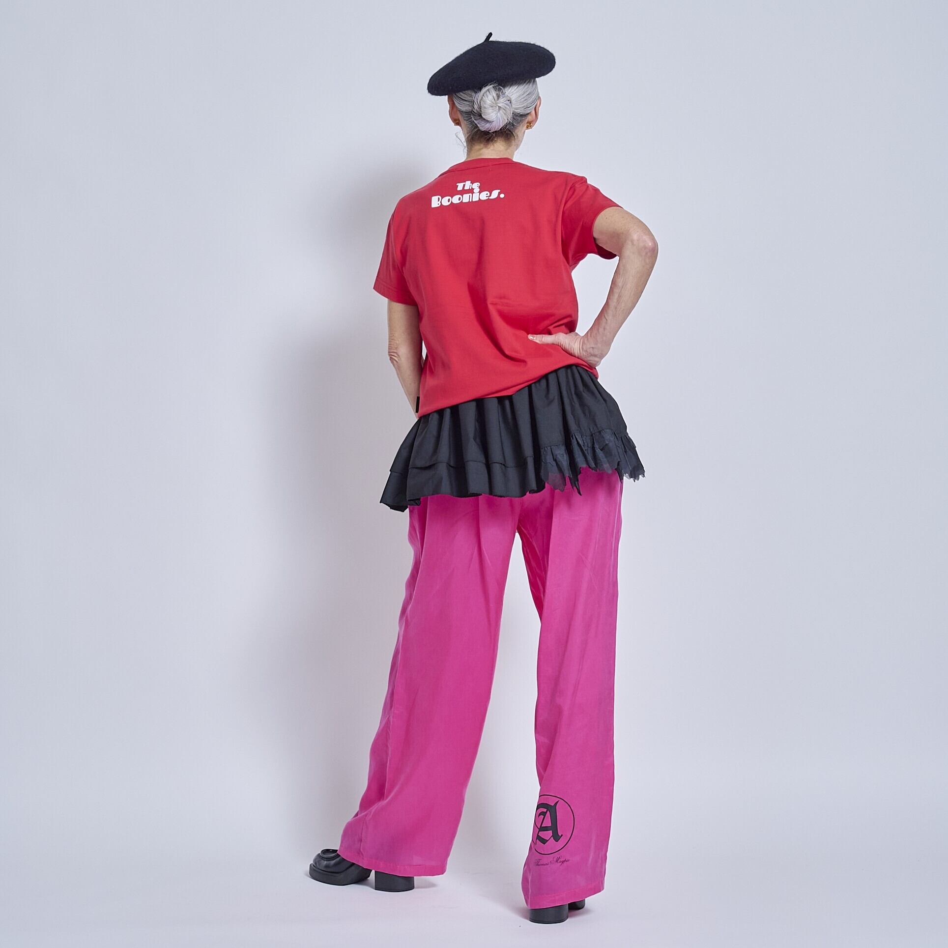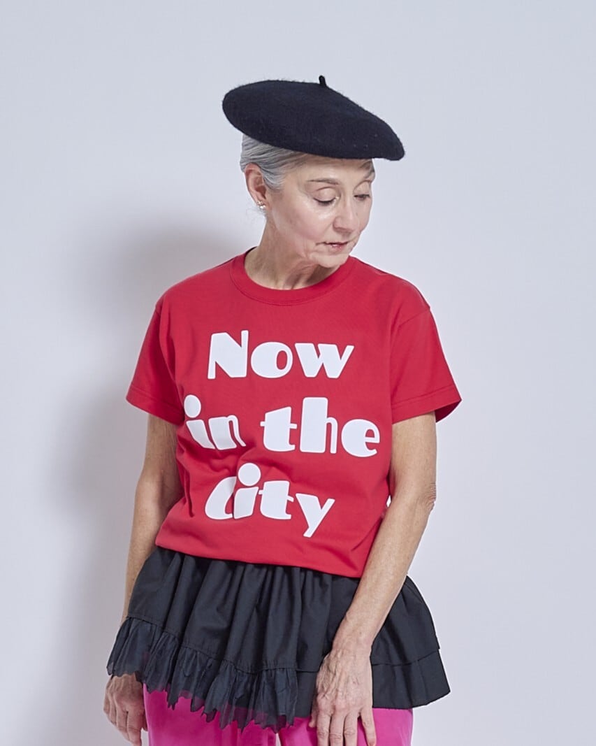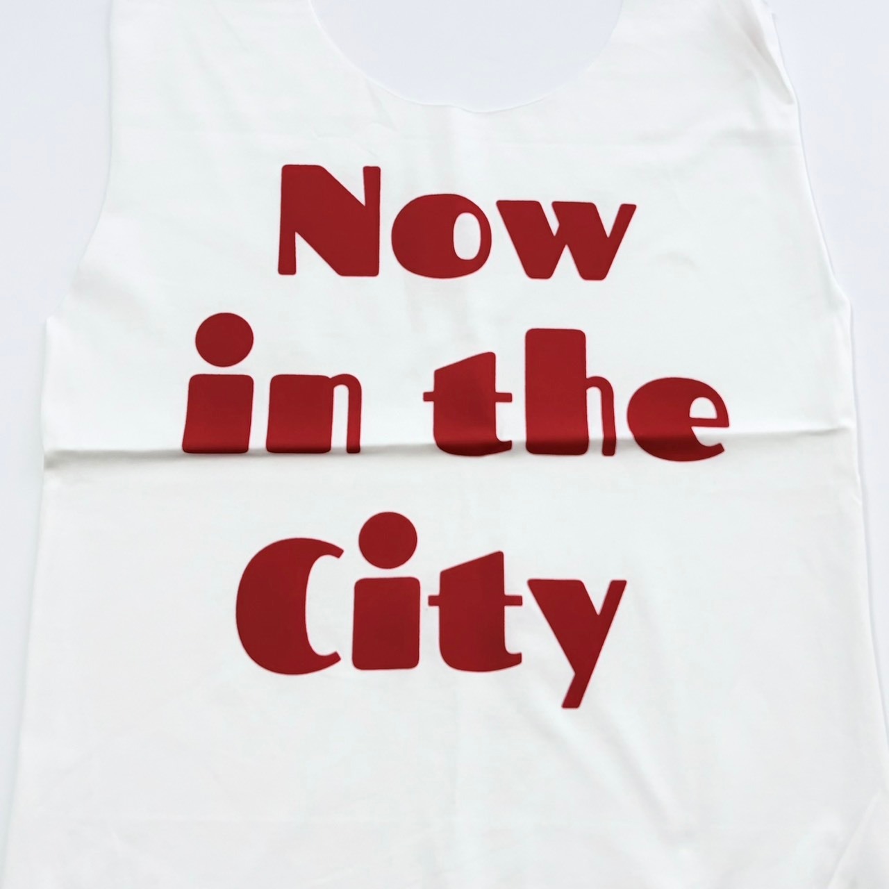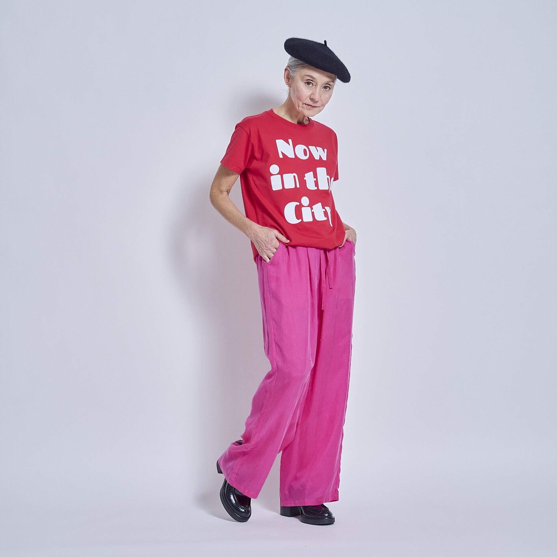 ロゴはNOW IN THE CITY 今は都会に住んでるけどね、という意味合いのロゴをフロッキープリントで入れています。ちょっと80年代風のポップなフォントが特徴です。最近ブームのフォントが常にあります。80年代のかわいいフォント、幼少期に田舎で見ていた頃のフォントと組み合わせています。トキシック(蛍光)ピンクの少し浮き出てぽってりしているフロッキープリントがとても良い感じに仕上がりました。今回は、このピンクロゴに合わせて、予約販売中のキュプラのトキシックピンクのパンツがベストマッチでお勧めです。