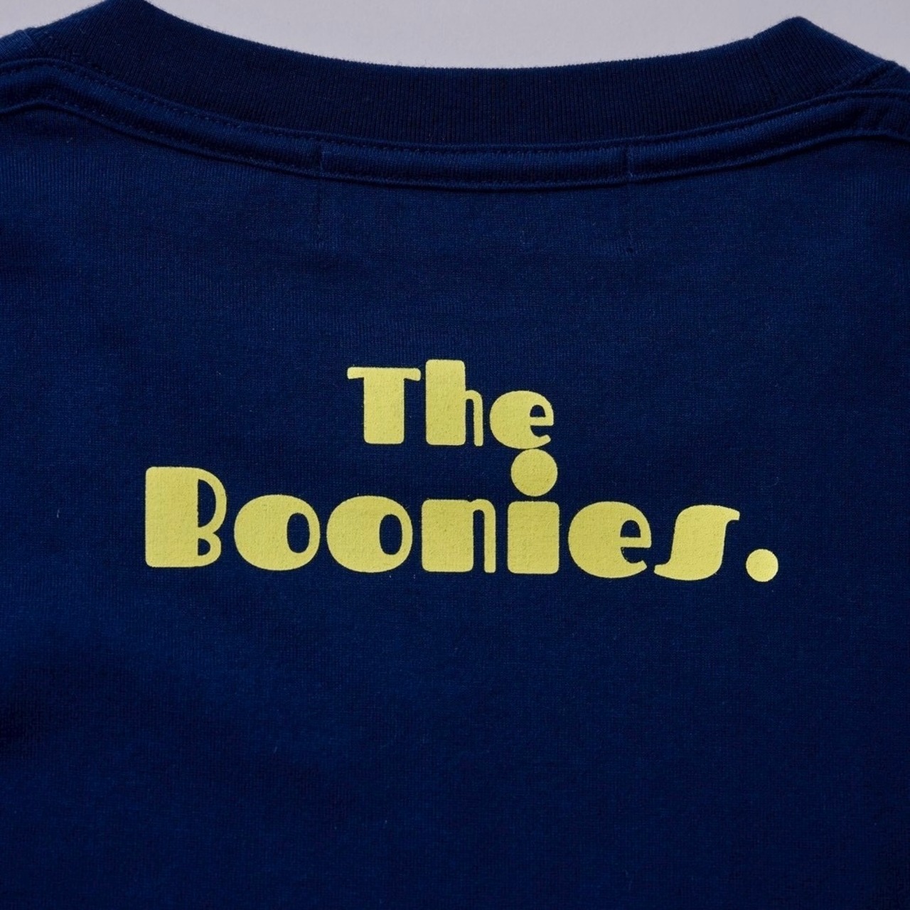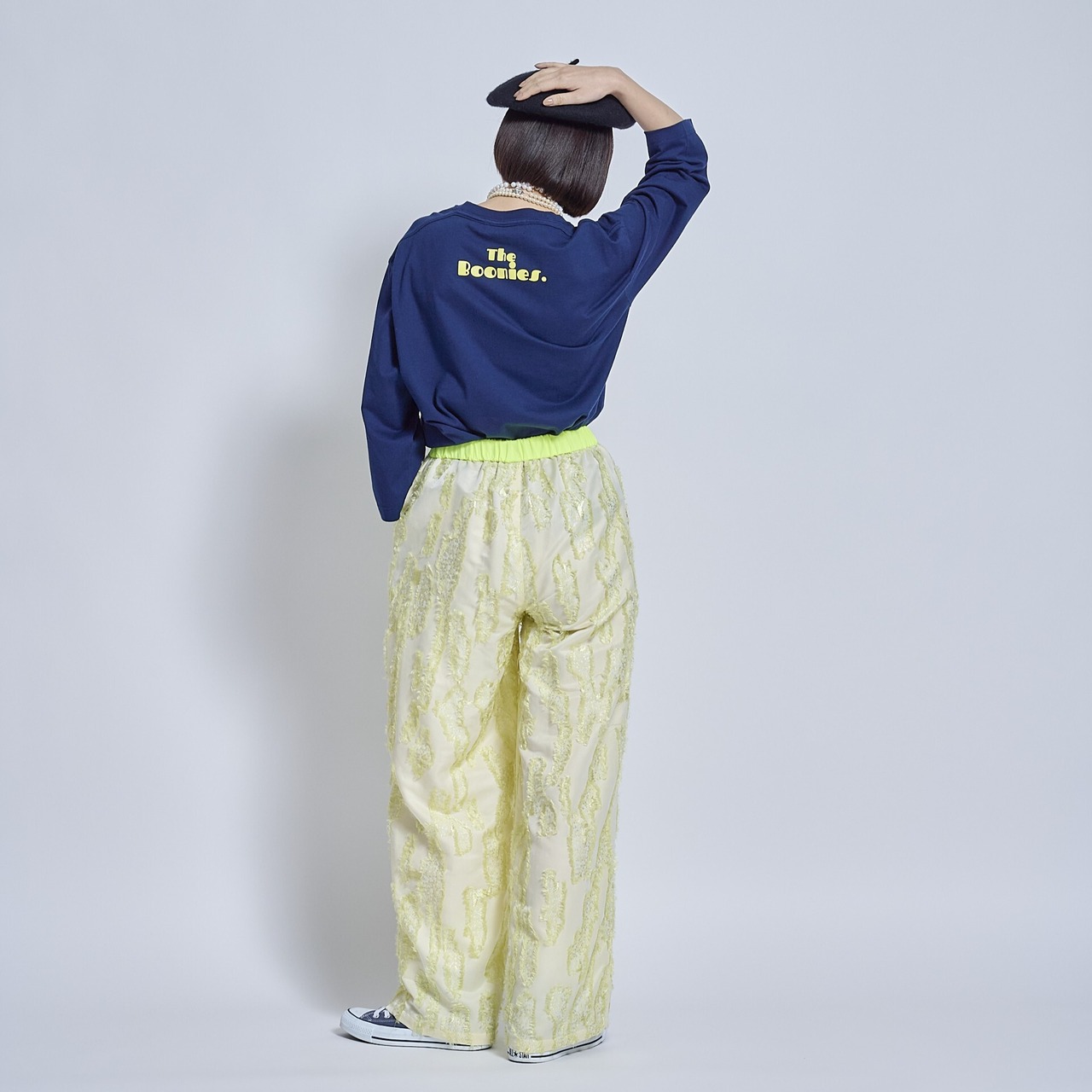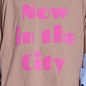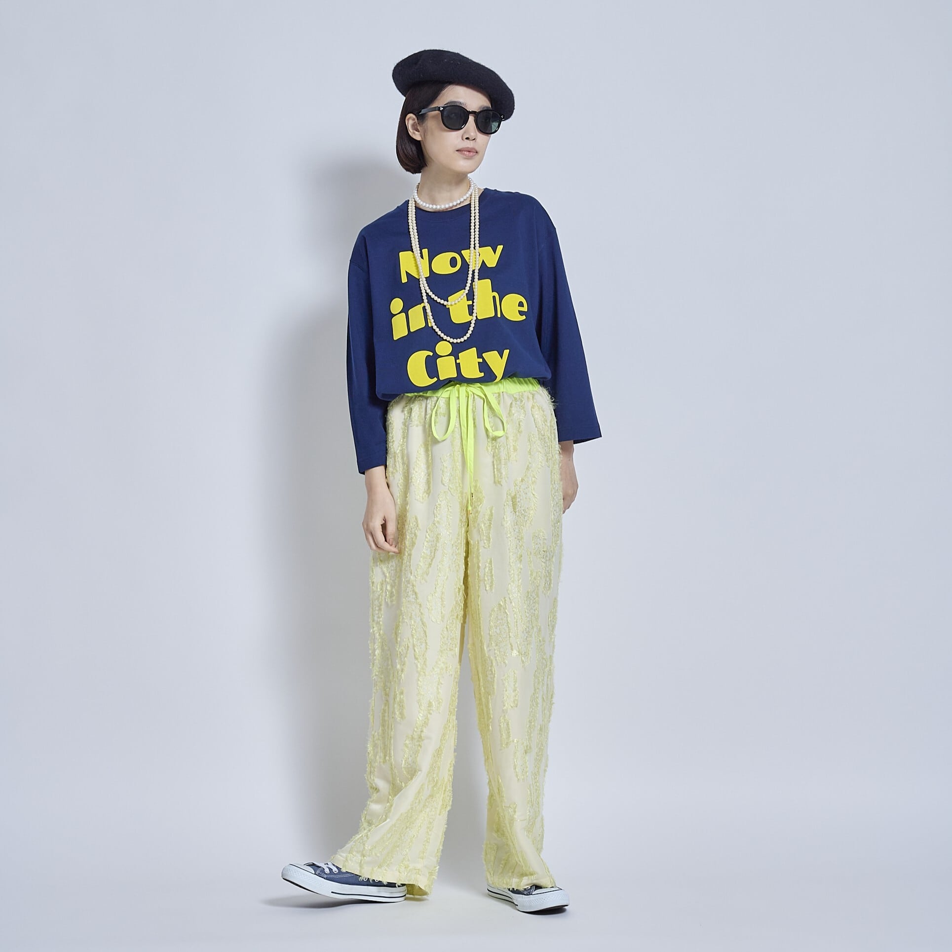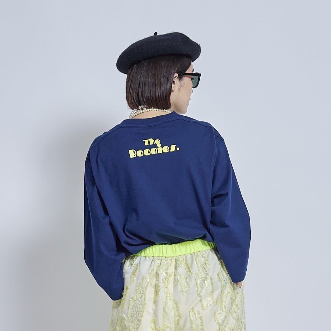 フロッキープリントが真っ黄色でクリアなカラー。ロゴはNOW IN THE CITY 今は都会に住んでるけどね、という意味合いのロゴです。ちょっと80年代風のポップなフォントが特徴です。最近ブームのフォントが常にあります。今は80年代のかわいいフォント、幼少期に田舎で見ていたフォントと組み合わせています。クリアなイエローの少し浮き出てぽってりしているフロッキープリントがとても良い感じに仕上がりました。ネイビーにイエローカラーがベストマッチでとても可愛かったので予約品にピックアップしました。今回は、このイエローロゴに合わせて、予約販売中のジャガードのイエローのパンツがベストマッチでお勧めです。