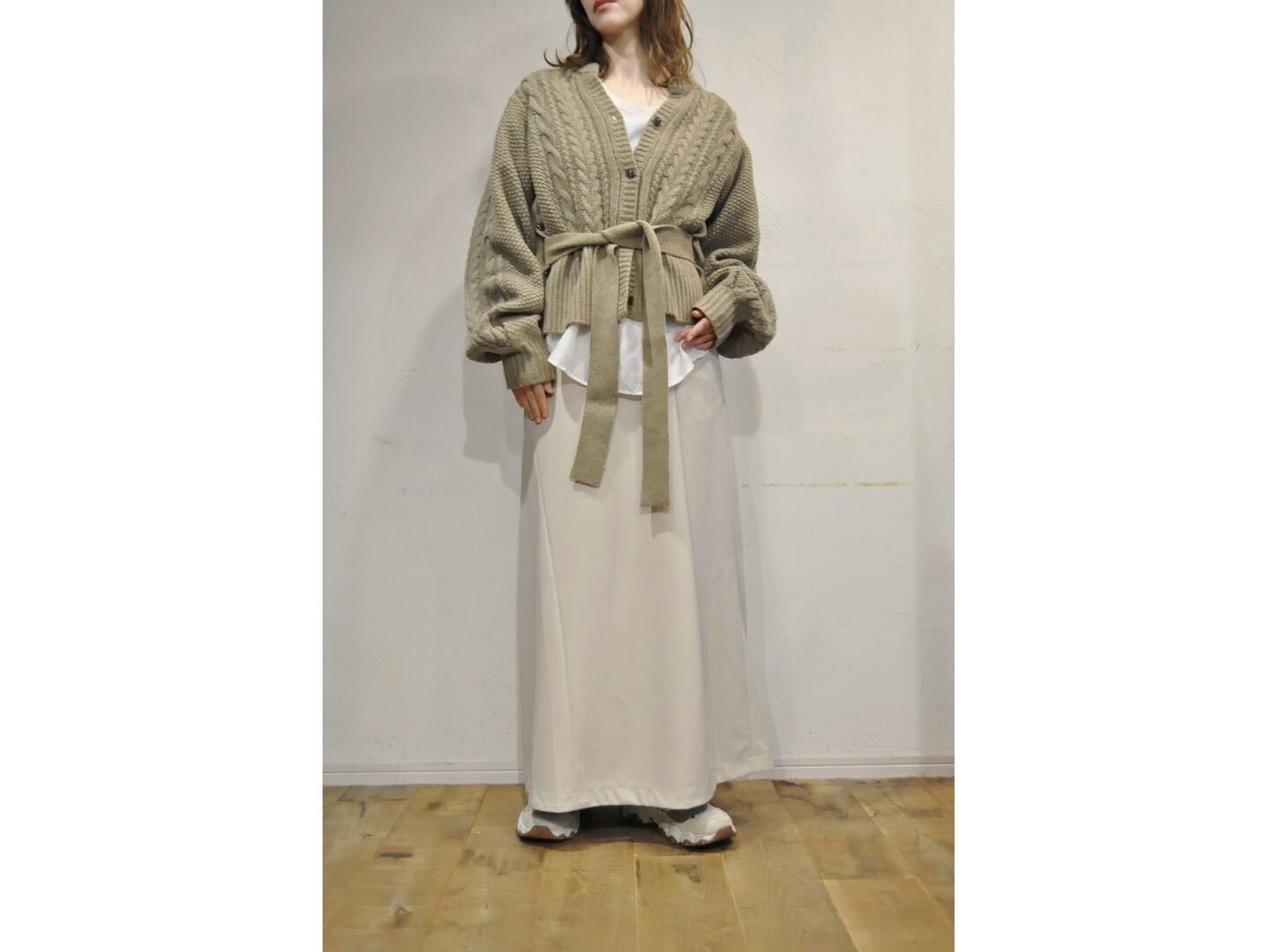クラシックなケーブル編みに、フロントスリットというひねりを効かせた一枚。