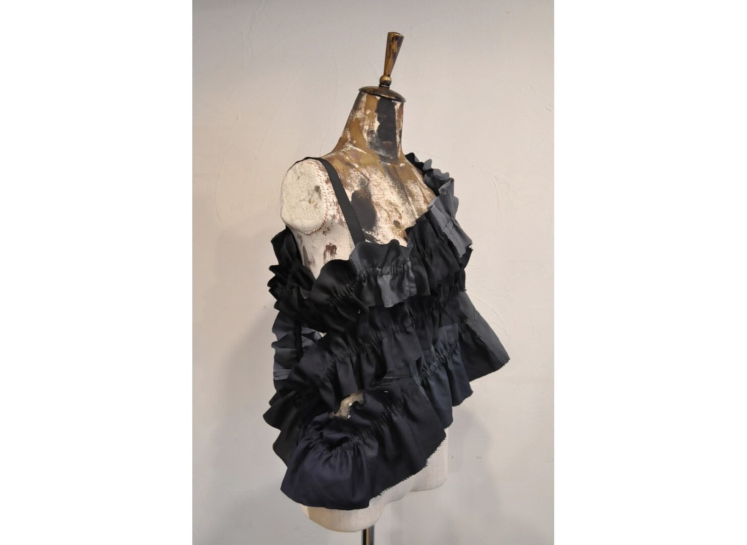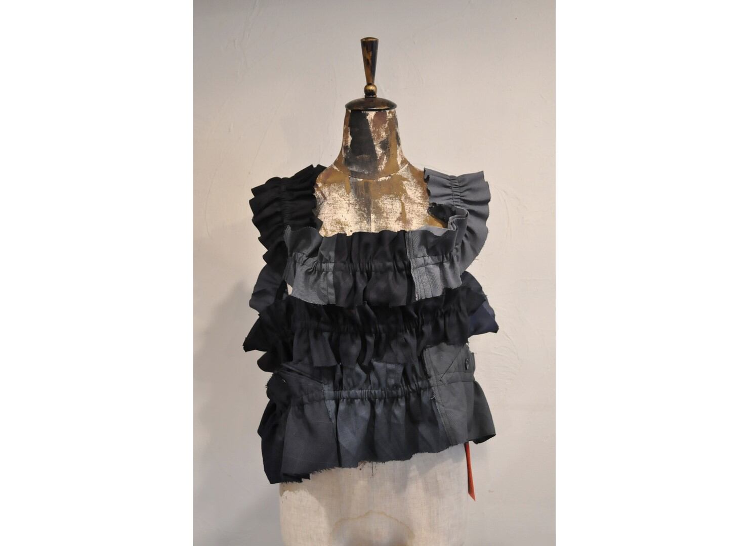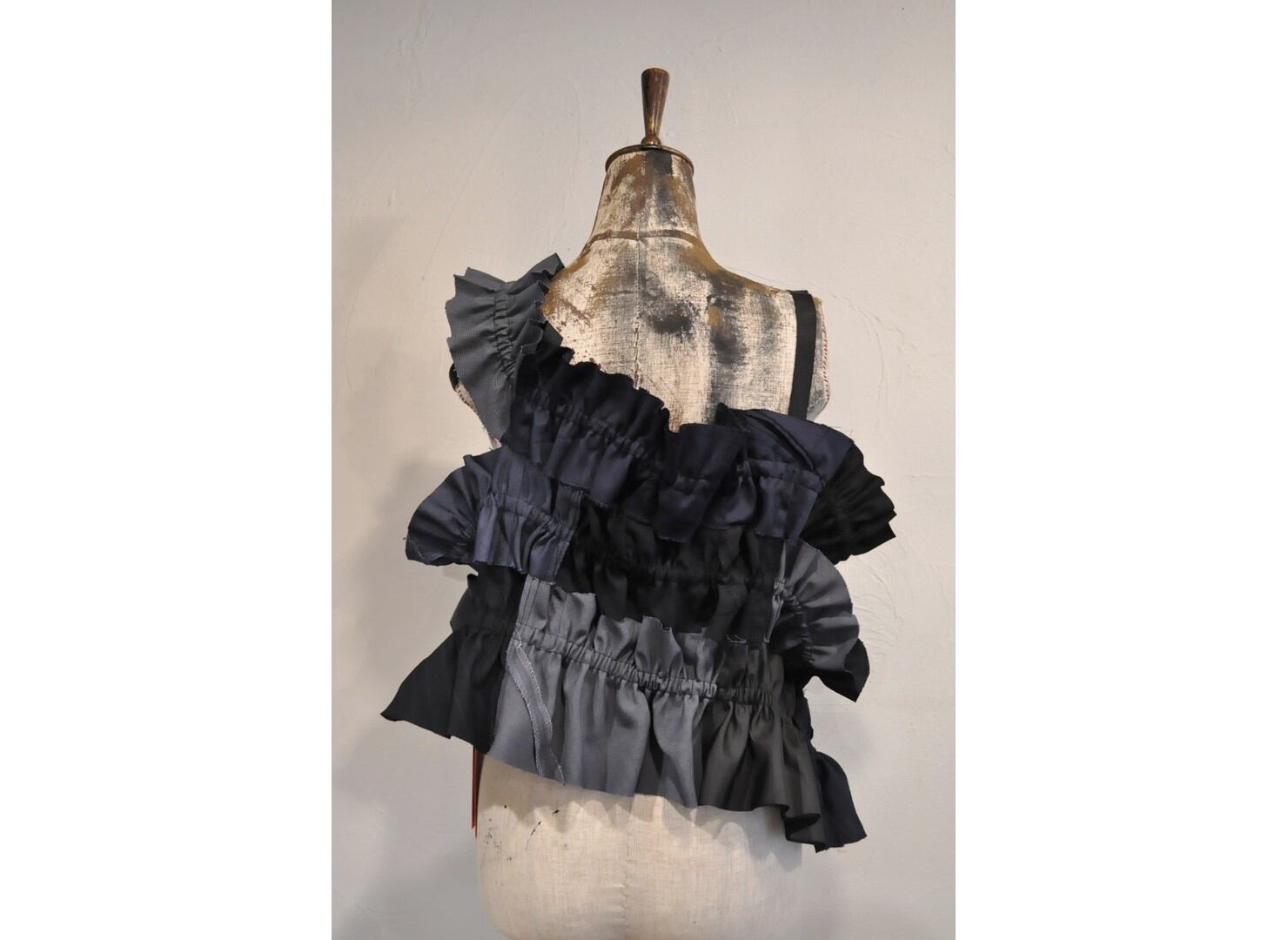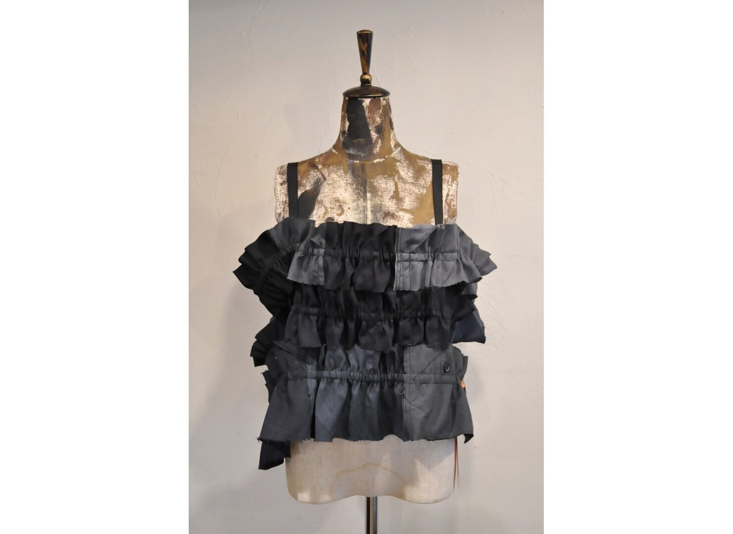 ●様々なスーツパンツの生地を使用して作られたフリルたっぷりのキャミソール。