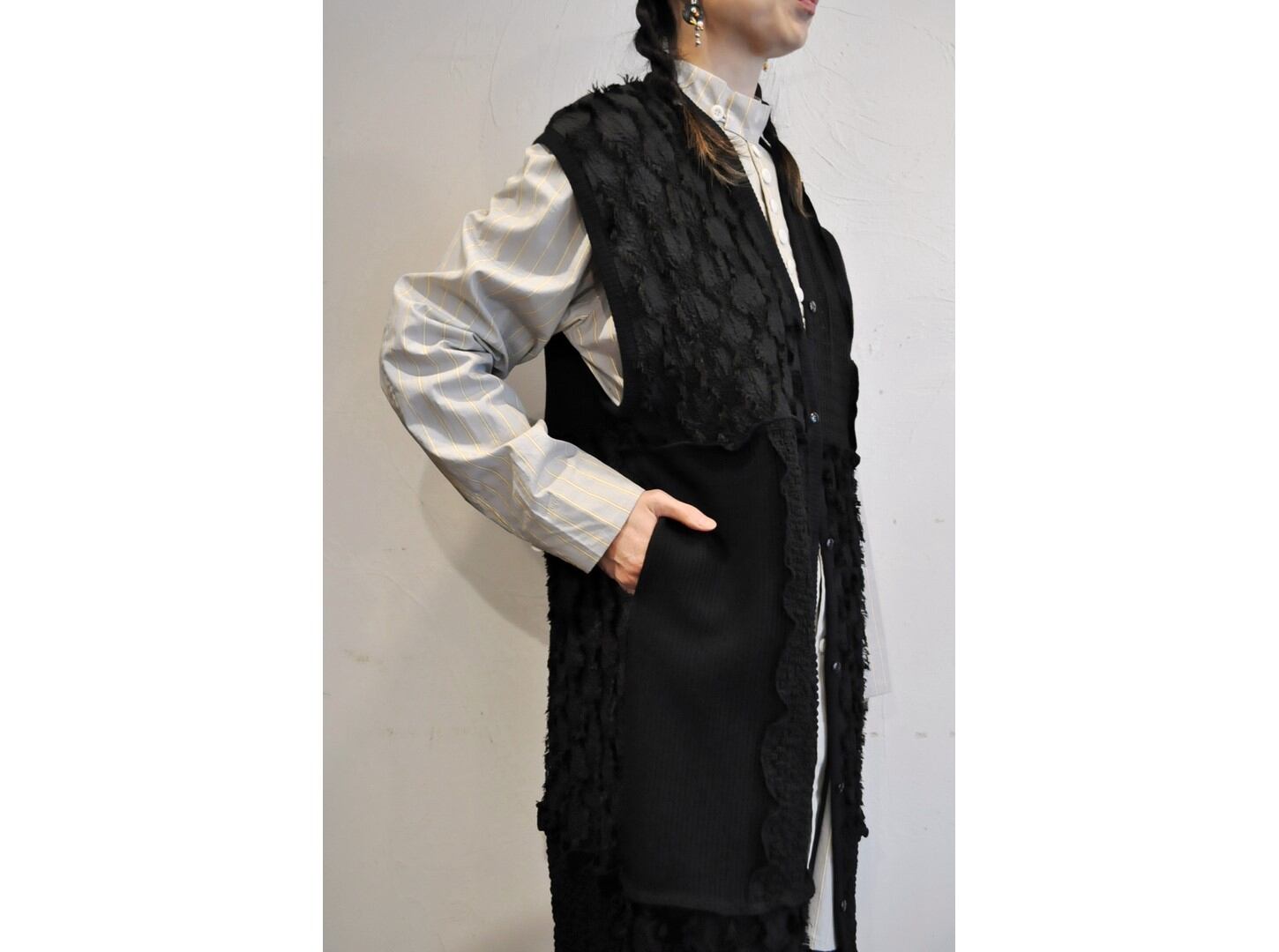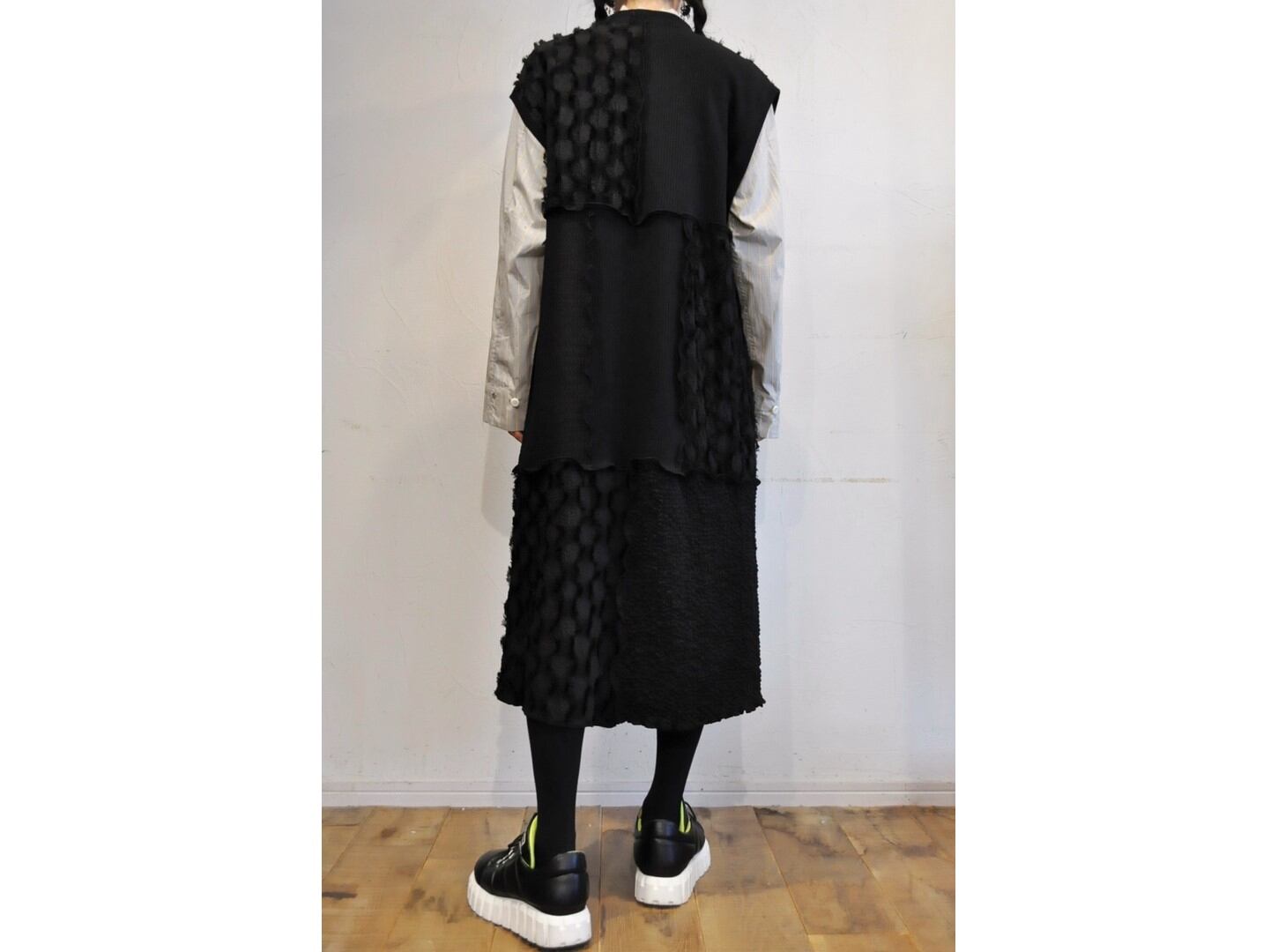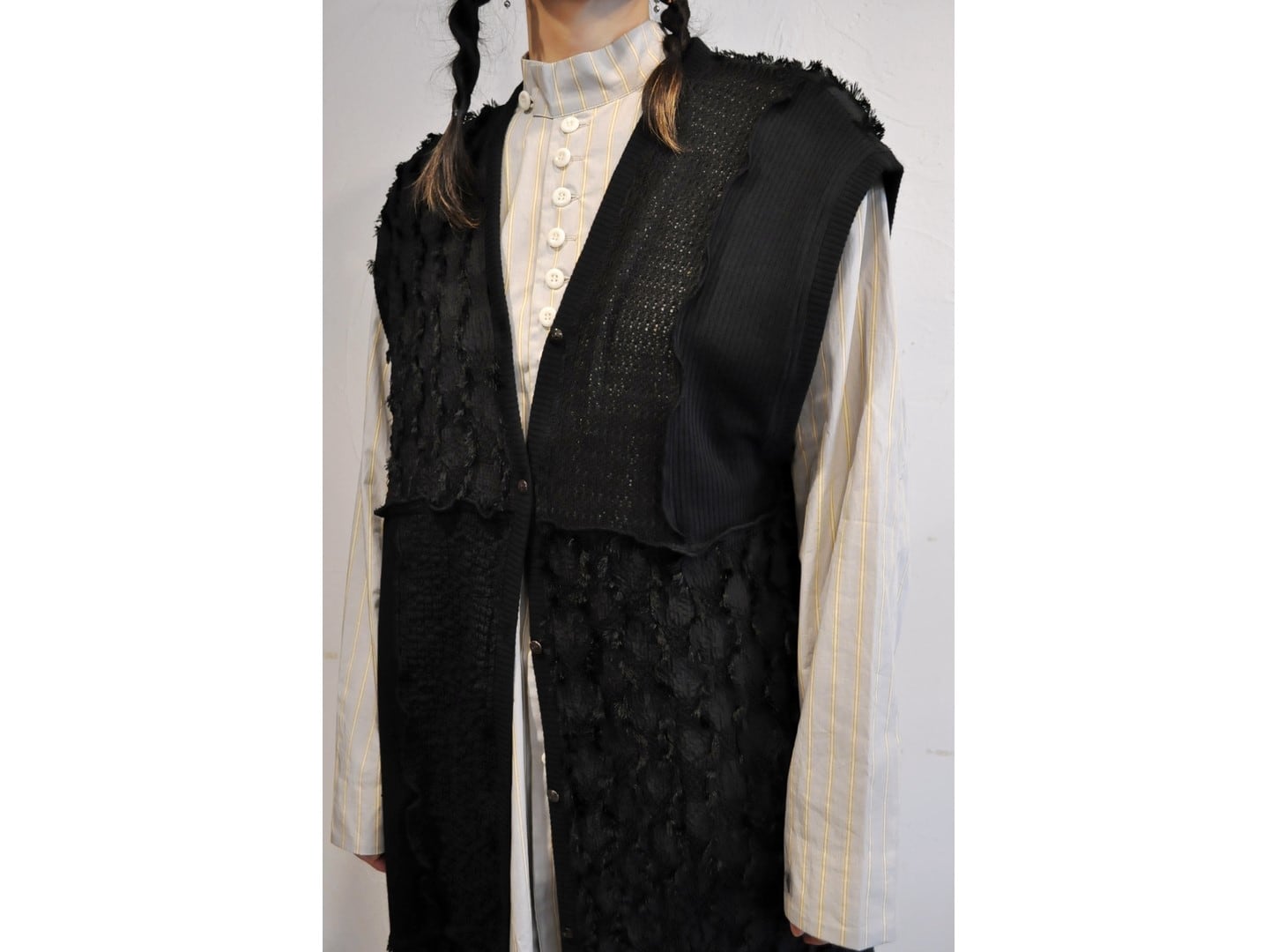 ●ざっくりとした編み地や凹凸のあるニット、リブ素材など、異なる表情のニットを組み合わせて仕立てたロングジレ。