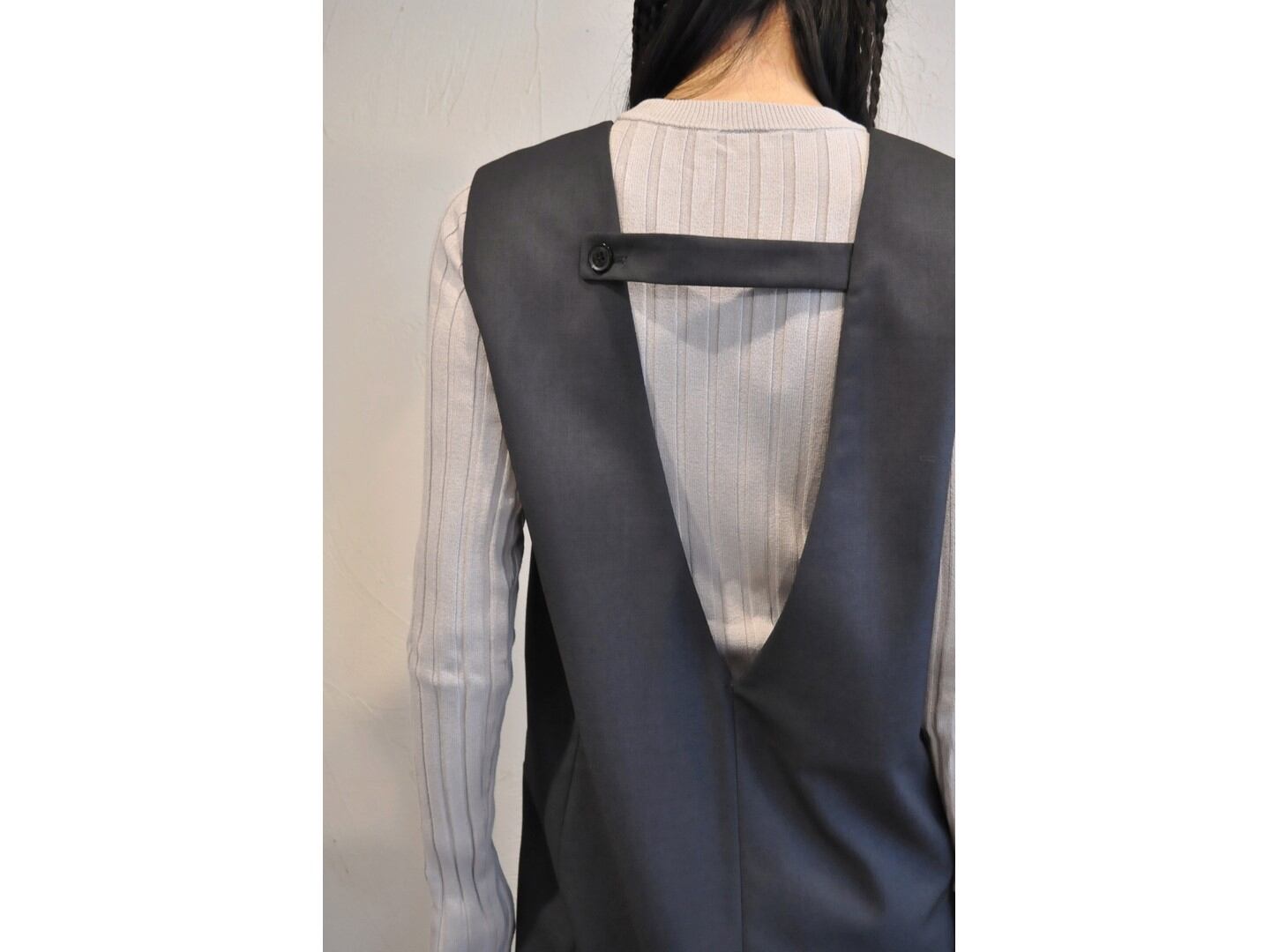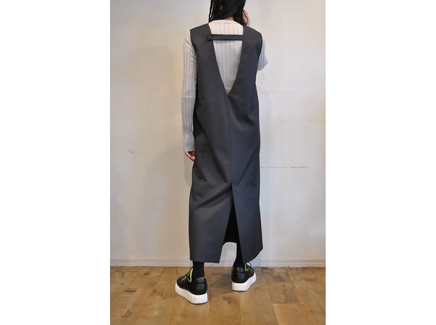 深いVネックでTシャツやニットとの相性が良く、深めのスリットが入っているので足さばきも快適です。