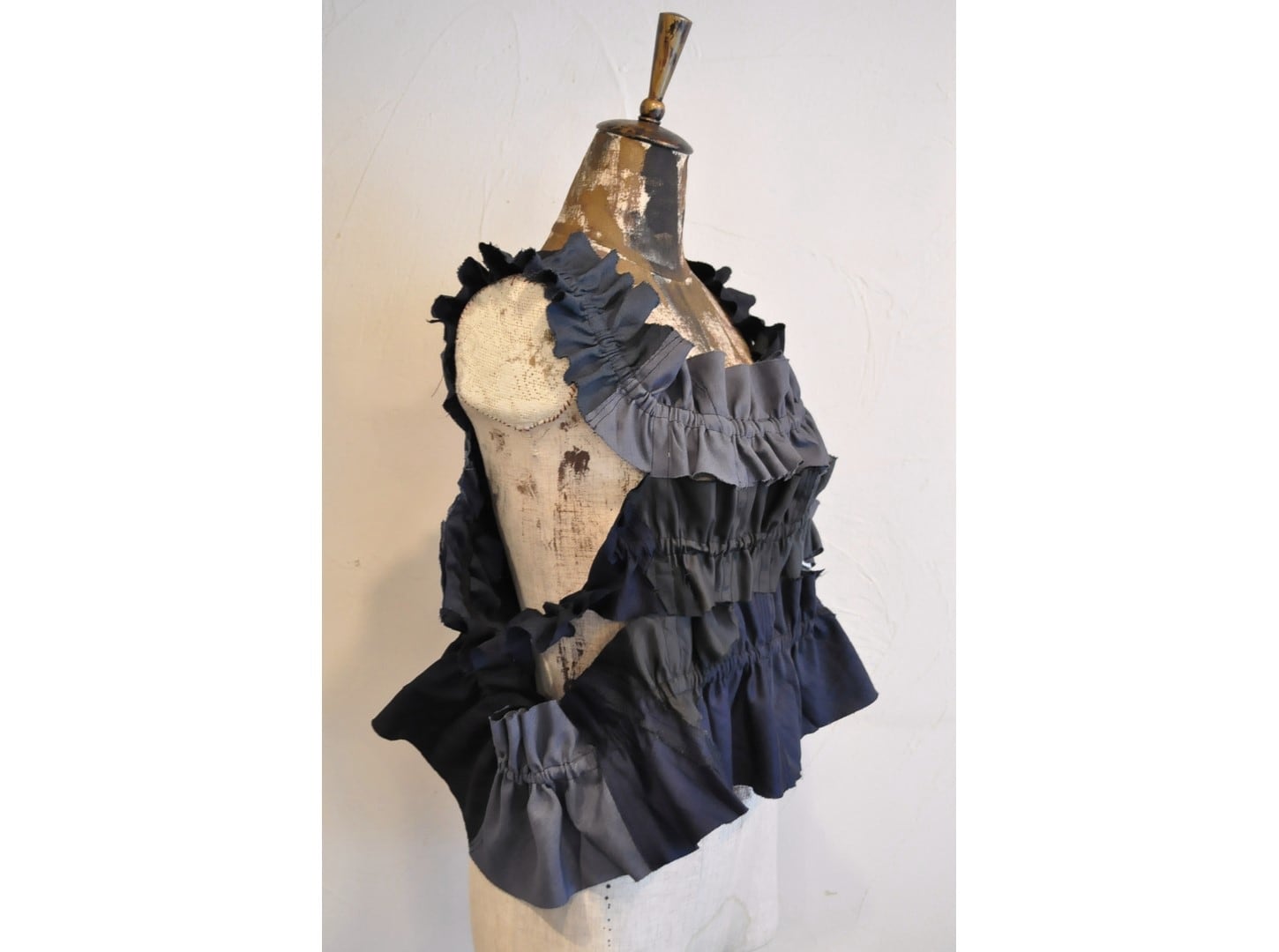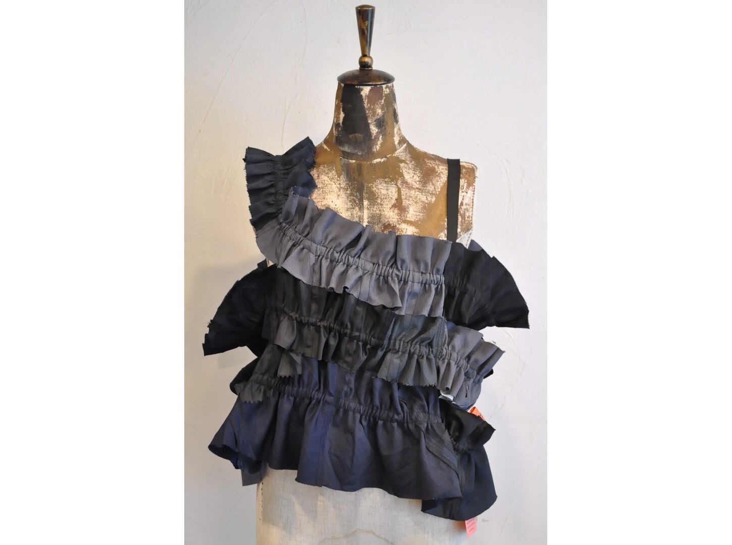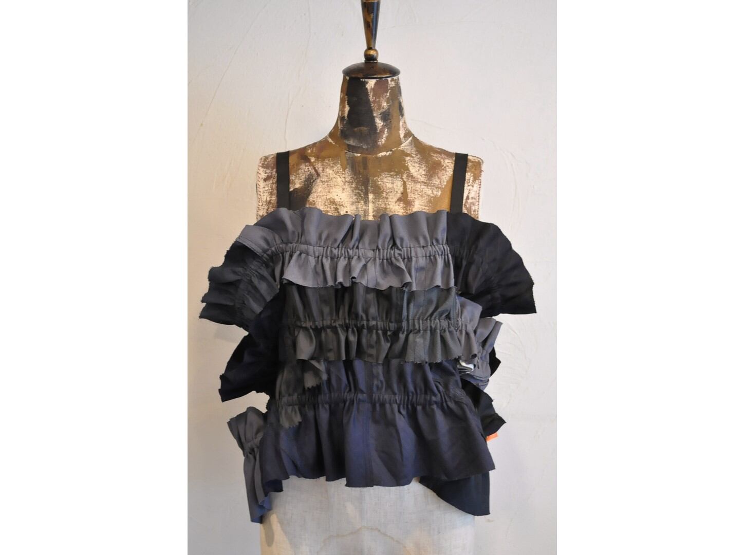 全体にゴムシャーリングを施し、フリルパーツをつなげたデザイン。