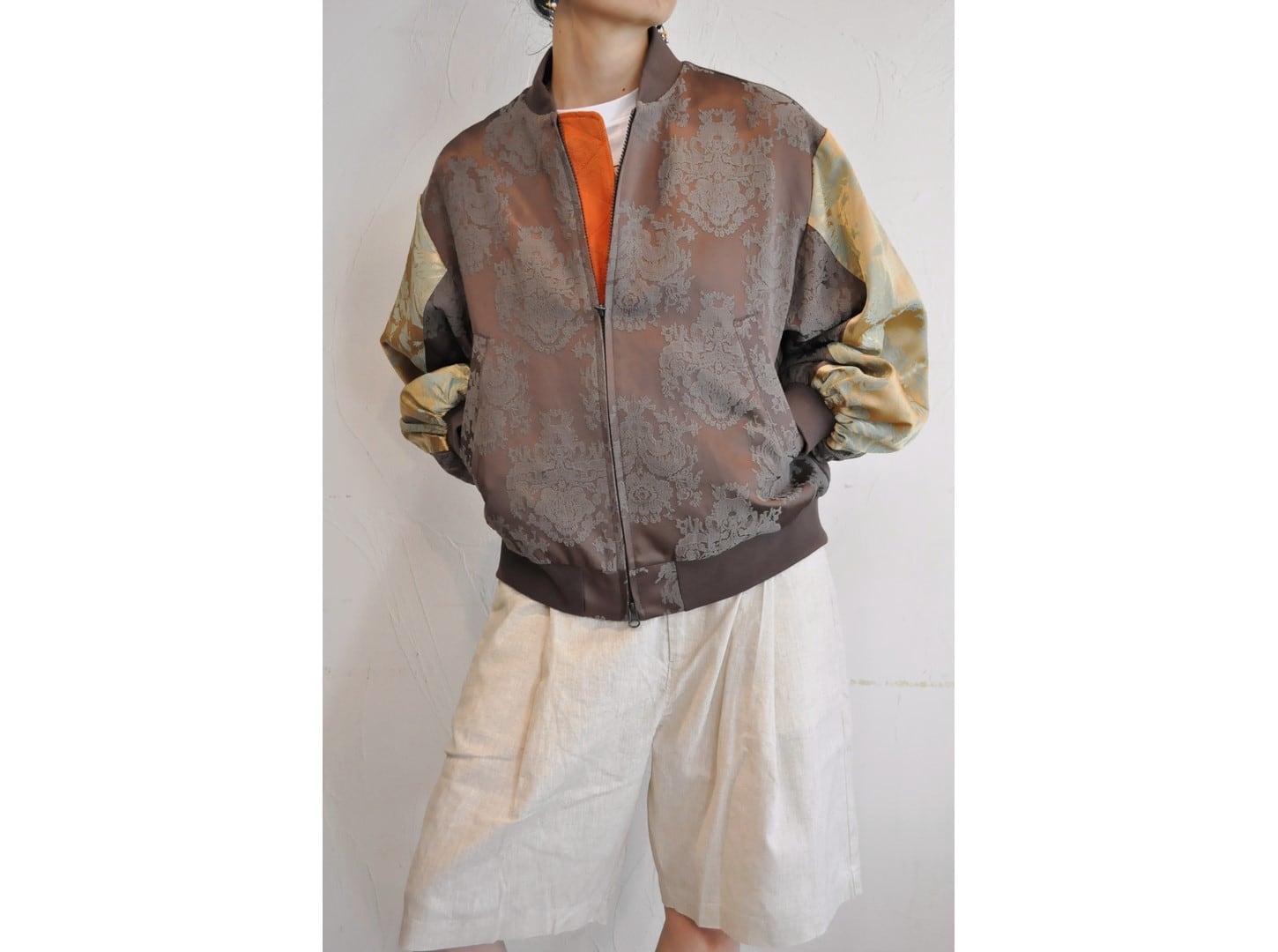 ゆったりとしたシルエットで、袖とフロントに別のジャガード生地を使用した切り替えデザインになっています。