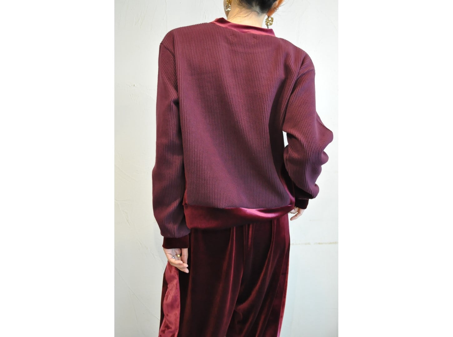●リブのような畝を持つソフトなタッチのニットコールと、挑発的かつエレガントな光沢を持つベロアを掛け合わせたトップス。