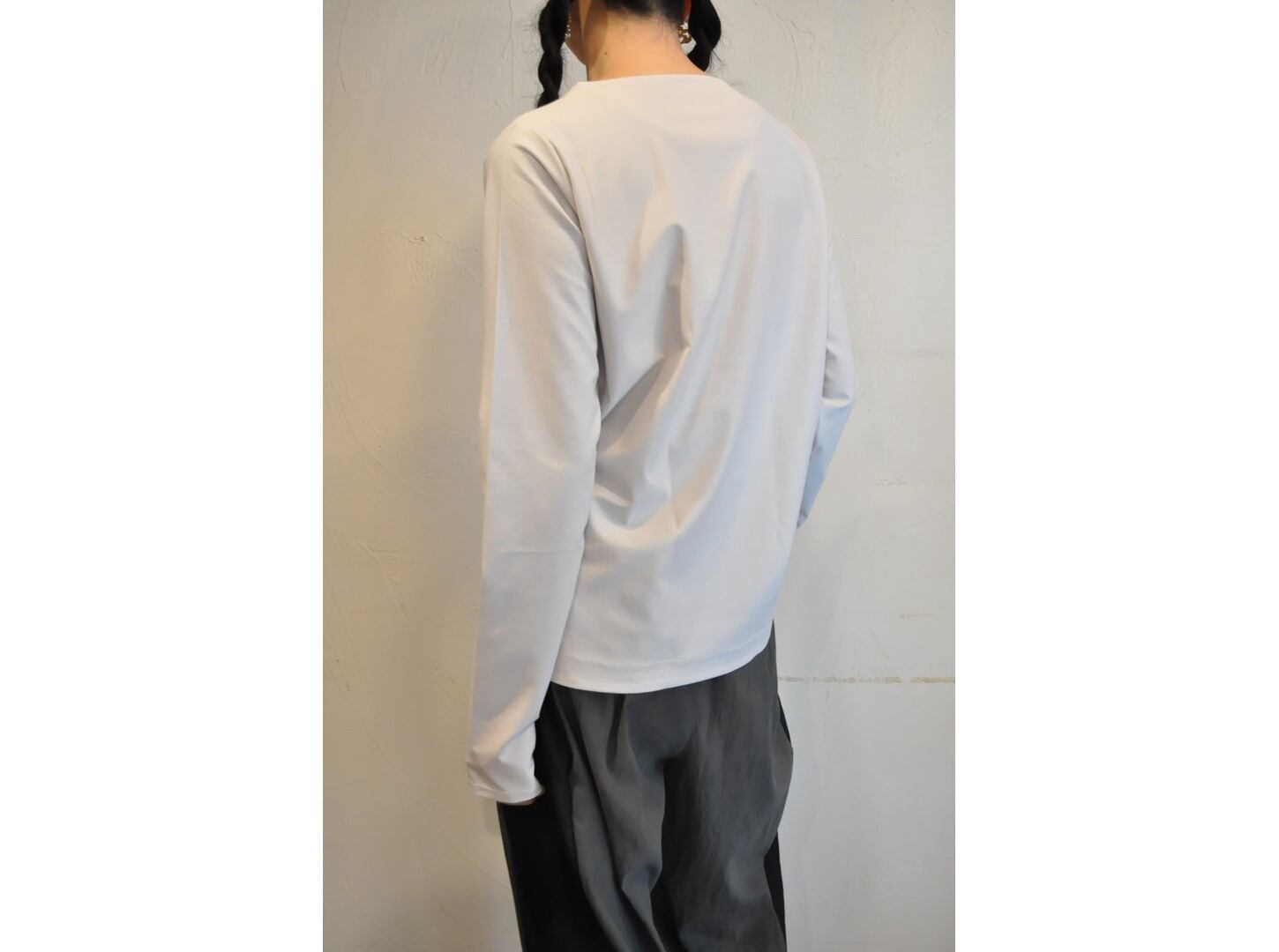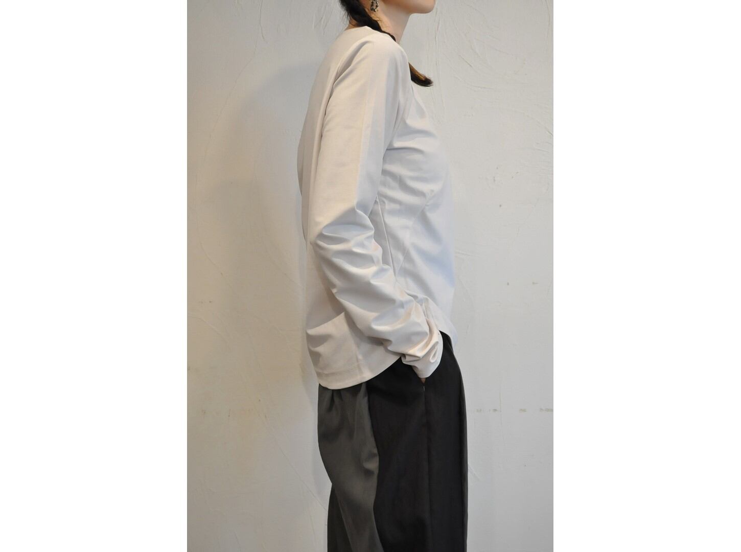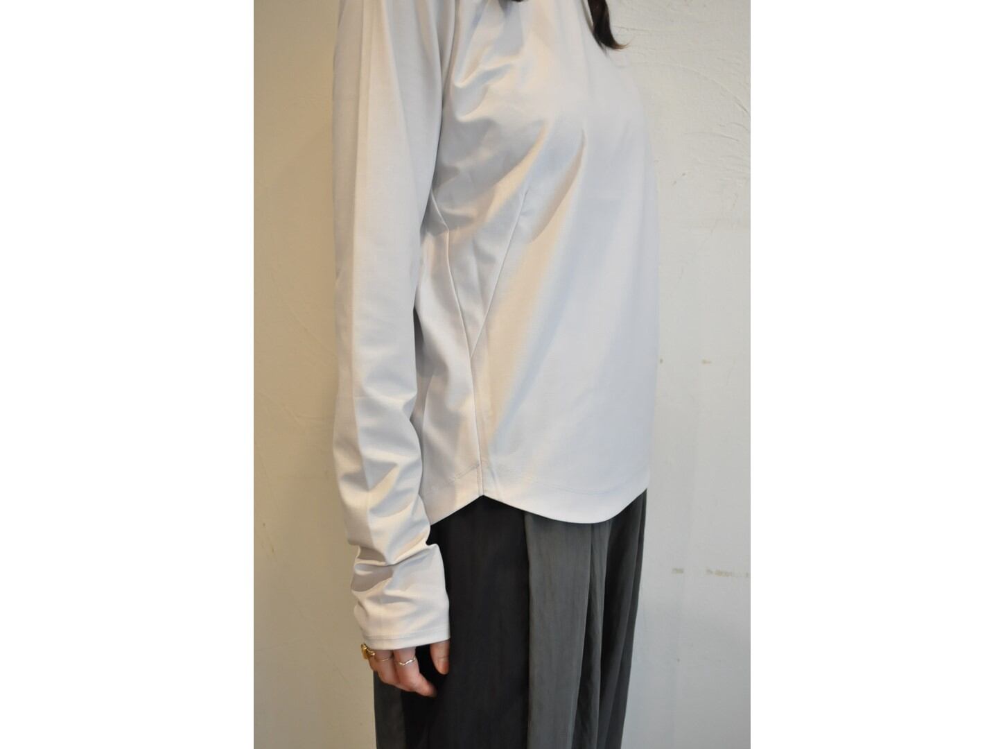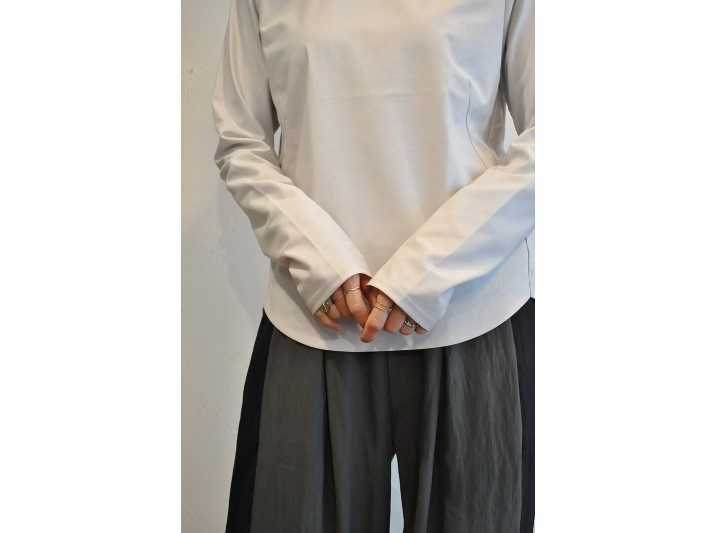 首元を美しく惹き立てるネックラインや、パンツインしやすい裾カーブ。