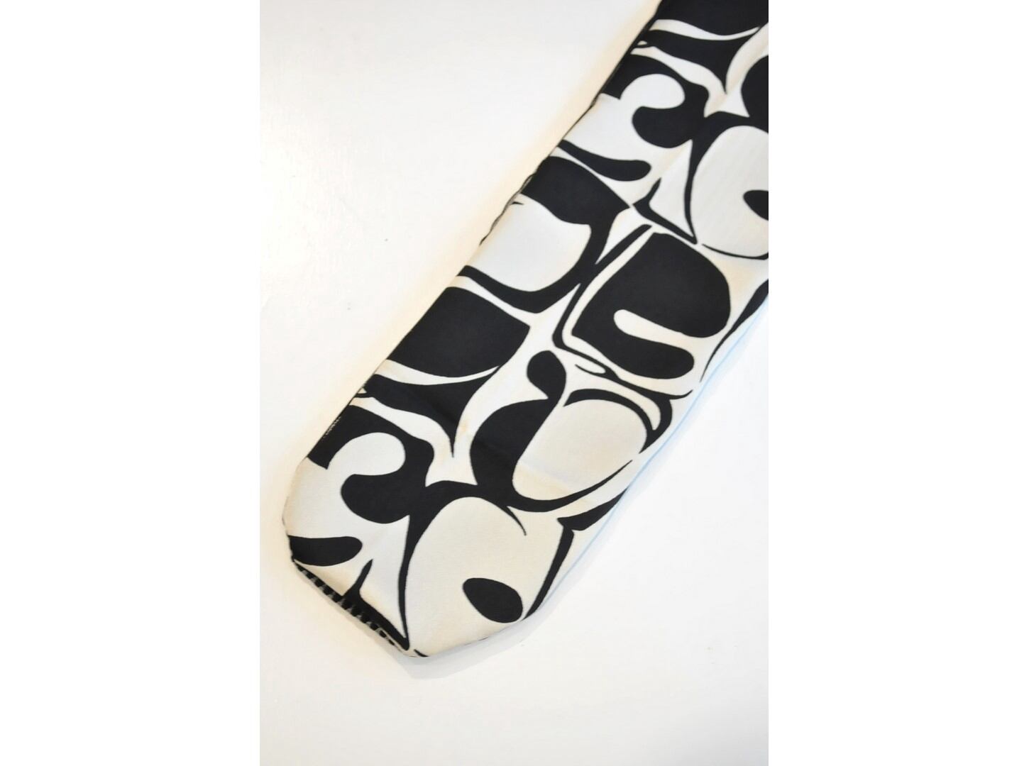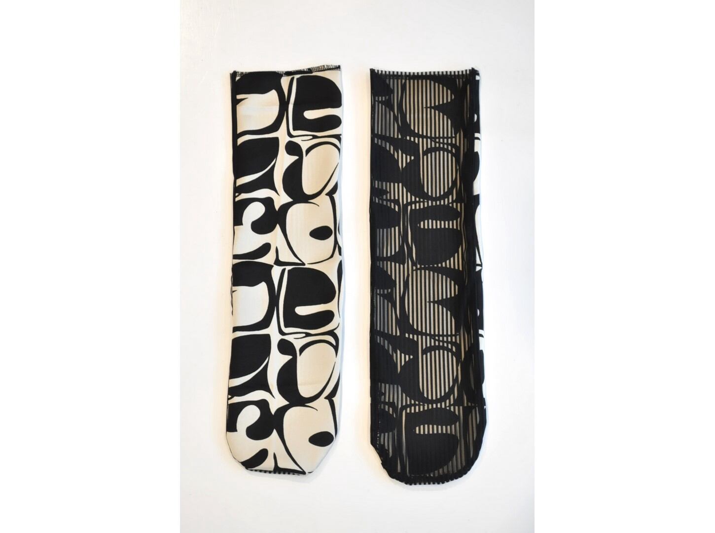 ●配色のコントラストが印象的な、幾何学模様とストライプを組み合わせたデザインソックス。