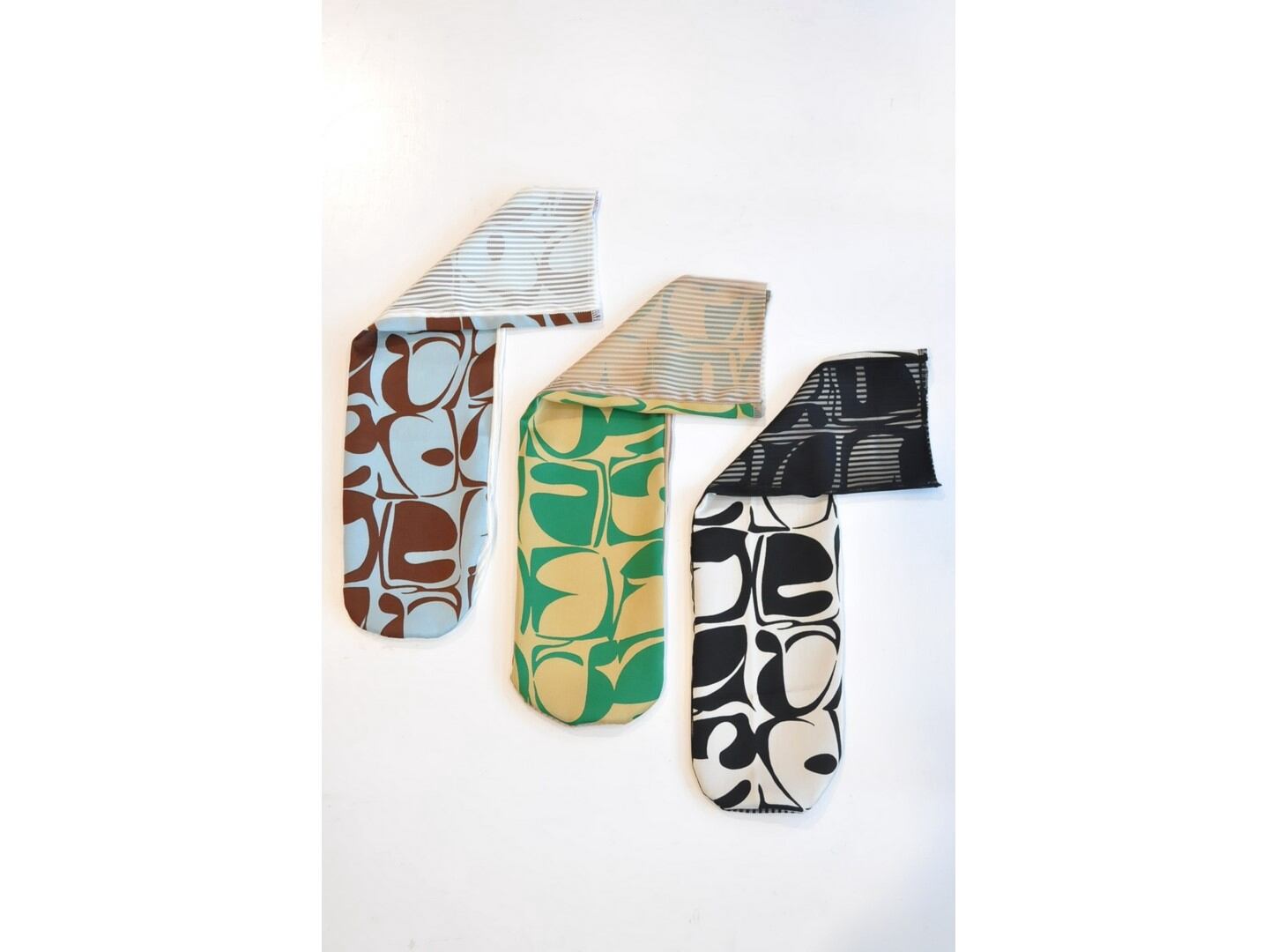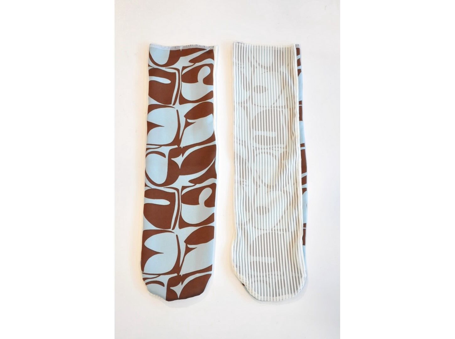 ●配色のコントラストが印象的な、幾何学模様とストライプを組み合わせたデザインソックス。