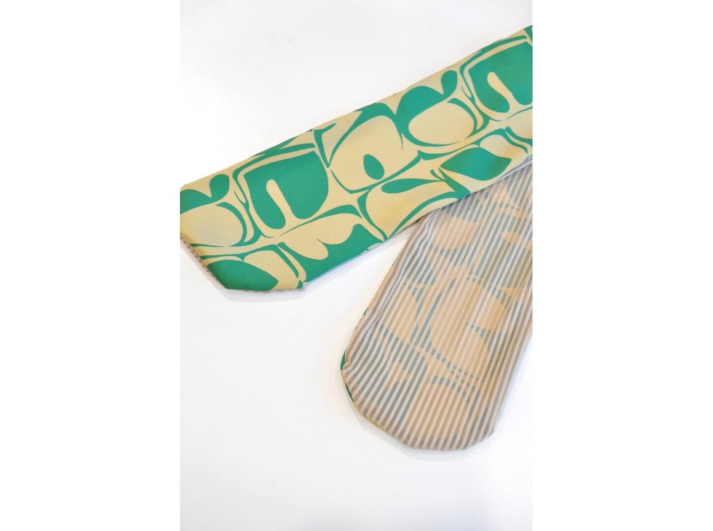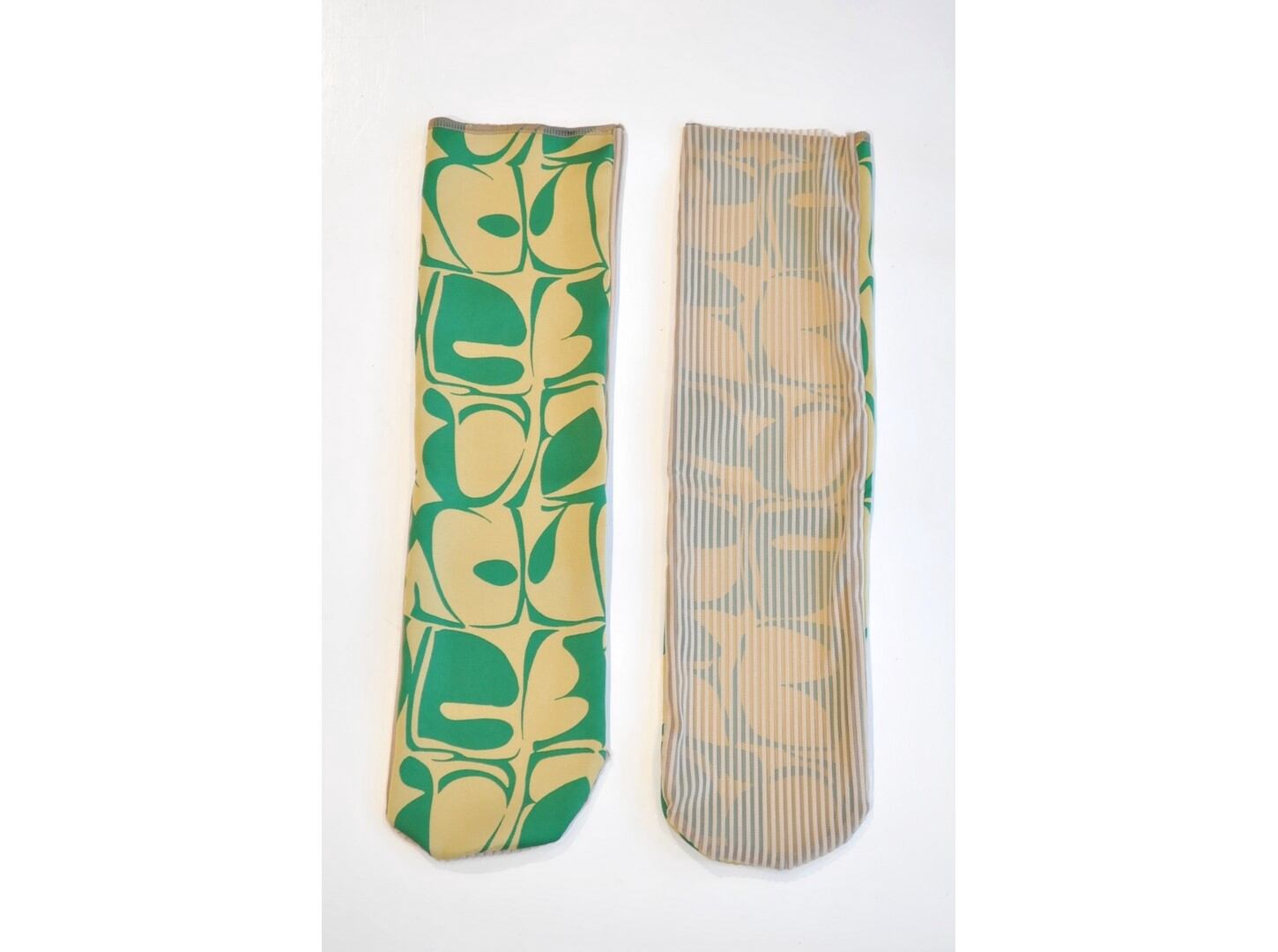 ●配色のコントラストが印象的な、幾何学模様とストライプを組み合わせたデザインソックス。