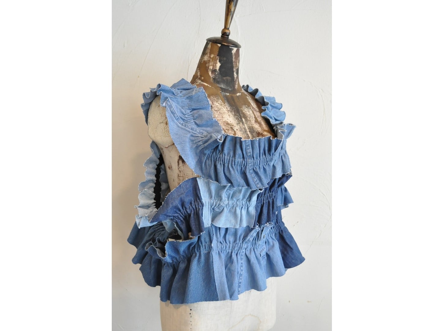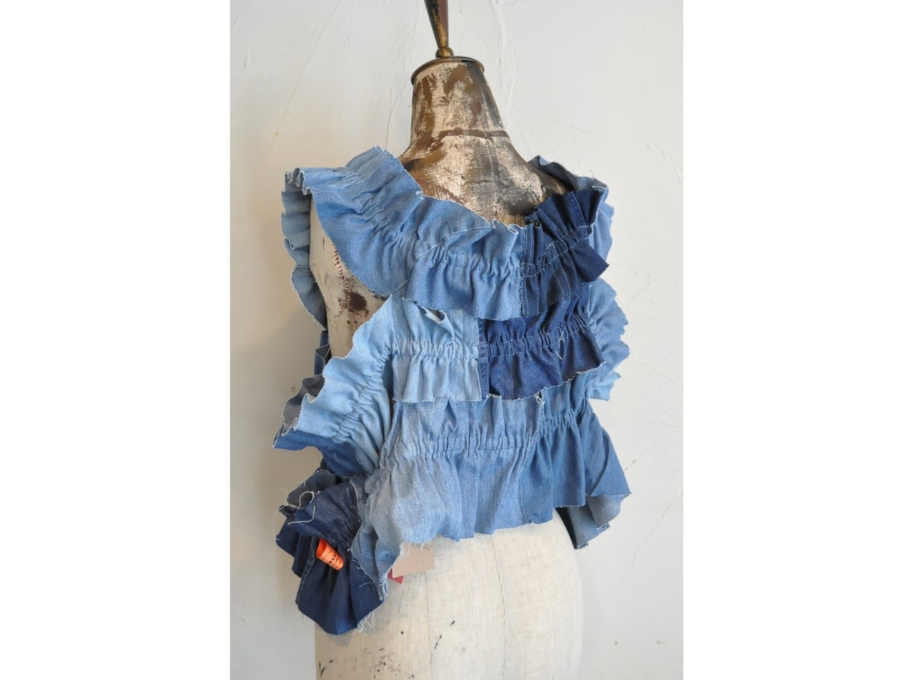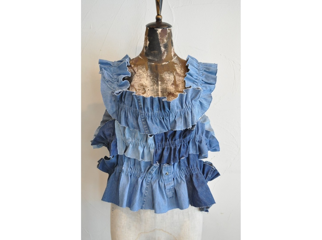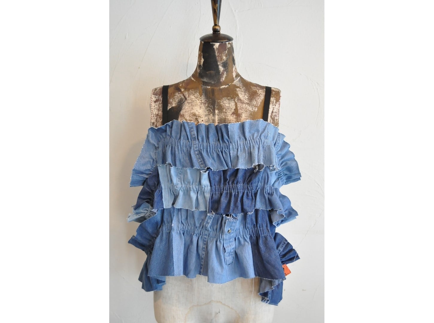 ●古着のダンガリーシャツを解体し、パッチワークしたキャミソール。