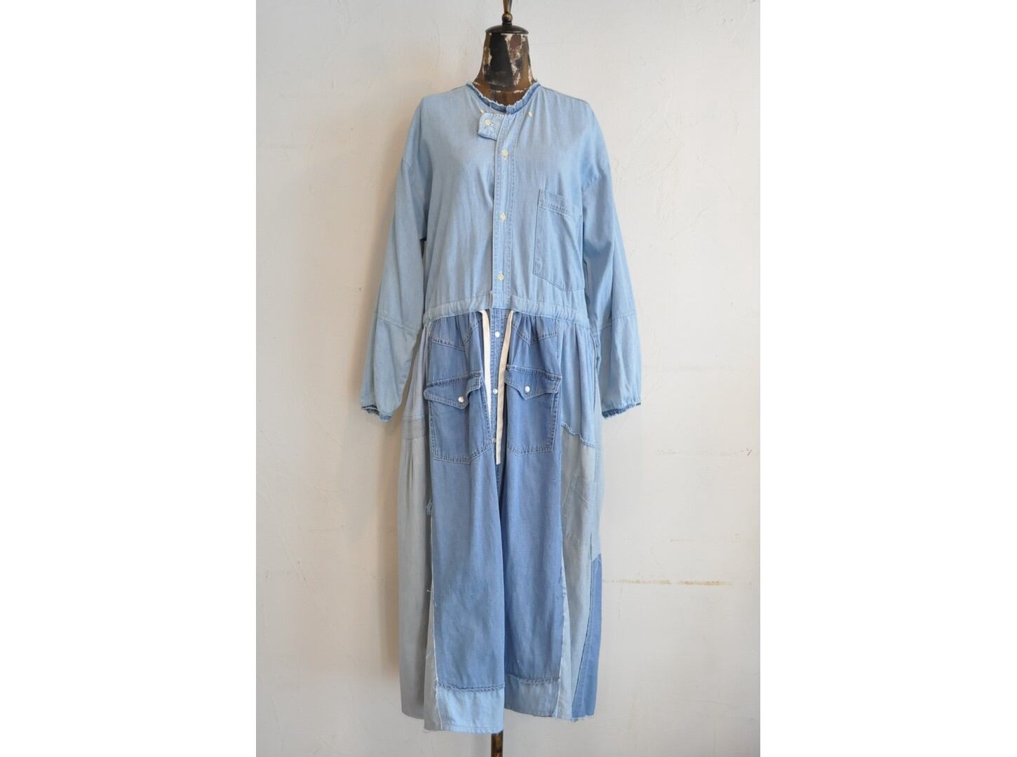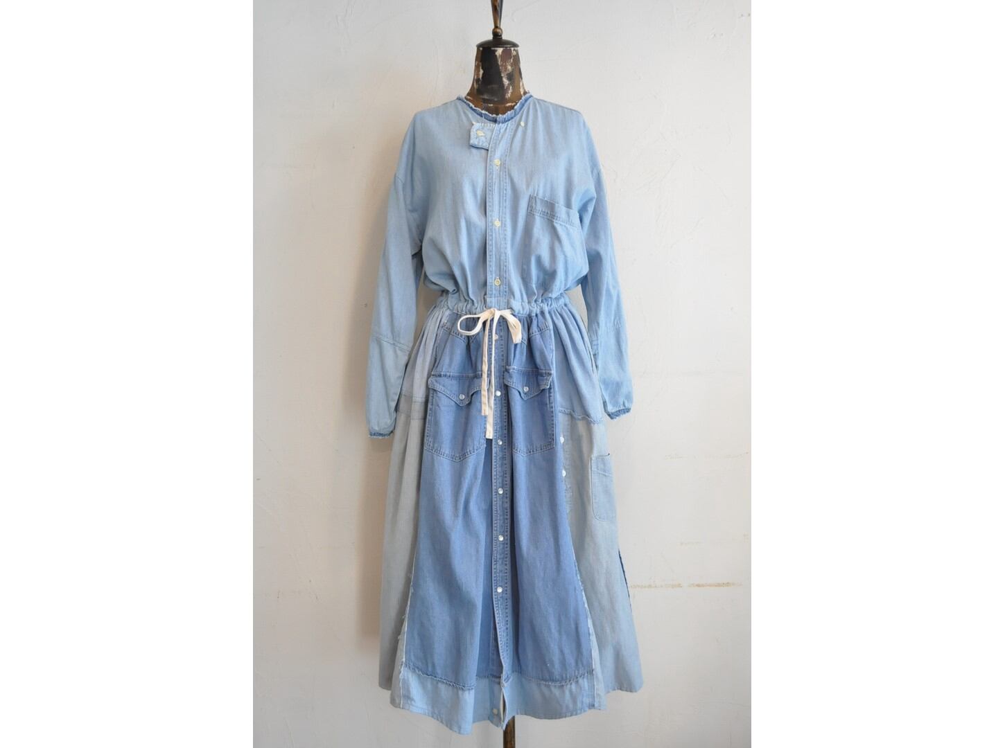 ●古着のシャツを使用して再構築したリメイクワンピース。
