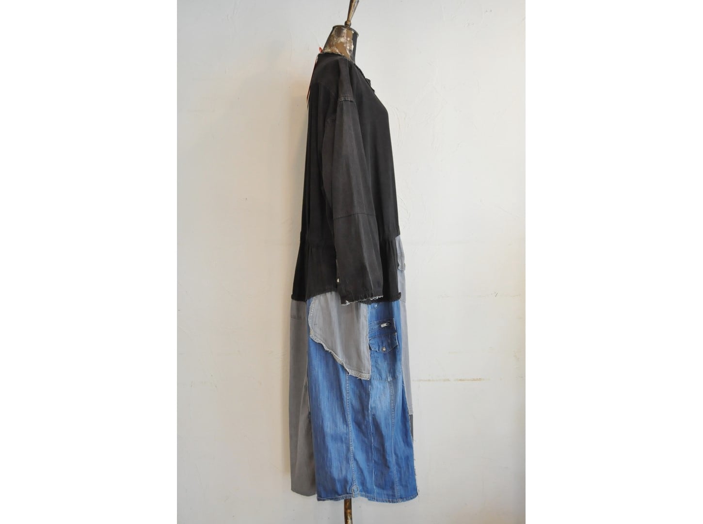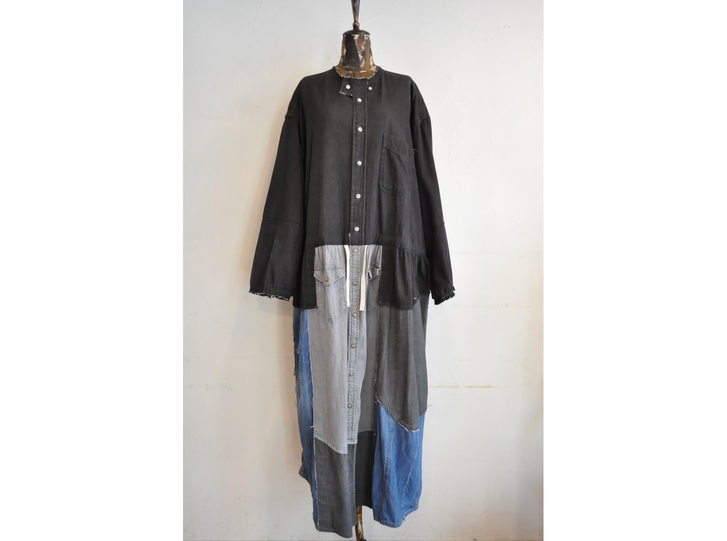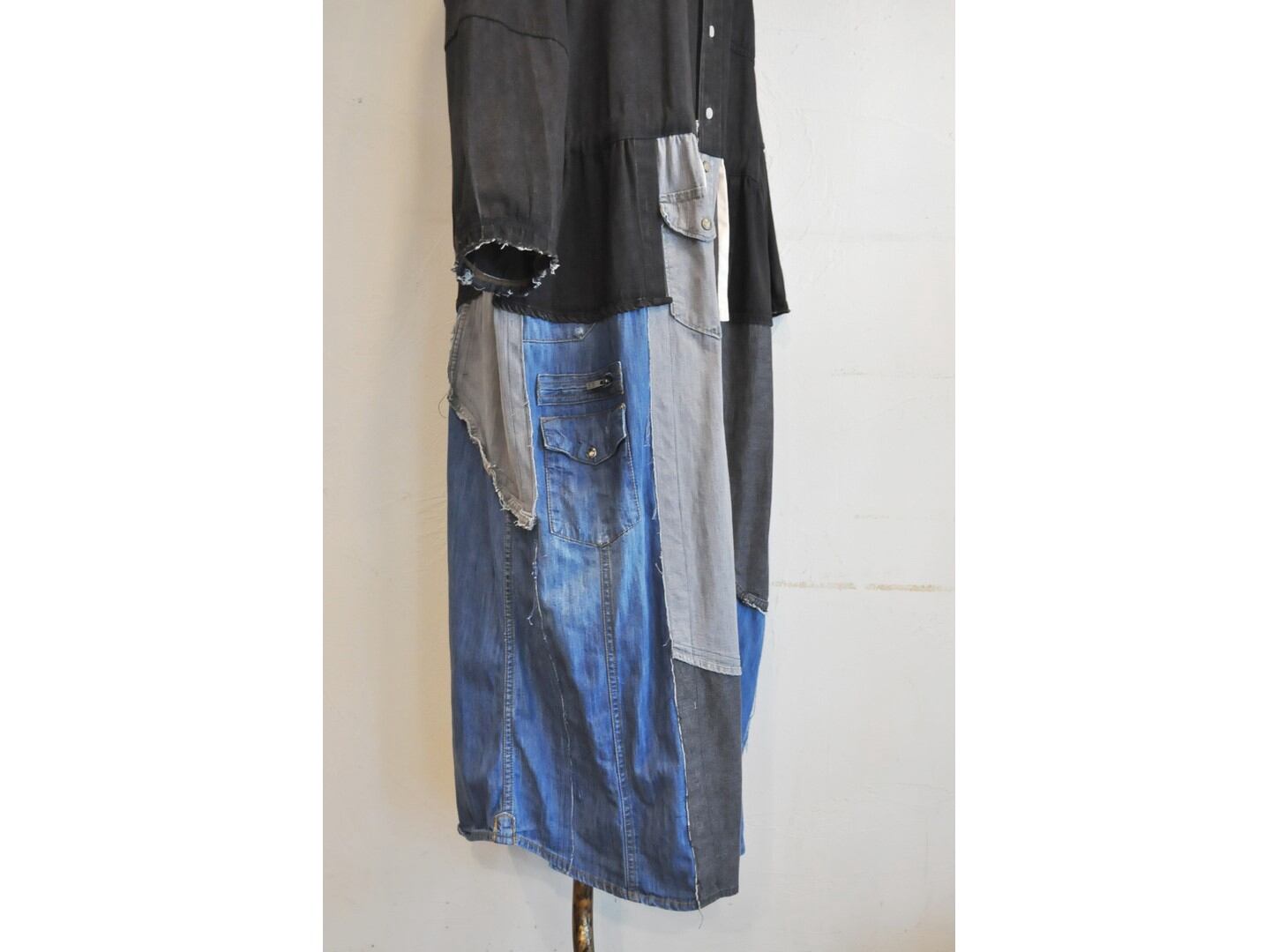 ●古着のシャツを使用して再構築したリメイクワンピース。