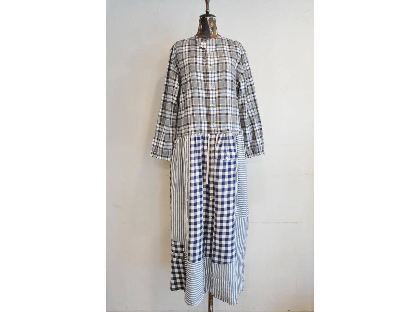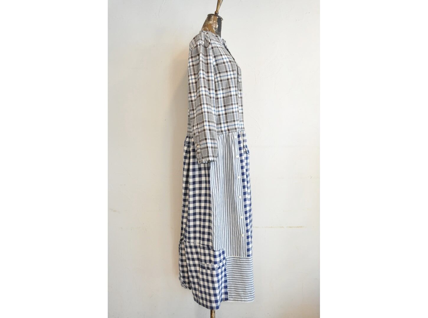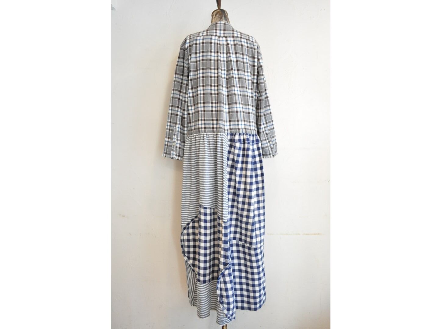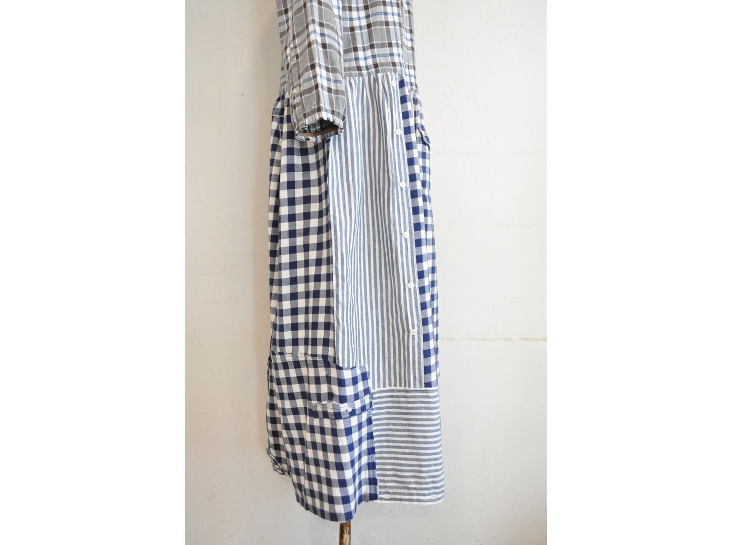 シャツならではのディテールを活かしつつ、ウエストの切り替えから下はパッチワークでボリュームを持たせています。