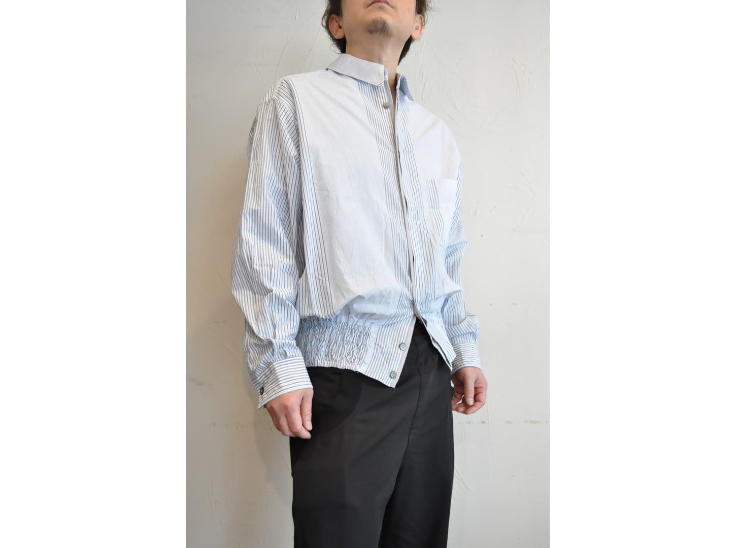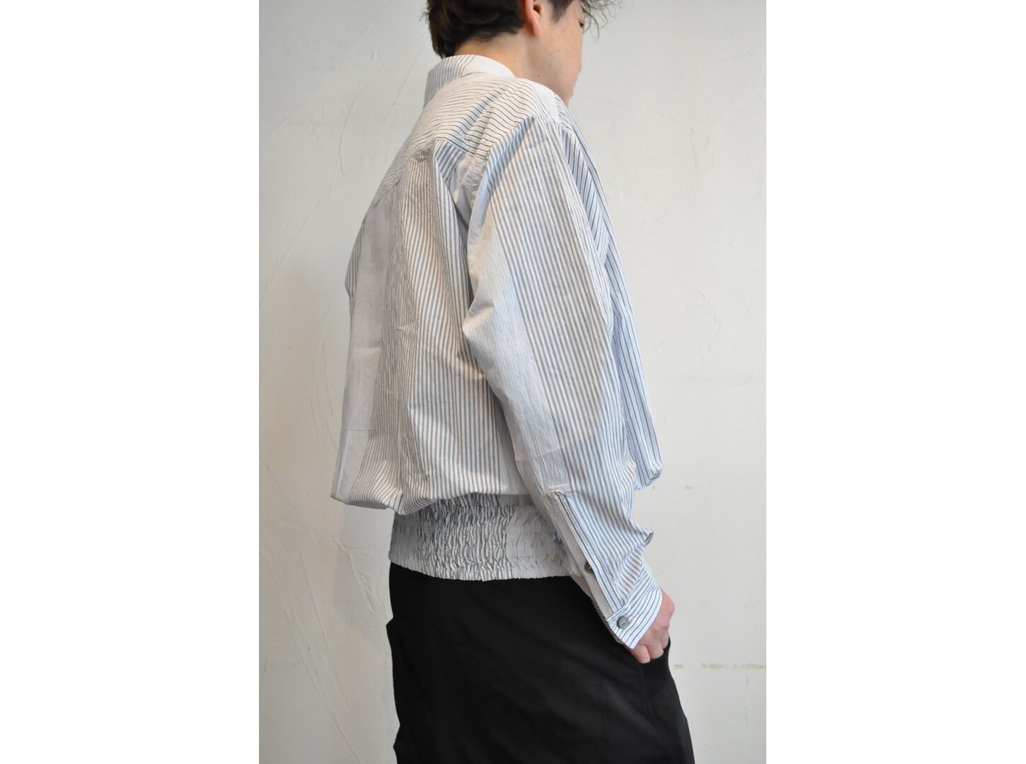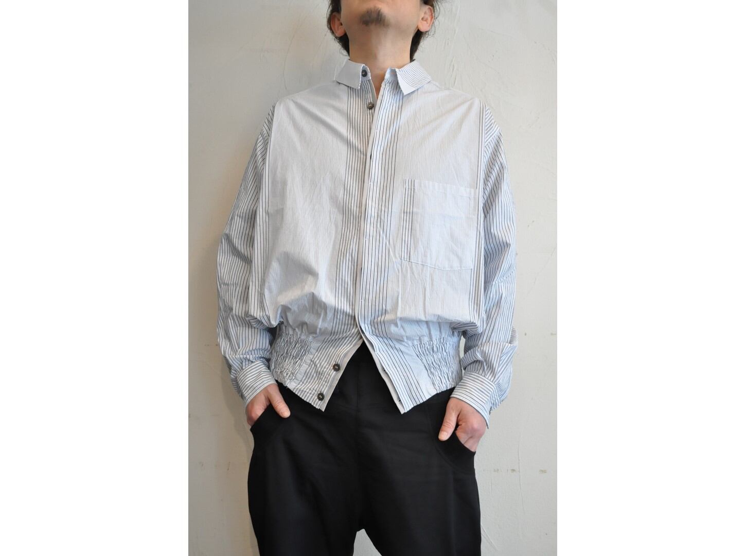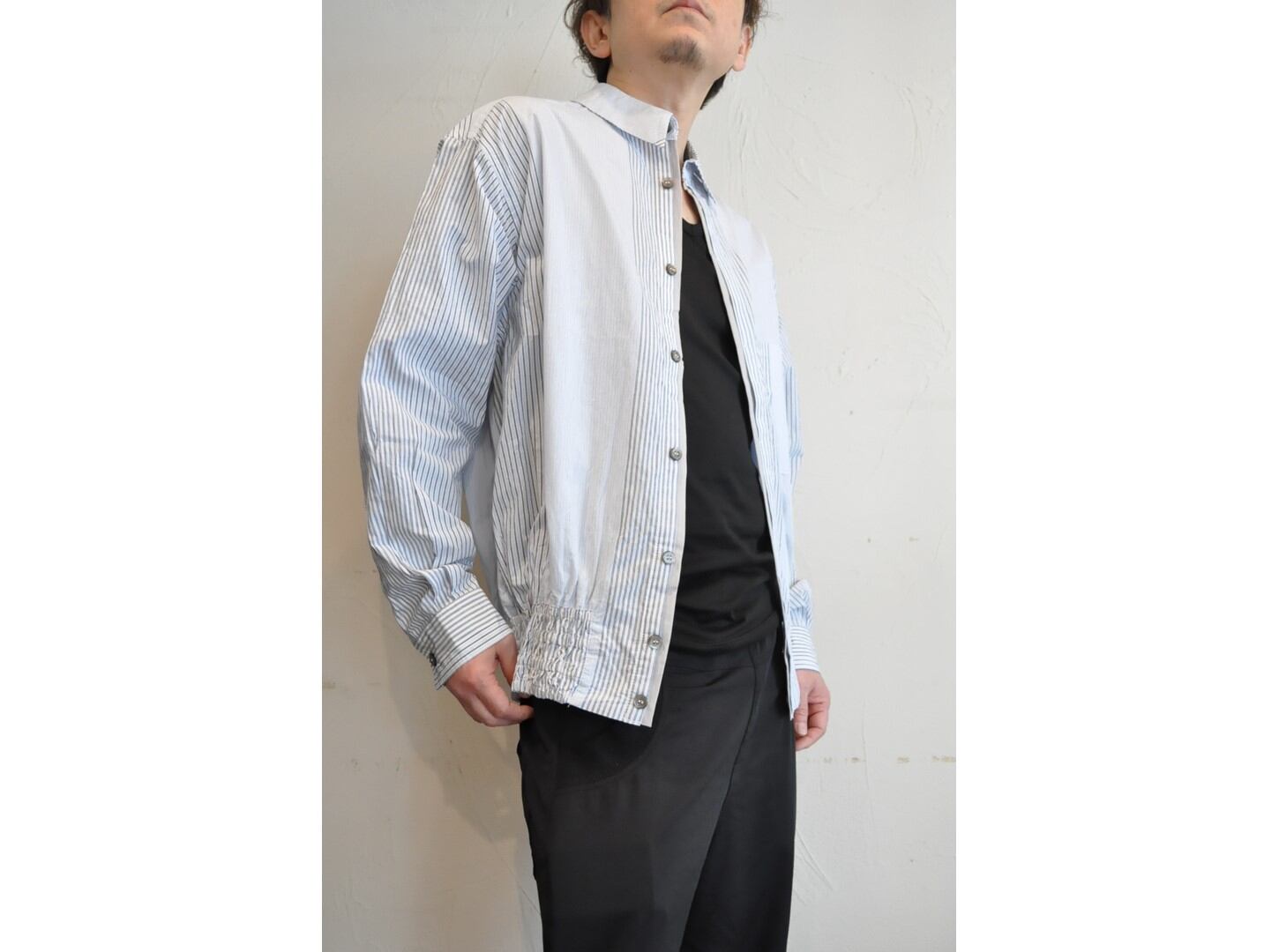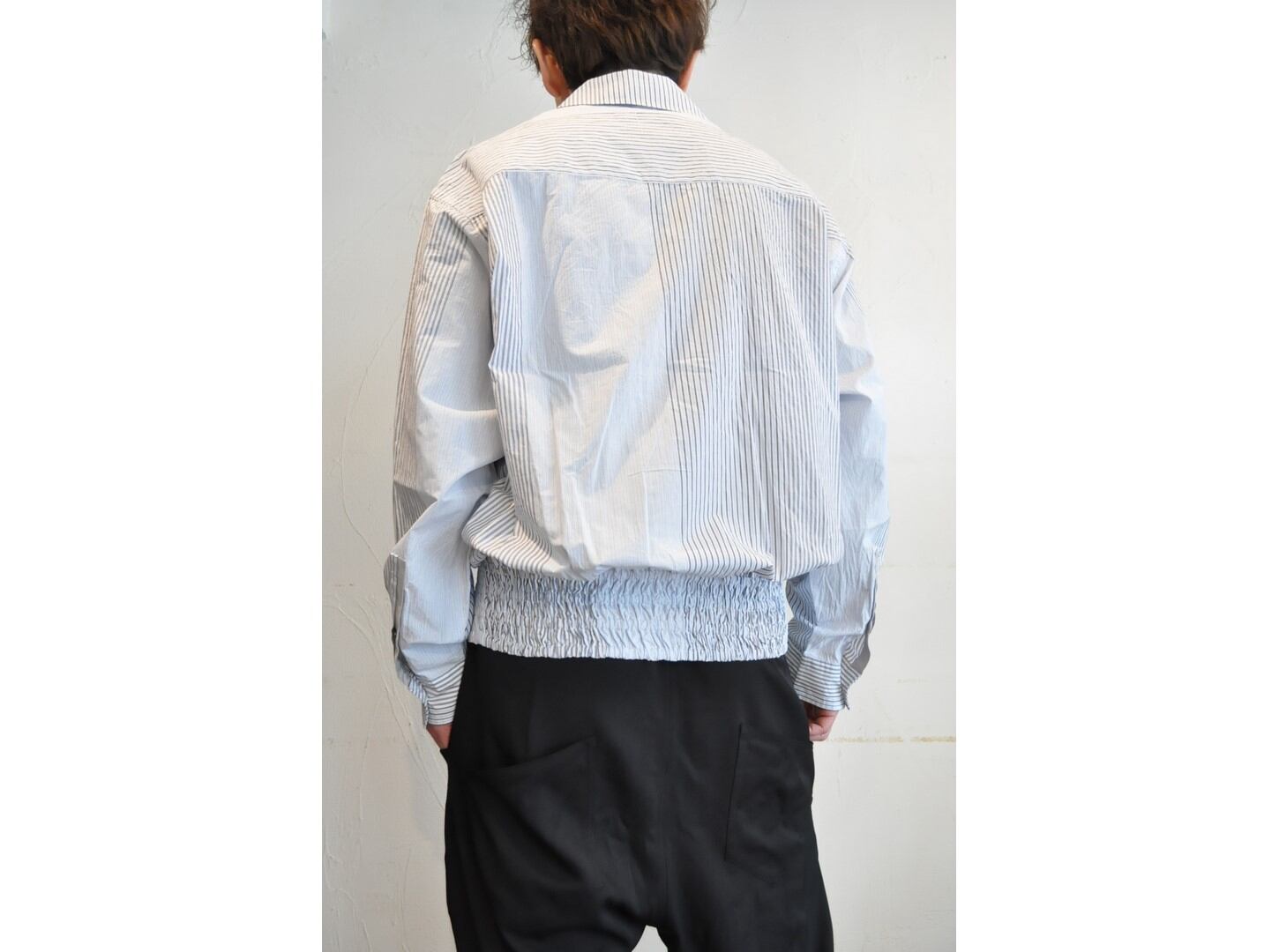 裾にはブルゾンのリブのようなギャザーを施し、ボタンを留めればブルゾン風に、開ければシャツのように羽織れる表情豊かなアイテムです。