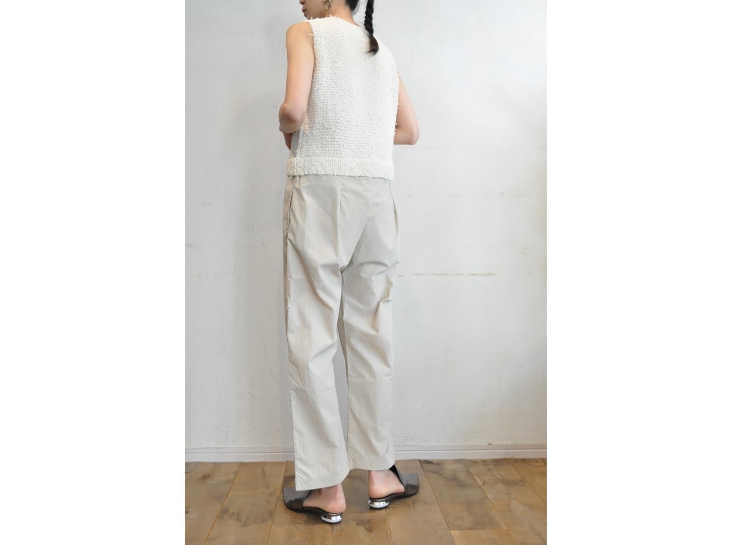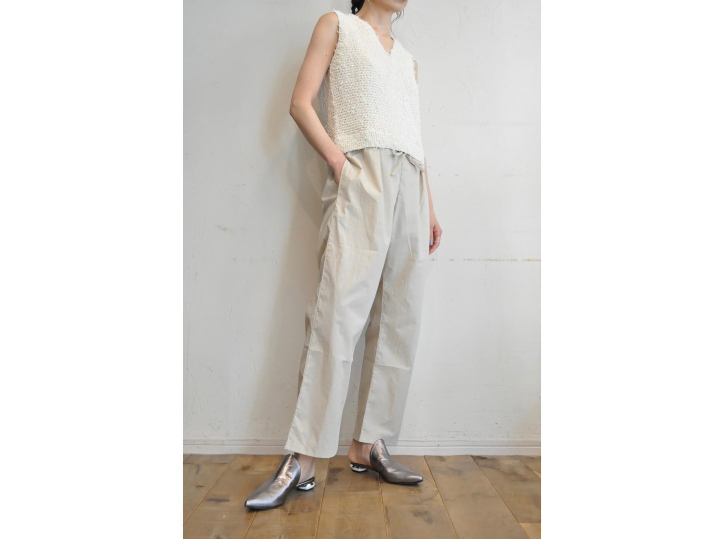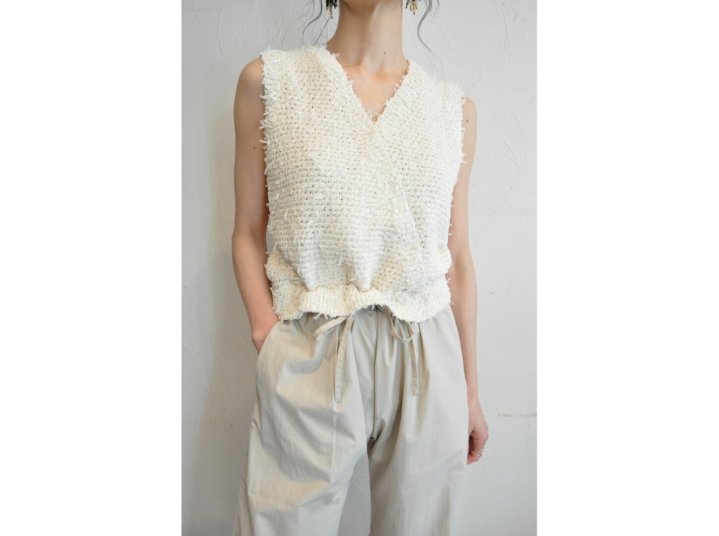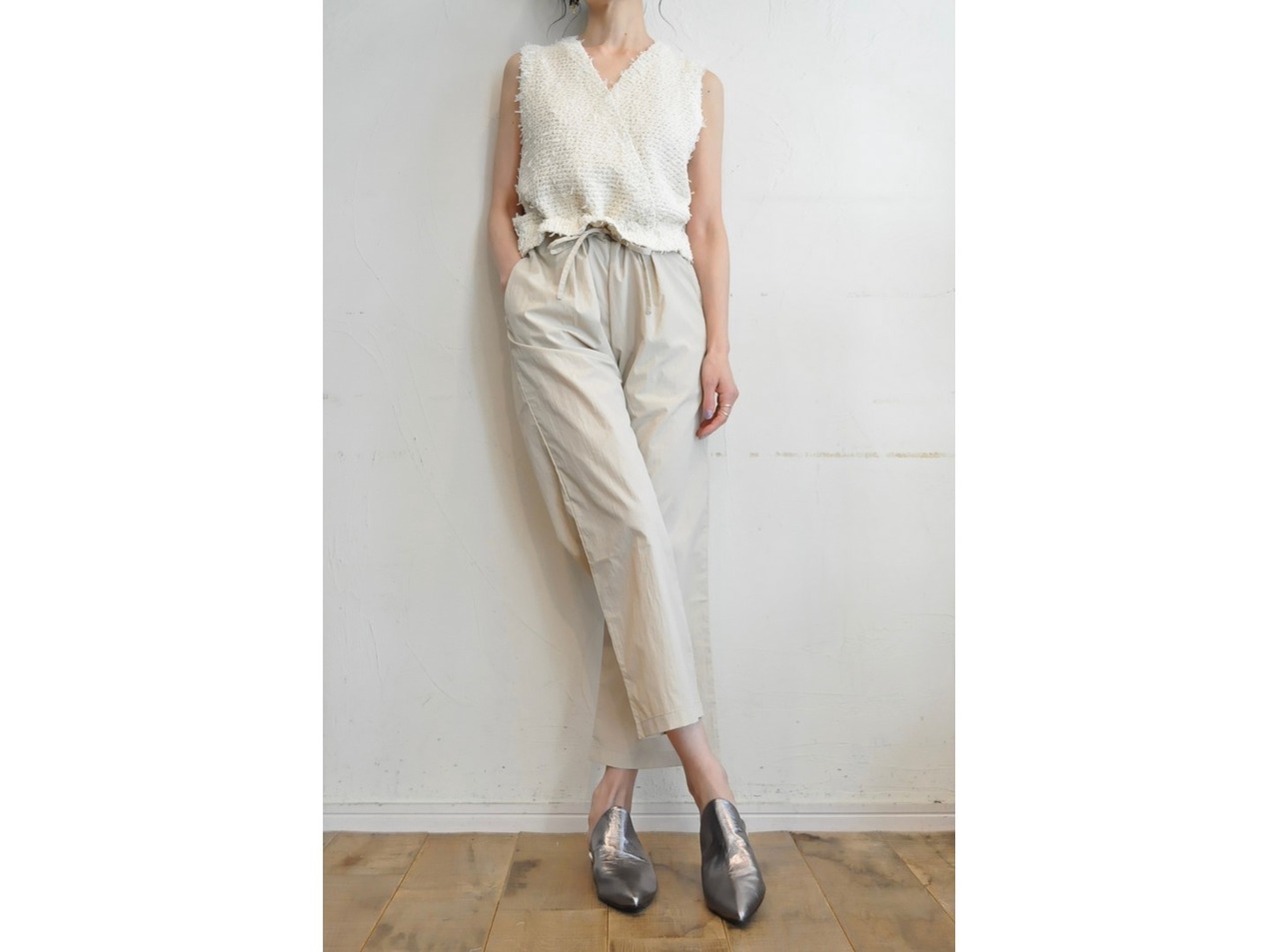 ●ニットのツィーディーな表情と、リラックス感のあるドローストリングパンツが一体になったオールインワン。