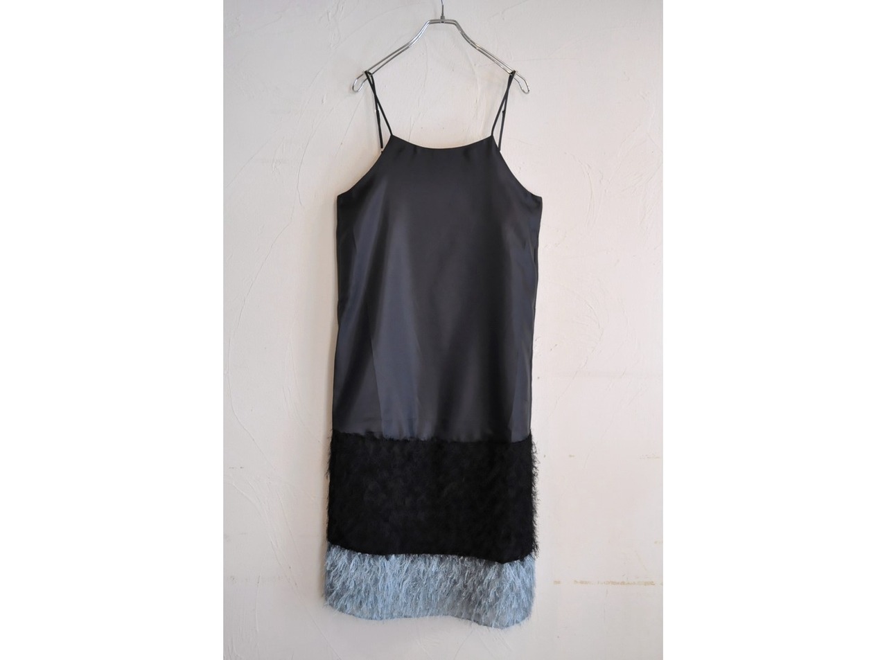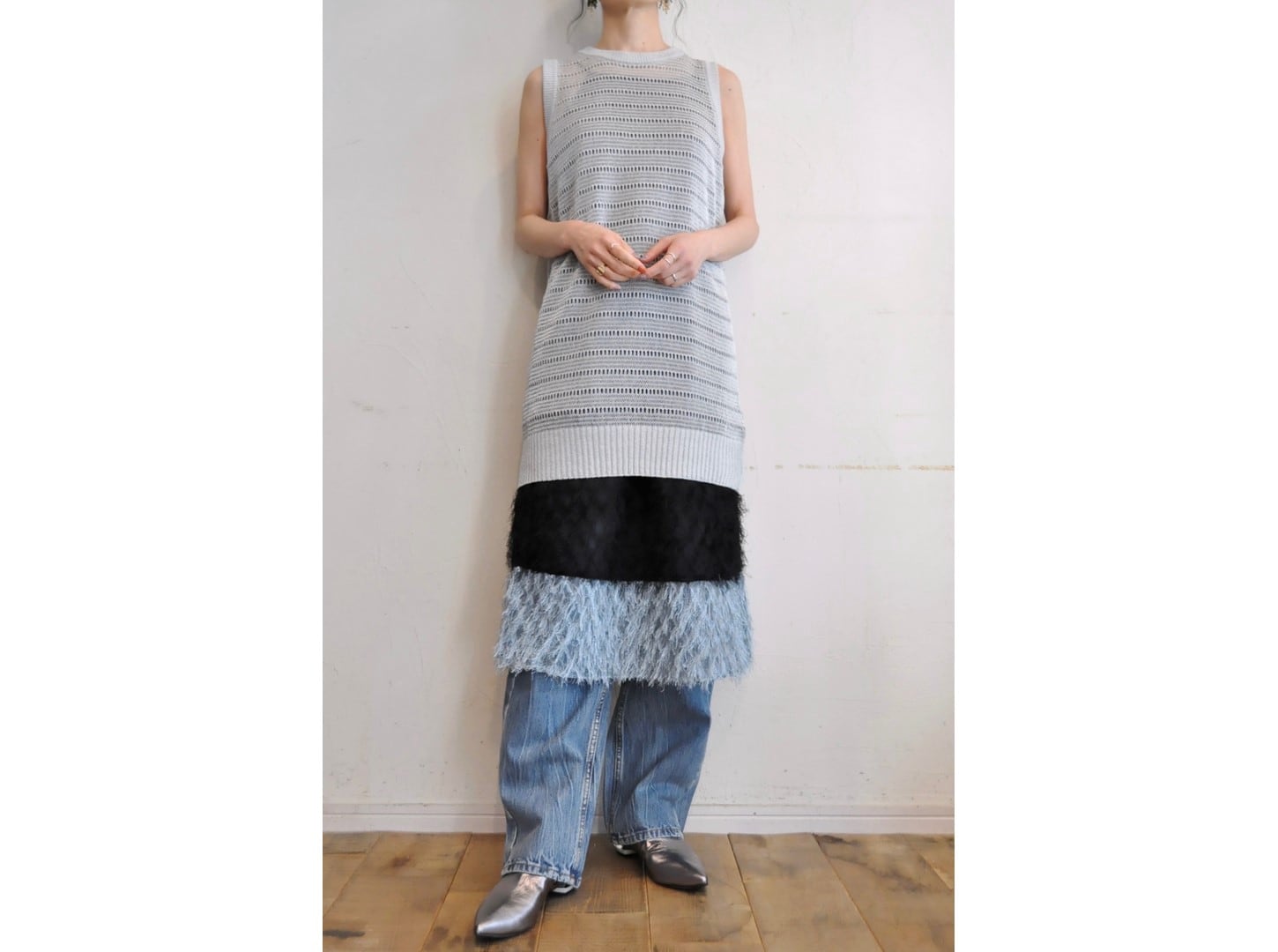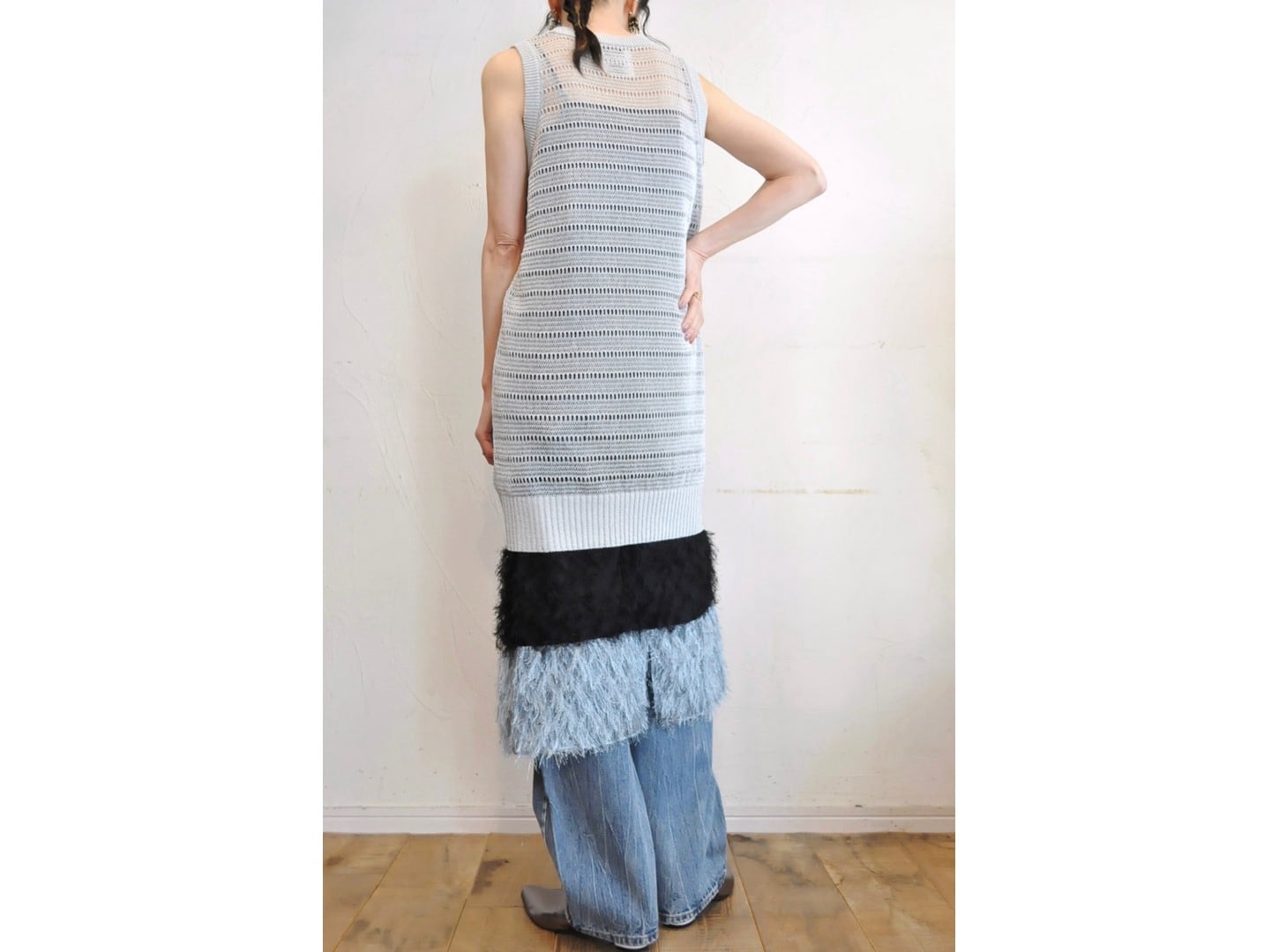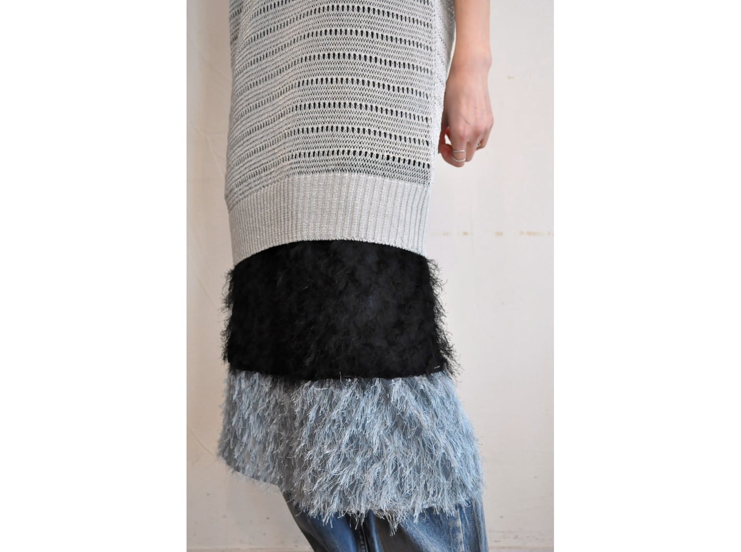 ●繊細な透かし柄のノースリニットの裾からのぞく、カットジャガードのカラーブロッキングが奥行きのあるレイヤードを描くワンピース。