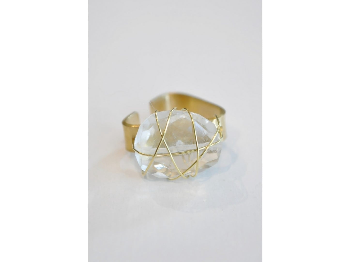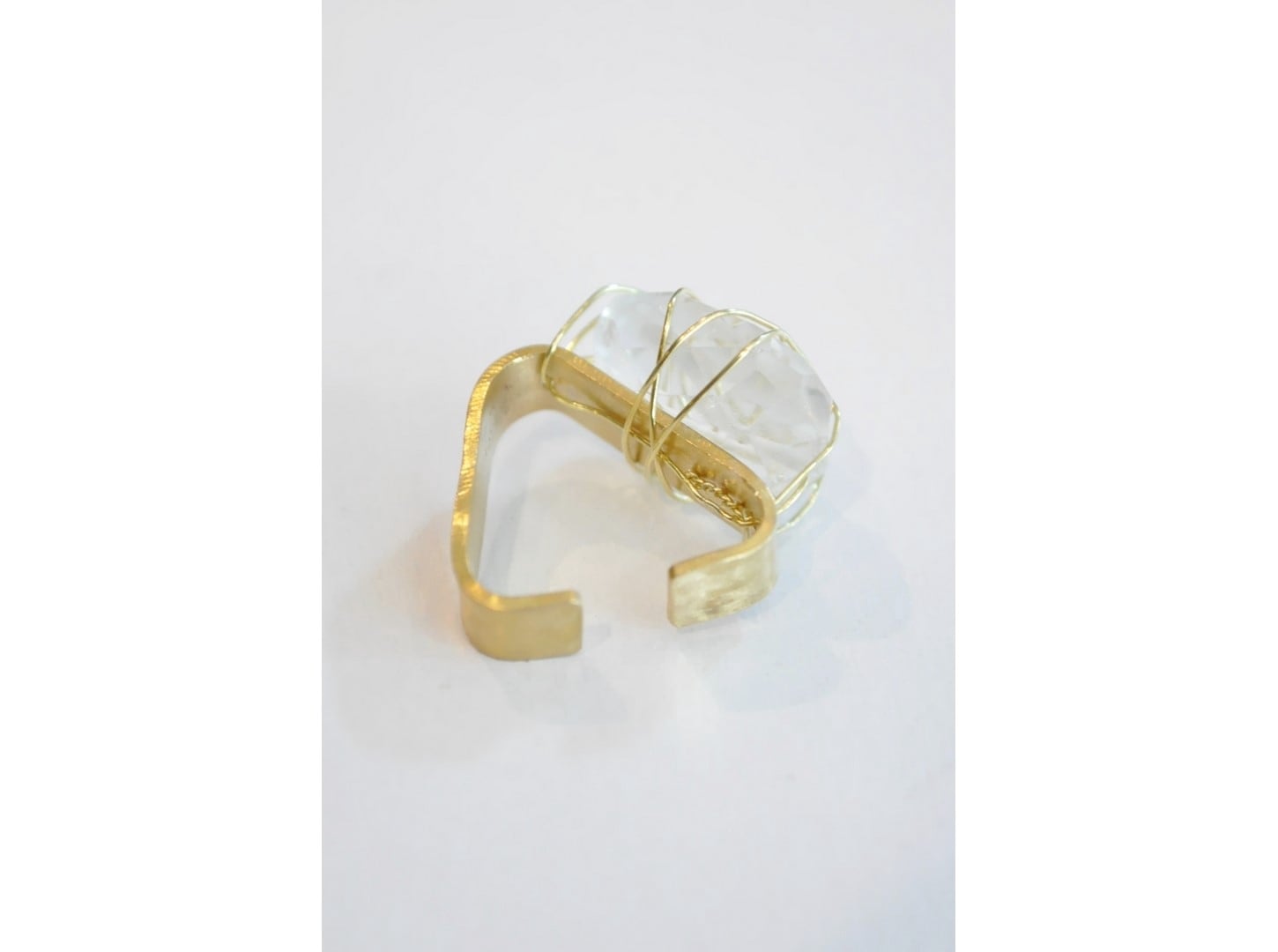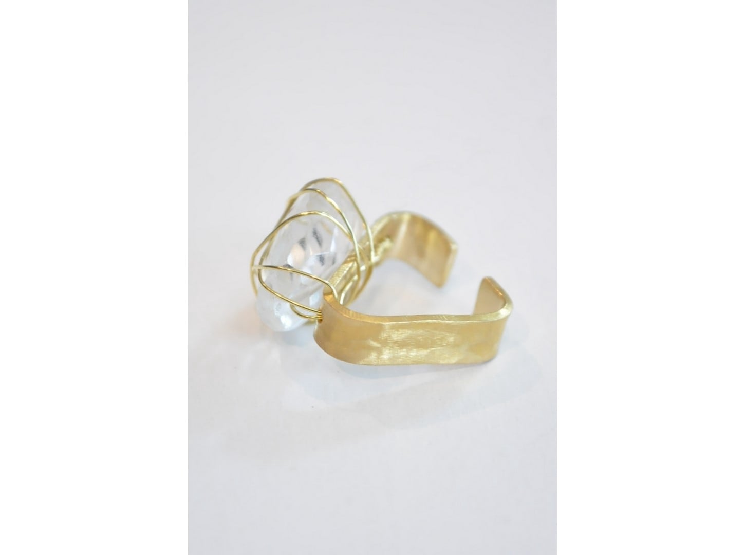 土目模様を施した真鍮板に大粒でタンブルカットされた水晶を細い真鍮のワイヤーで巻きつけました。