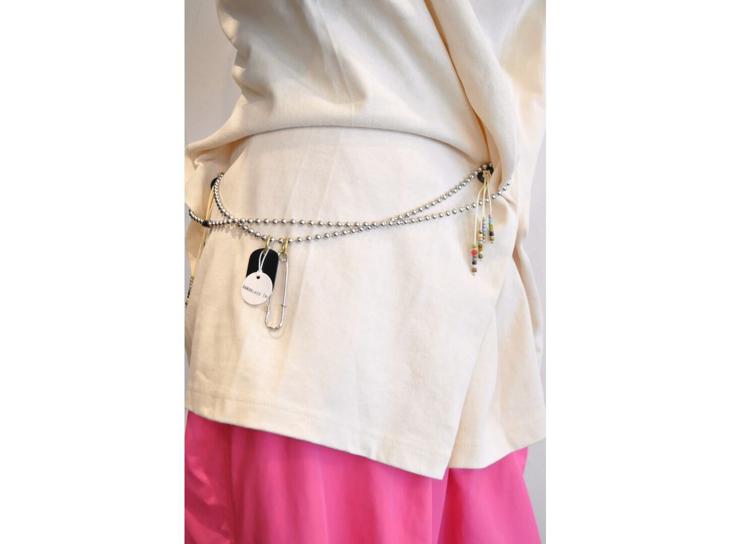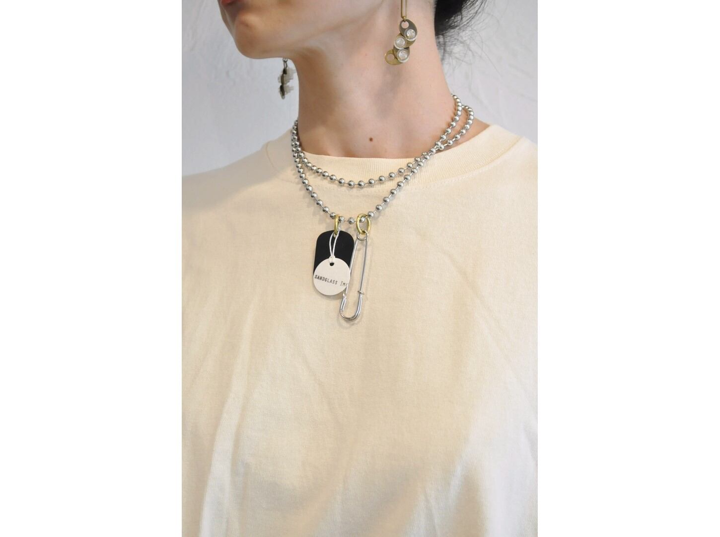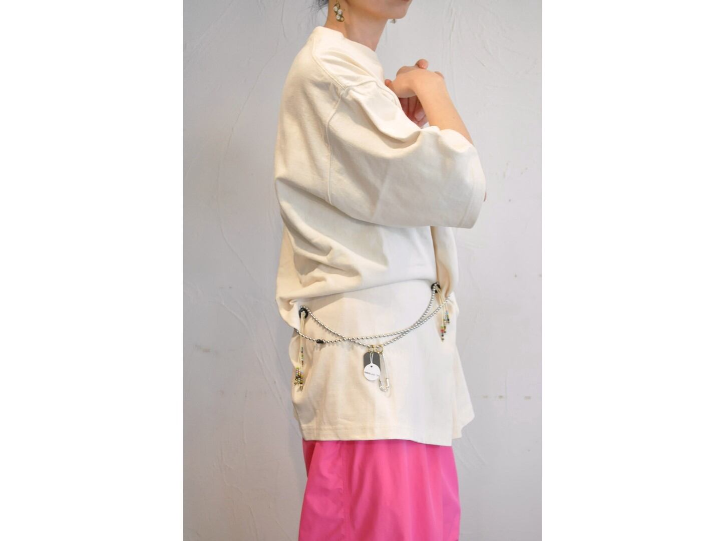 付属に着脱可能な、ヴィンテージのボタンとビーズ等の素材を組み合わせたパーツとボールチェーンが付いており、付け方を変えて色々な着方やアレンジが楽しめます。