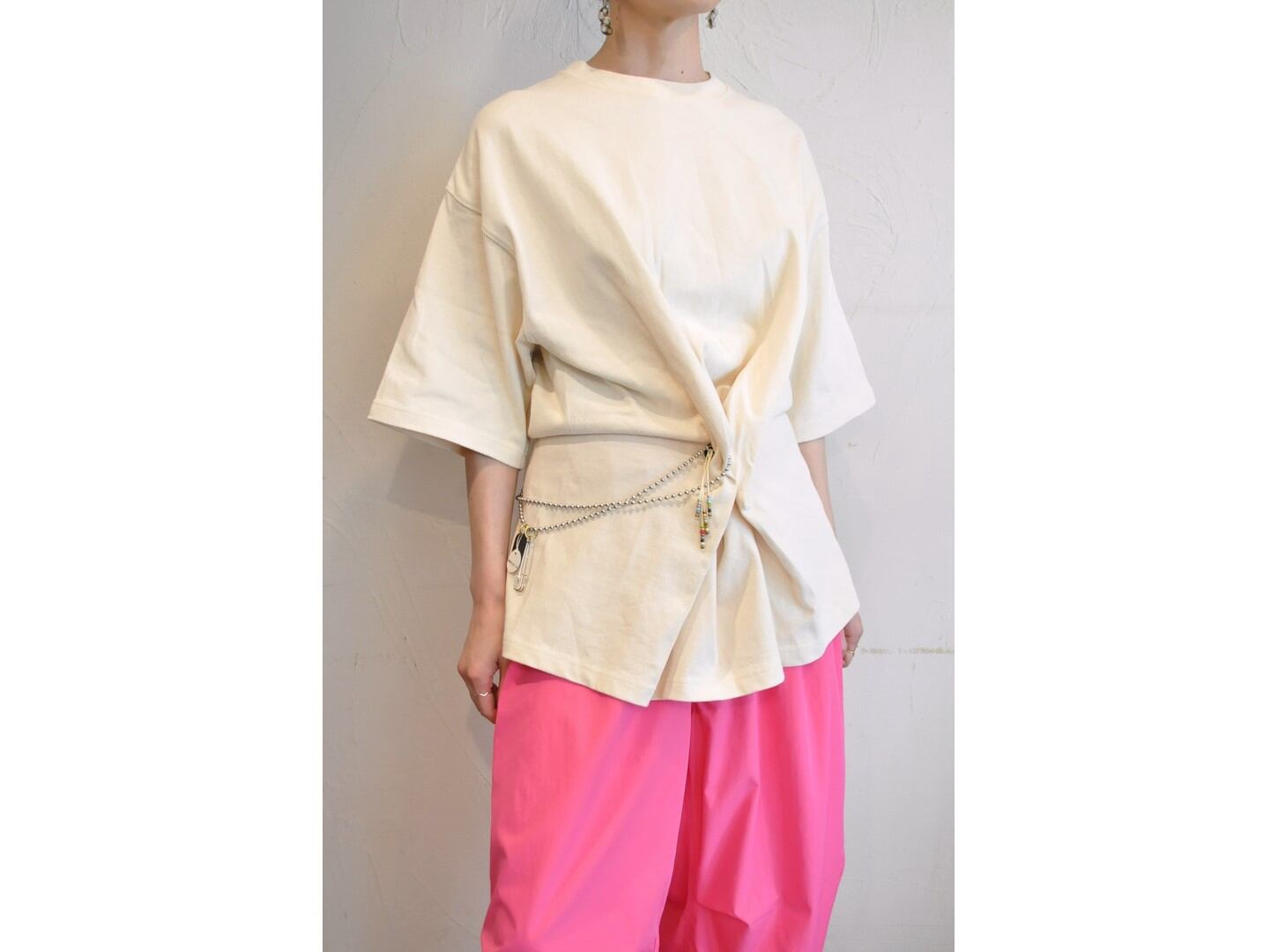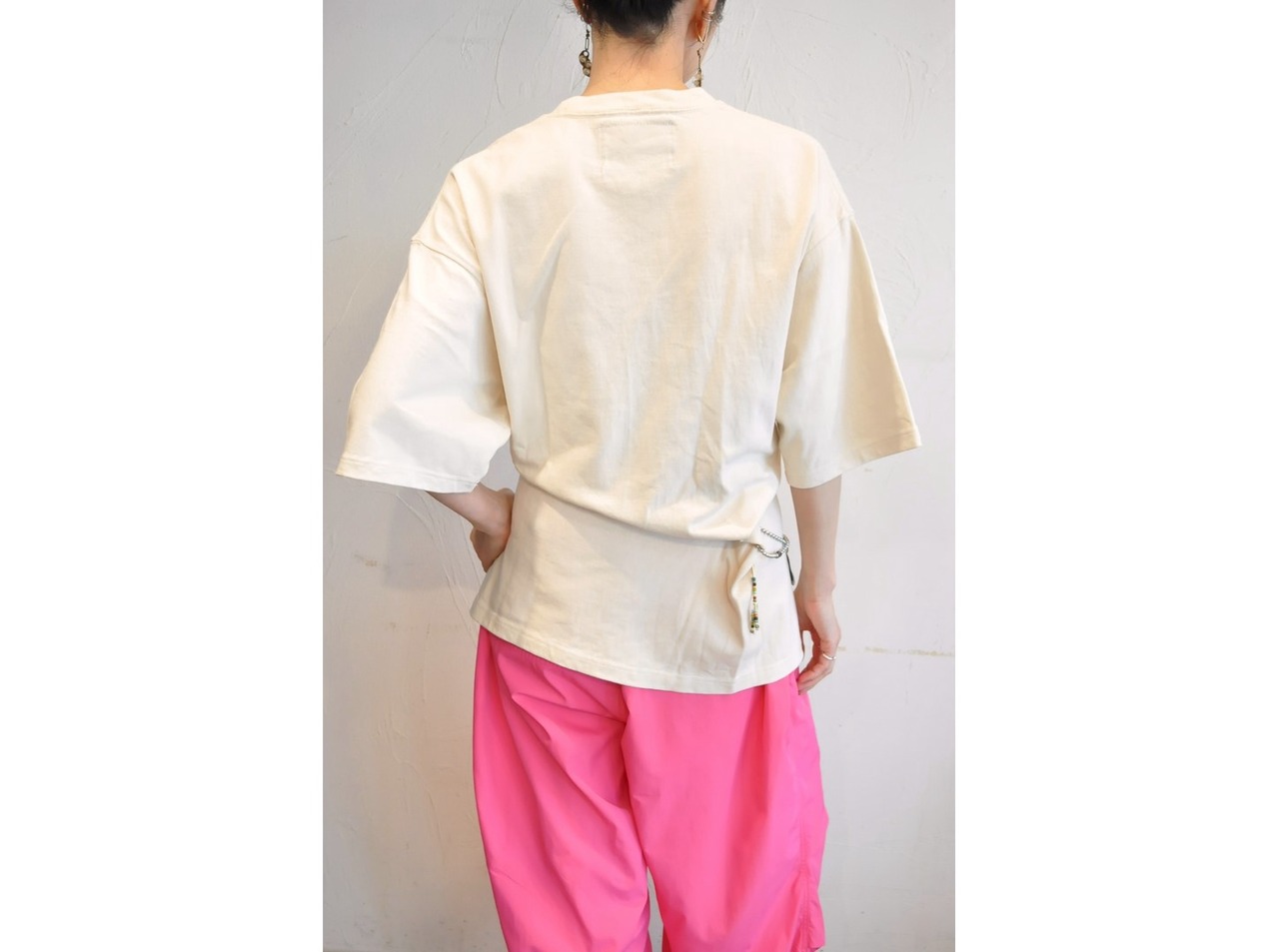 ●フロントに2つ・バックに1つ、大きなボタンホールを施したビッグTシャツ。