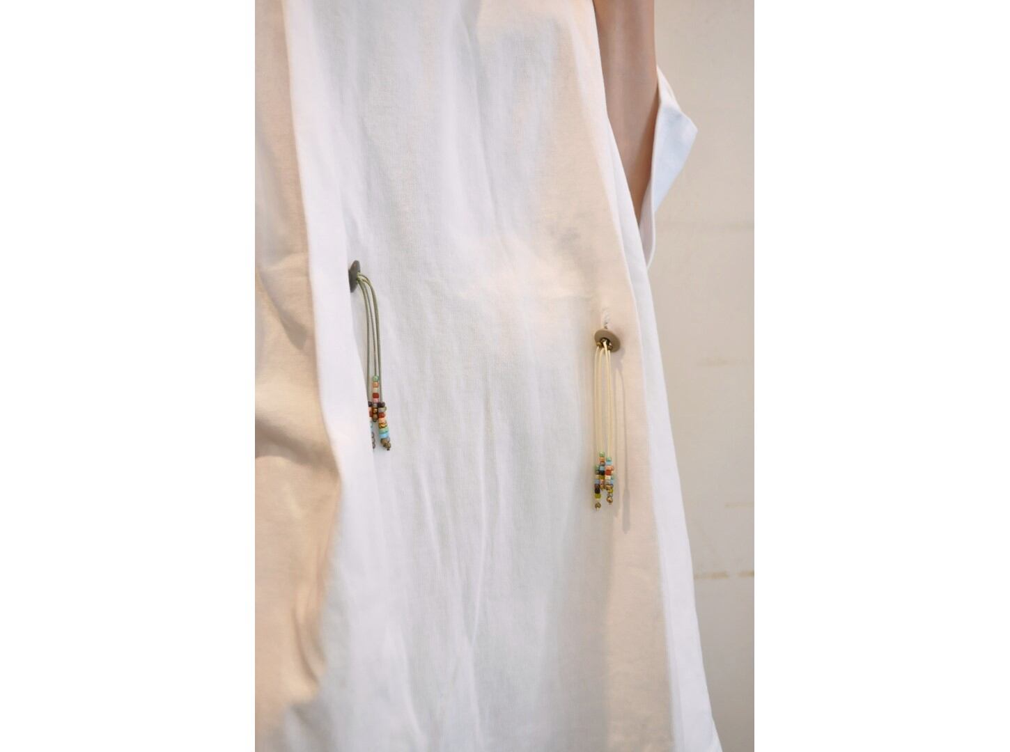 付属に着脱可能な、ヴィンテージのボタンとビーズ等の素材を組み合わせたパーツとボールチェーンが付いており、付け方を変えて色々な着方やアレンジが楽しめます。