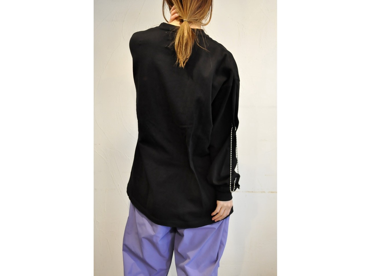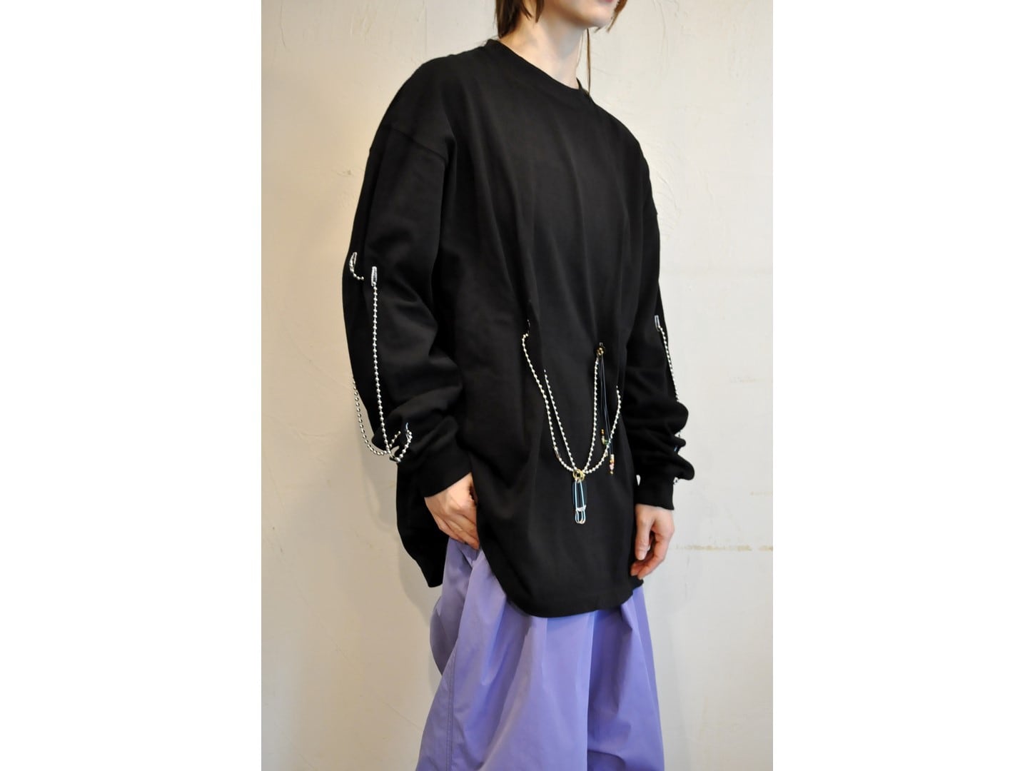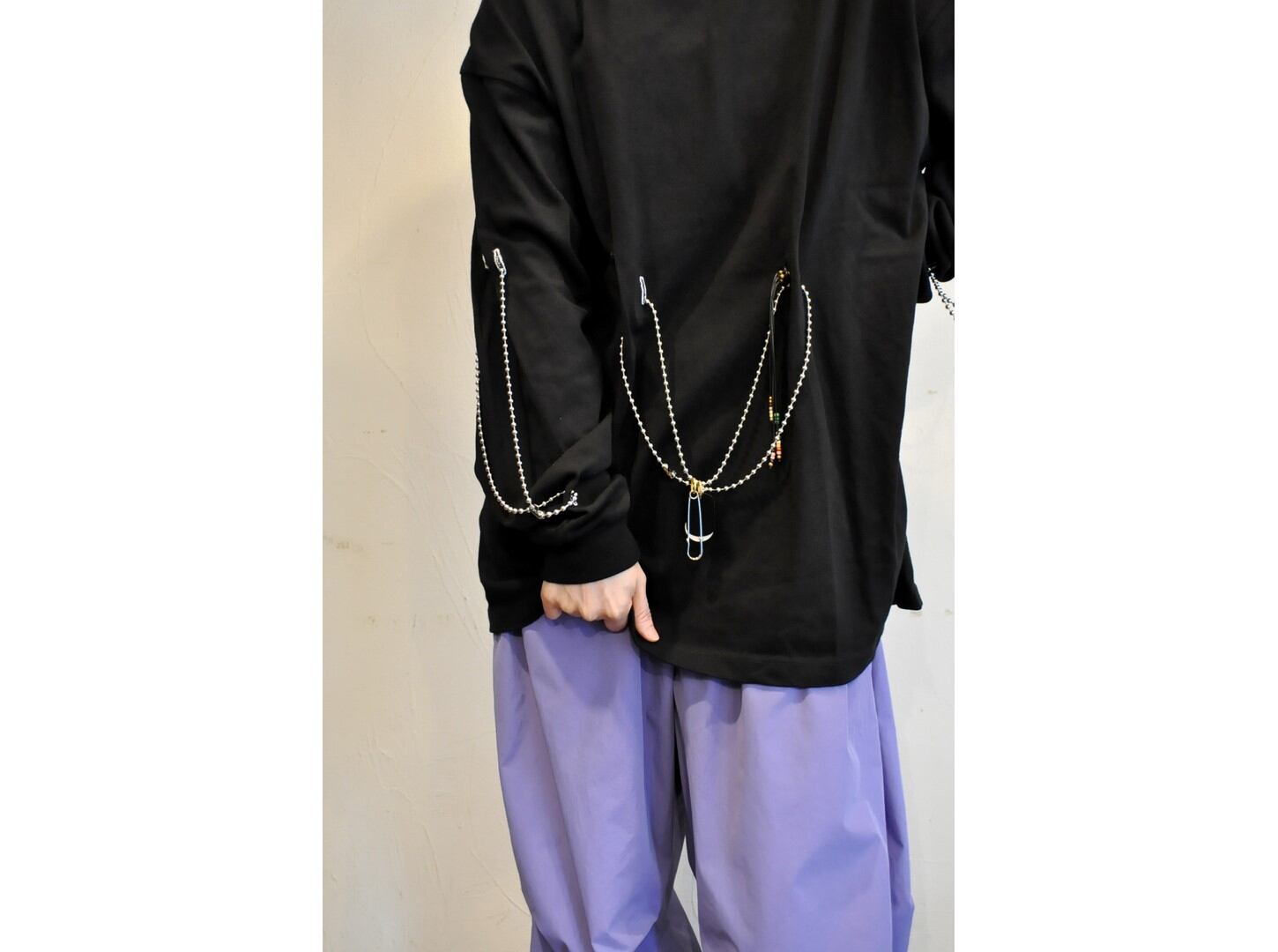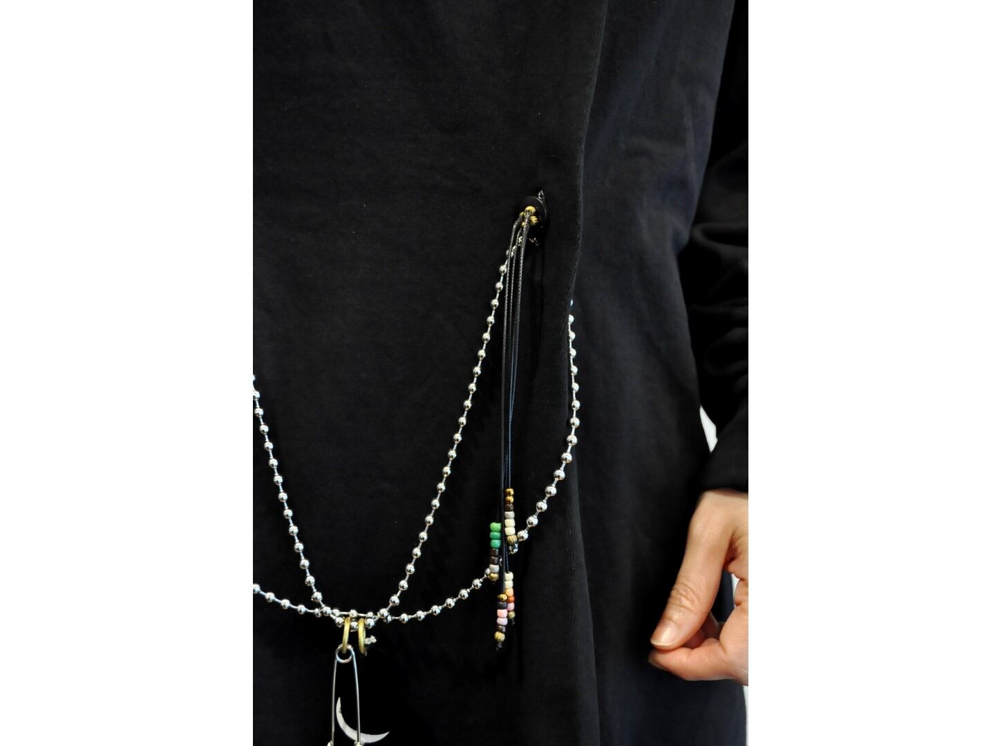 付属に着脱可能な、ヴィンテージのボタンとビーズ等の素材を組み合わせたパーツとボールチェーンが付いており、付け方を変えて色々な着方やアレンジが楽しめます。