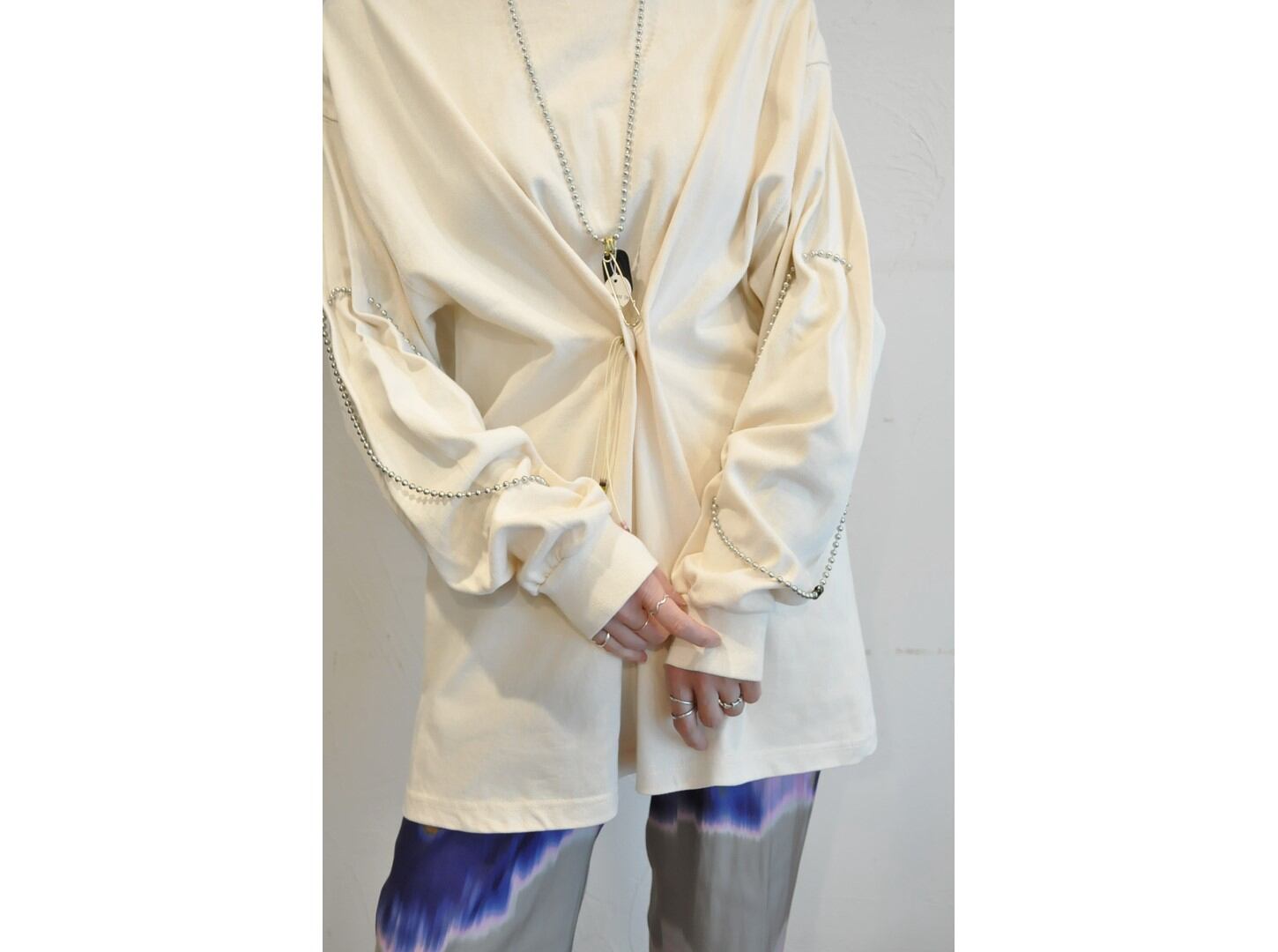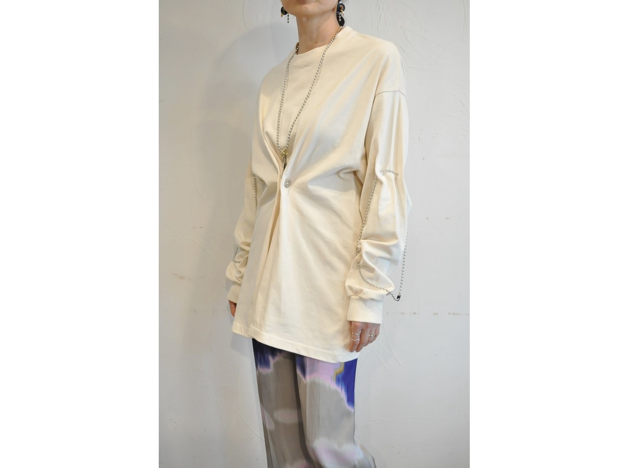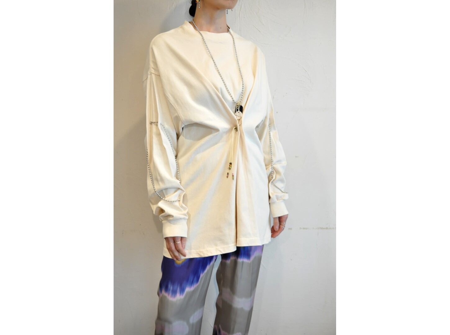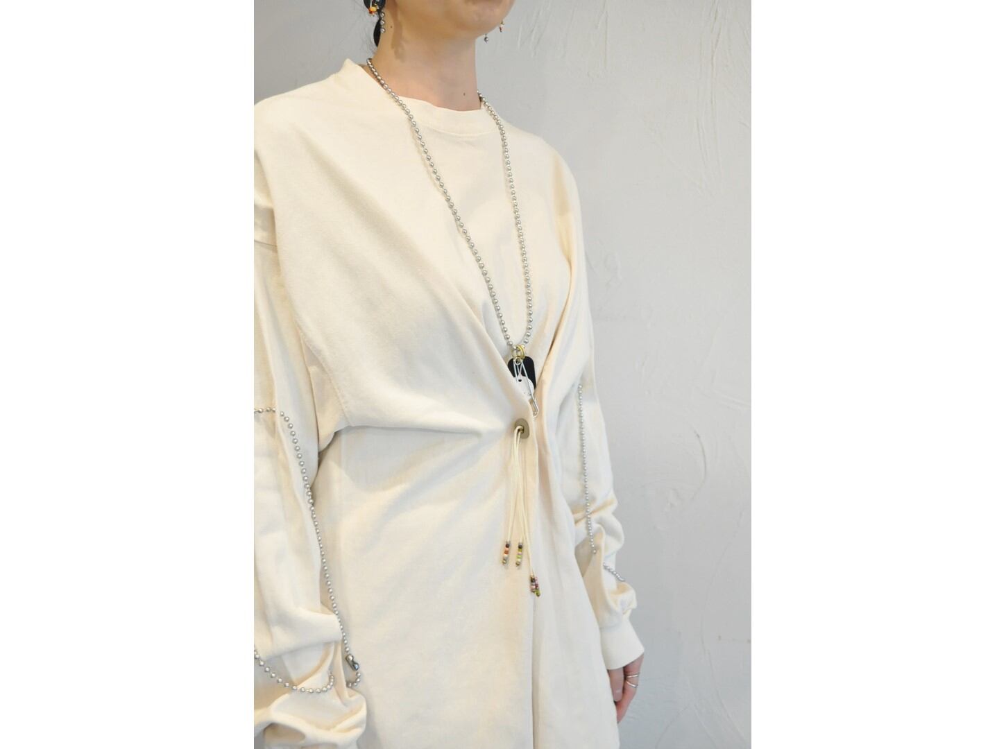 付属に着脱可能な、ヴィンテージのボタンとビーズ等の素材を組み合わせたパーツとボールチェーンが付いており、付け方を変えて色々な着方やアレンジが楽しめます。