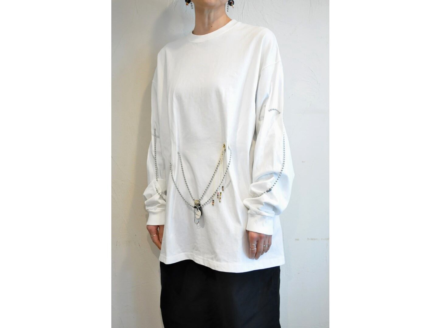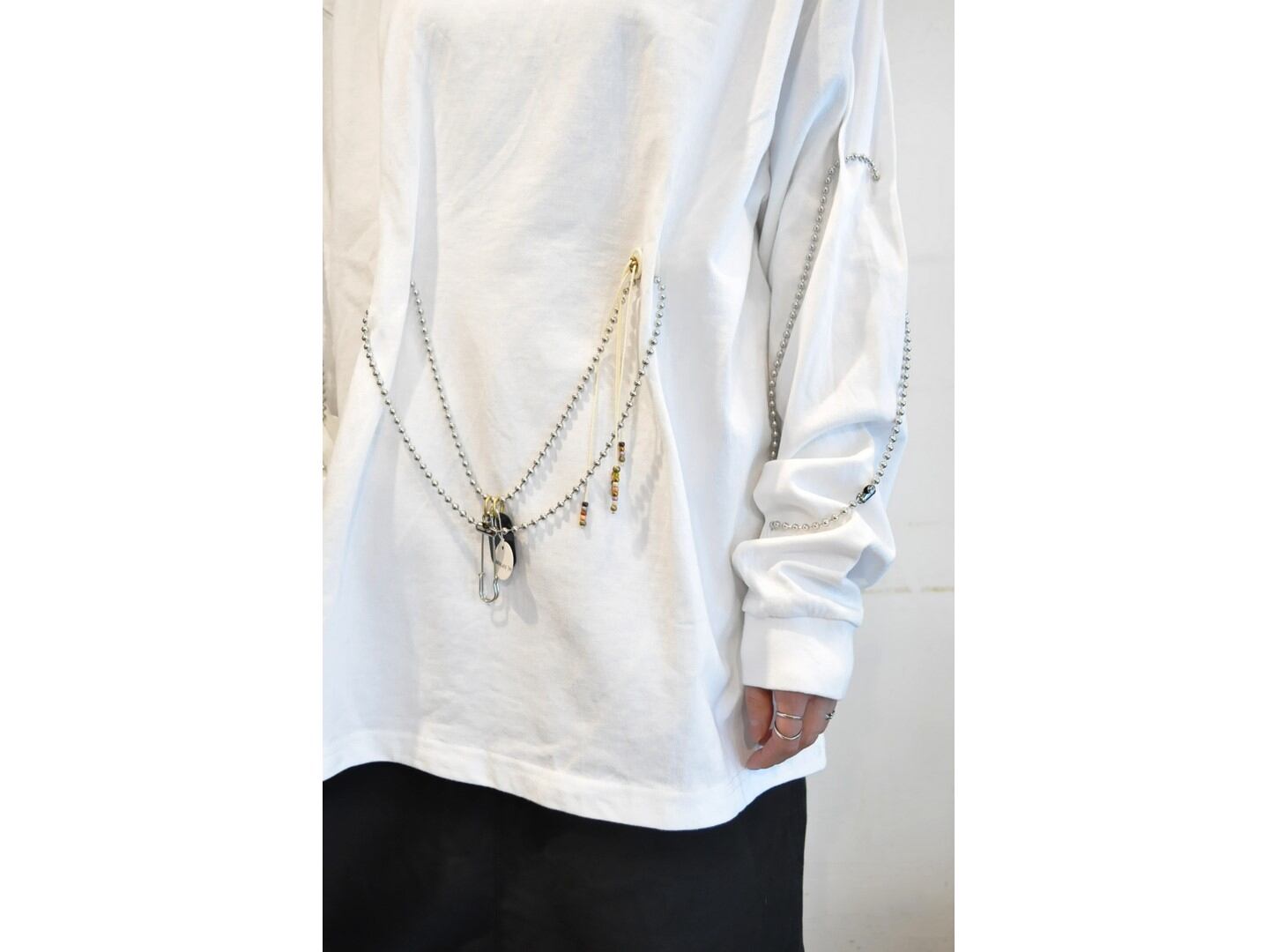 付属に着脱可能な、ヴィンテージのボタンとビーズ等の素材を組み合わせたパーツとボールチェーンが付いており、付け方を変えて色々な着方やアレンジが楽しめます。
