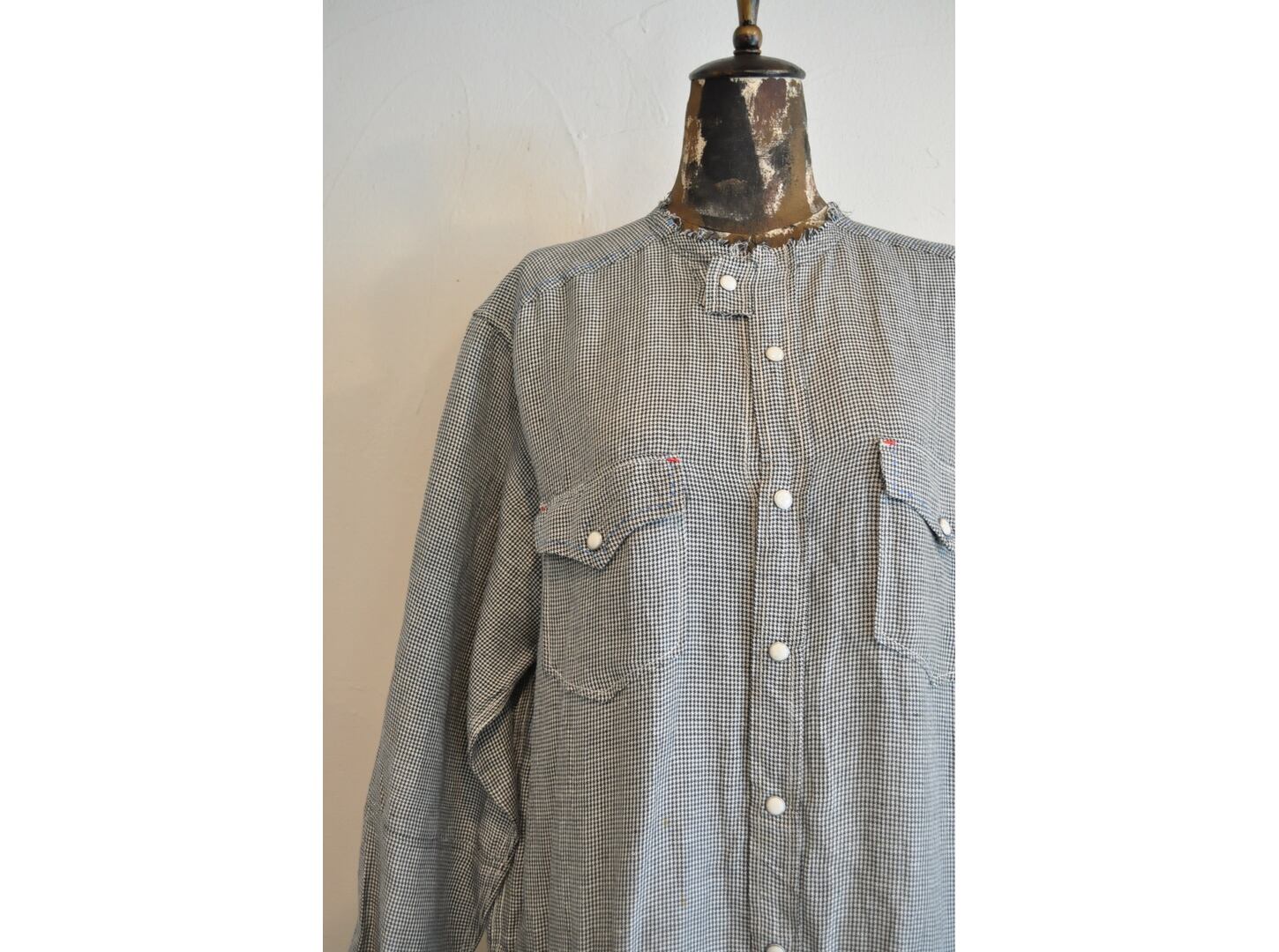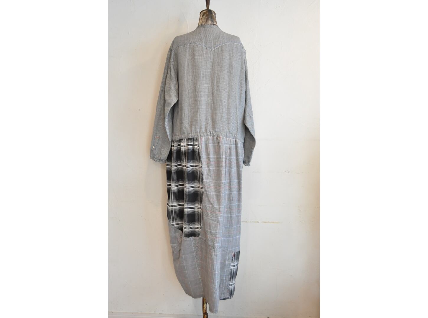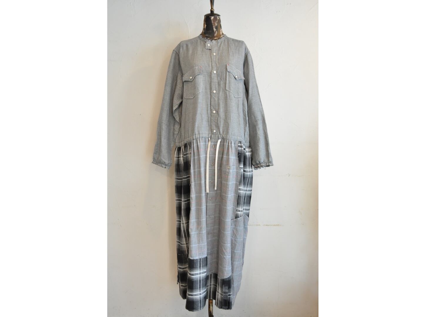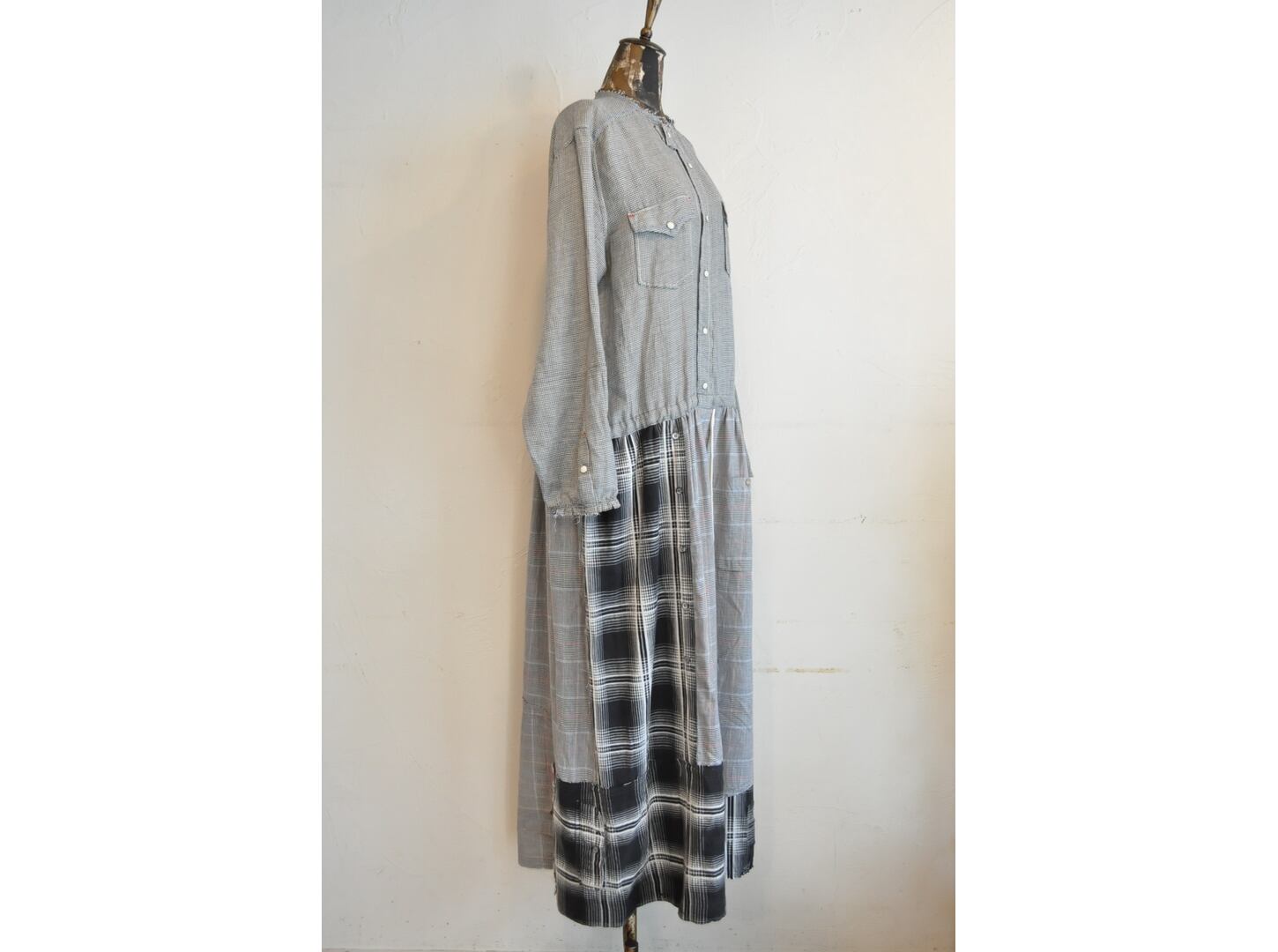 ●古着のシャツを使用して再構築したリメイクワンピース。