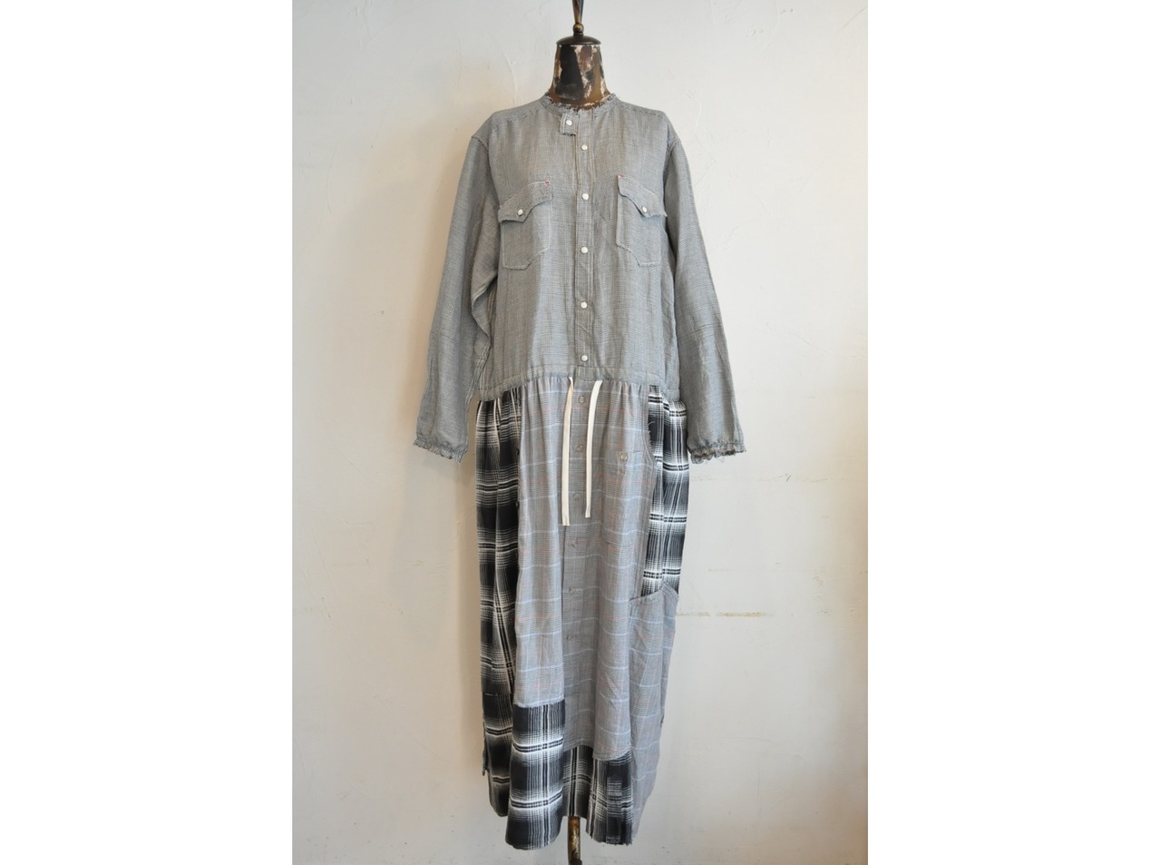 シャツならではのディテールを活かしつつ、ウエストの切り替えから下はパッチワークでボリュームを持たせています。