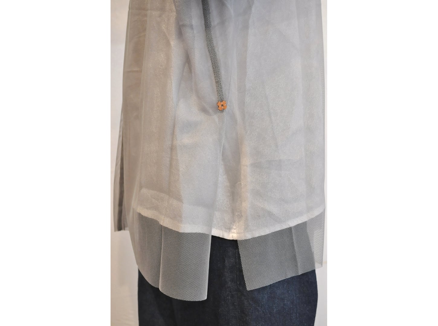 肩から袖にかけて施したドット柄のシアー素材がアクセントとなり、シンプルな中にもフェミニンな表情をプラス。