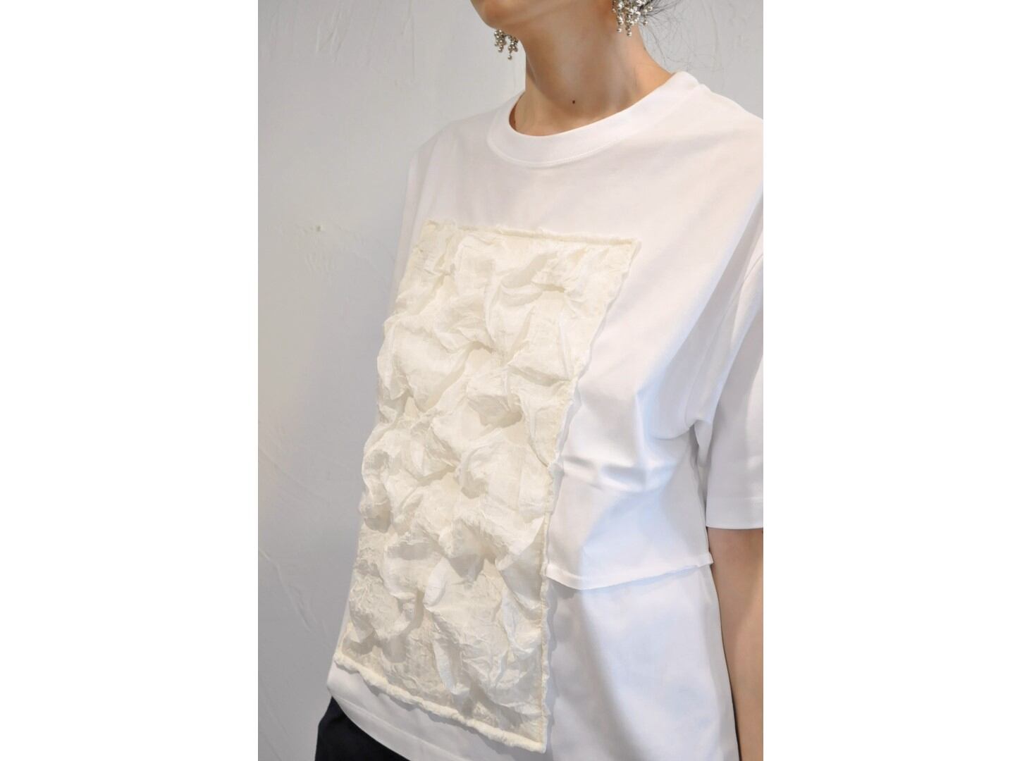 ●シンプルなTシャツのフロントに、立体的なモチーフのファブリックを縫い付けた、印象的なデザインTシャツ。