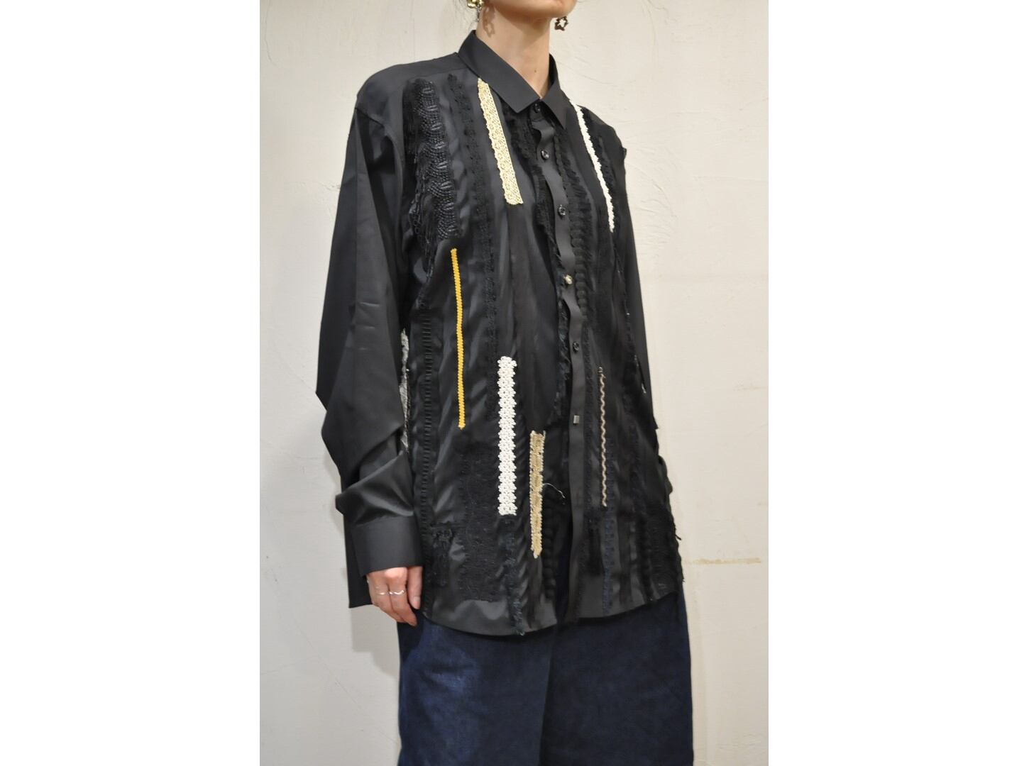 ●デザイナーがストックしていた希少な生地やヴィンテージのブレード・レースなど贅沢に使い装飾した、オーバーサイズのシャツ。